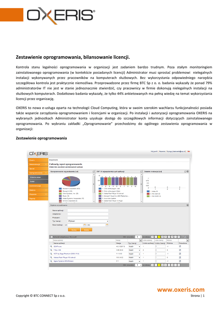 Zestawienie oprogramowania, bilansowanie licencji. Kontrola stanu legalności oprogramowania w organizacji jest zadaniem bardzo trudnym. Poza stałym monitoringiem zainstalowanego oprogramowania (w kontekście posiadanych licencji) Administrator musi sprostać problemowi nielegalnych instalacji wykonywanych przez pracowników na komputerach służbowych. Bez wykorzystania odpowiedniego narzędzia szczegółowa kontrola jest praktycznie niemożliwa. Przeprowadzone przez firmę BTC Sp z o. o. badania wykazały że ponad 79% administratorów IT nie jest w stanie jednoznacznie stwierdzić, czy pracownicy w firmie dokonują nielegalnych instalacji na służbowych komputerach. Dodatkowo badania wykazały, że tylko 44% ankietowanych ma pełną wiedzę na temat wykorzystania licencji przez organizację. OXERIS to nowa e-usługa oparta na technologii Cloud Computing, która w swoim szerokim wachlarzu funkcjonalności posiada także wsparcie zarządzania oprogramowaniem i licencjami w organizacji. Po instalacji i autoryzacji oprogramowania OXERIS na wybranych jednostkach Administrator konta uzyskuje dostęp do szczegółowych informacji dotyczących zainstalowanego oprogramowania. Po wybraniu zakładki „Oprogramowanie” przechodzimy do ogólnego zestawienia oprogramowania w organizacji: Zestawienie oprogramowania www.oxeris.com Copyright © BTC CONNECT Sp z o.o. Strona | 1 Widok oprogramowanie zawiera: a) Widgety przedstawiające ogólne informacje o zainstalowanym oprogramowaniu. b) Tabela z kryteriami wyszukiwania oprogramowania/urządzeń. c) Zestawienie zainstalowanego oprogramowania zawierające: Nazwę aplikacji, wersją aplikacji, edytowalny typ licencji (np. komercyjna, freeware, OEM, BOX itp.), ilość zainstalowanego na urządzeniach oprogramowania, ilość posiadanych licencji, różnice między zainstalowanym oprogramowaniem/posiadanymi licencjami. Dodatkowo przy każdej pozycji znajduje się check box służący do zaznaczania czy instalacja danej aplikacji jest dozwolona. Odznaczenie pola powoduje, że dana aplikacja staje się niedozwolona. W dziale „Oprogramowanie” można również znaleźć zakładkę „Audyt” w której można obejrzeć szczegółowe zestawienia oprogramowania z podziałem na firmy Adobe, Autodesk i Microsoft. Kontrola nad zmianami Wybierając na portalu zakładkę „Historia zmian” przechodzimy do widoku zawierającego szczegółowe informację na temat wszystkich zmian jakie zachodzą w stanie oprogramowania na urządzeniach na których zainstalowane jest oprogramowanie OXERIS. www.oxeris.com Copyright © BTC CONNECT Sp z o.o. Strona | 2 Zakładka „Historia zmian” zawiera: a) Wyszukiwarkę oprogramowania b) Informację o zmianach w oprogramowaniu – nazwa aplikacji, urządzenie na którym została zainstalowana, datę w której dokonała się zmiana, oraz rodzaj zmiany (instalacja, deinstalacja, aktualizacja) Powiadomienia i alerty System OXERIS posiada wbudowany system powiadomień i alertów dzięki którym na bieżąco informuje o wszelkich zmianach jakie zachodzą w stanie oprogramowania. OXERIS informuje m.in. o: a) b) c) d) Nowych instalacjach Deinstalacji oprogramowania Instalacji niedozwolonego oprogramowania Aktualizacjach W zakładce „Administaracja” -> „Konto” -> „Powiadomienia” można znaleźć zestawienie wszystkich powiadomień gdzie użytkownik może zadecydować czy chce je otrzymywać, czy nie. Raporty Aby wydrukować szczegółowe zestawienie dotyczące oprogramowania organizacji wystarczy przejść do zakładki „Raporty”. zainstalowanego na urządzeniach mobilnych w W zakładce znajdują się raporty dotyczące m.in.: a) b) c) d) e) Oprogramowanie zainstalowane na danej jednostce. Nazwa oprogramowania – urządzenia na których jest zainstalowane. Zestawienie oprogramowania – stan posiadanych licencji Zestawienie oprogramowania firm Adobe, Autodesk, Microsoft. Zestawienie systemów operacyjnych. Po wyborze odpowiedniego raportu otrzymujemy szczegółowe zestawienie które gotowe jest do wydruku. Z przykładowymi raportami generowanymi za pomocą OXERIS można zapoznać się na stronie www.oxeris.com w zakładce „Do pobrania”. Dzięki OXERIS można m.in.: a) Na bieżąco kontrolować stan oprogramowania w organizacji. www.oxeris.com Copyright © BTC CONNECT Sp z o.o. Strona | 3 b) Przeprowadzić wewnętrzną kontrolę legalności oprogramowania. c) Lepiej planować zakup/upgrade oprogramowania. www.oxeris.com Copyright © BTC CONNECT Sp z o.o. Strona | 4
