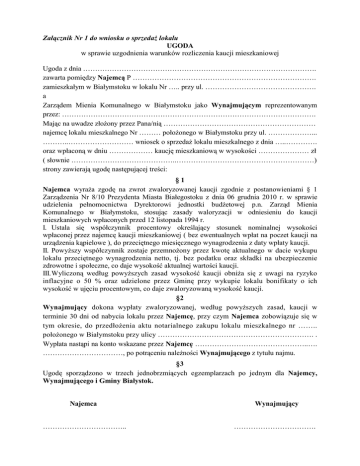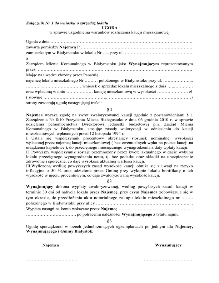 Załącznik Nr 1 do wniosku o sprzedaż lokalu UGODA w sprawie uzgodnienia warunków rozliczenia kaucji mieszkaniowej Ugoda z dnia ……………………………………………………………………………………. zawarta pomiędzy Najemcą P …………………………………………………………………. zamieszkałym w Białymstoku w lokalu Nr ….. przy ul. ………………………………………. a Zarządem Mienia Komunalnego w Białymstoku jako Wynajmującym reprezentowanym przez: ……………………………………………………………………………………………. Mając na uwadze złożony przez Pana/nią ……………………………………………………… najemcę lokalu mieszkalnego Nr ……… położonego w Białymstoku przy ul. ………………... ………..……………………… wniosek o sprzedaż lokalu mieszkalnego z dnia …..…………. oraz wpłaconą w dniu ……………… kaucję mieszkaniową w wysokości ………………… zł ( słownie ……………………………………..…………………………………………………) strony zawierają ugodę następującej treści: §1 Najemca wyraża zgodę na zwrot zwaloryzowanej kaucji zgodnie z postanowieniami § 1 Zarządzenia Nr 8/10 Prezydenta Miasta Białegostoku z dnia 06 grudnia 2010 r. w sprawie udzielenia pełnomocnictwa Dyrektorowi jednostki budżetowej p.n. Zarząd Mienia Komunalnego w Białymstoku, stosując zasady waloryzacji w odniesieniu do kaucji mieszkaniowych wpłaconych przed 12 listopada 1994 r. I. Ustala się współczynnik procentowy określający stosunek nominalnej wysokości wpłaconej przez najemcę kaucji mieszkaniowej ( bez ewentualnych wpłat na poczet kaucji na urządzenia kąpielowe ), do przeciętnego miesięcznego wynagrodzenia z daty wpłaty kaucji. II. Powyższy współczynnik zostaje przemnożony przez kwotę aktualnego w dacie wykupu lokalu przeciętnego wynagrodzenia netto, tj. bez podatku oraz składki na ubezpieczenie zdrowotne i społeczne, co daje wysokość aktualnej wartości kaucji. III. Wyliczoną według powyższych zasad wysokość kaucji obniża się z uwagi na ryzyko inflacyjne o 50 % oraz udzielone przez Gminę przy wykupie lokalu bonifikaty o ich wysokość w ujęciu procentowym, co daje zwaloryzowaną wysokość kaucji. §2 Wynajmujący dokona wypłaty zwaloryzowanej, według powyższych zasad, kaucji w terminie 30 dni od nabycia lokalu przez Najemcę, przy czym Najemca zobowiązuje się w tym okresie, do przedłożenia aktu notarialnego zakupu lokalu mieszkalnego nr …….. położonego w Białymstoku przy ulicy ………………………………………………………. . Wypłata nastąpi na konto wskazane przez Najemcę ………………………………………..…. ……………………………, po potrąceniu należności Wynajmującego z tytułu najmu. §3 Ugodę sporządzono w trzech jednobrzmiących egzemplarzach po jednym dla Najemcy, Wynajmującego i Gminy Białystok. Najemca Wynajmujący …………………………….. …………………………….