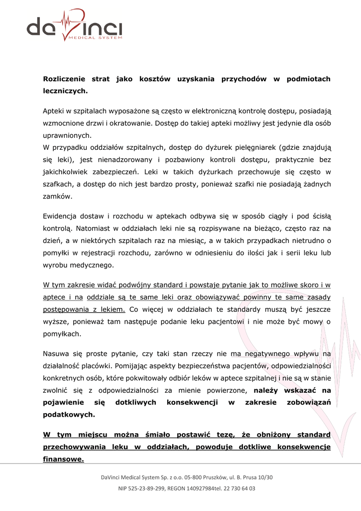 Rozliczenie strat jako kosztów uzyskania przychodów w podmiotach leczniczych. Apteki w szpitalach wyposażone są często w elektroniczną kontrolę dostępu, posiadają wzmocnione drzwi i okratowanie. Dostęp do takiej apteki możliwy jest jedynie dla osób uprawnionych. W przypadku oddziałów szpitalnych, dostęp do dyżurek pielęgniarek (gdzie znajdują się leki), jest nienadzorowany i pozbawiony kontroli dostępu, praktycznie bez jakichkolwiek zabezpieczeń. Leki w takich dyżurkach przechowuje się często w szafkach, a dostęp do nich jest bardzo prosty, ponieważ szafki nie posiadają żadnych zamków. Ewidencja dostaw i rozchodu w aptekach odbywa się w sposób ciągły i pod ścisłą kontrolą. Natomiast w oddziałach leki nie są rozpisywane na bieżąco, często raz na dzień, a w niektórych szpitalach raz na miesiąc, a w takich przypadkach nietrudno o pomyłki w rejestracji rozchodu, zarówno w odniesieniu do ilości jak i serii leku lub wyrobu medycznego. W tym zakresie widać podwójny standard i powstaje pytanie jak to możliwe skoro i w aptece i na oddziale są te same leki oraz obowiązywać powinny te same zasady postępowania z lekiem. Co więcej w oddziałach te standardy muszą być jeszcze wyższe, ponieważ tam następuje podanie leku pacjentowi i nie może być mowy o pomyłkach. Nasuwa się proste pytanie, czy taki stan rzeczy nie ma negatywnego wpływu na działalność placówki. Pomijając aspekty bezpieczeństwa pacjentów, odpowiedzialności konkretnych osób, które pokwitowały odbiór leków w aptece szpitalnej i nie są w stanie zwolnić się z odpowiedzialności za mienie powierzone, należy wskazać na pojawienie się dotkliwych konsekwencji w zakresie zobowiązań podatkowych. W tym miejscu można śmiało postawić tezę, że obniżony standard przechowywania leku w oddziałach, powoduje dotkliwe konsekwencje finansowe. DaVinci Medical System Sp. z o.o. 05-800 Pruszków, ul. B. Prusa 10/30 NIP 525-23-89-299, REGON 140927984tel. 22 730 64 03 Powyższe wynika z faktu, że w przypadku strat wykazanych remanentem (a straty są nieuniknione, jeśli nie stosuje się zasad przechowywania leku pod kontrolą), straty takie nie stanowią kosztu uzyskania przychodu podatkowego, a tym samym zwiększają podstawę opodatkowania podatkiem dochodowym od osób prawnych. Czy straty w lekach i wyrobach medycznych ujawnione w trakcie inwentaryzacji mogą stanowić koszty uzyskania przychodu? Co do zasady, szpital prowadzony w formie SPZOZ jest zwolniony z podatku dochodowego i wydaje się, że zagadnienia związane z podatkiem dochodowym od osób prawnych go nie dotyczą. Jednak tak nie jest. Szpital zwolniony jest z podatku, ale tylko w części kwot przeznaczonych na działalność statutową. Kwoty przeznaczone na pokrycie strat, nie mają związku z działalnością statutową, szpital przeznaczając więc środki na ten cel nie może ich wyłączyć z podstawy opodatkowania. Dodatkowo same straty nie stanowią kosztu uzyskania przychodu w sytuacji strat, którym można było zapobiec. Wracając do wykazanych na wstępie różnic pomiędzy apteką a oddziałem, należy zwrócić uwagę na fakt, że nic nie jest w stanie usprawiedliwić podwójnego standardu oraz oczywistym jest fakt, że stratom na oddziałach można zapobiec, stosując odpowiednie zabezpieczenie leków (wyrobów medycznych). Widać to również na podstawie remanentów. W przypadku aptek remanenty praktycznie strat nie wykazują, jednakże w przypadku oddziałów, tam właśnie remanenty wykazują straty. Skąd się bierze obowiązek inwentaryzacyjny? Ustawa o rachunkowości (art. 26 ust. 1) zobowiązuje jednostki do przeprowadzania inwentaryzacji minimum raz do roku, przynajmniej na ostatni dzień każdego roku obrotowego. Na skutek przeprowadzonego remanentu mogą się ujawnić ewentualne nadwyżki i niedobory w składnikach majątkowych podatnika. Nadwyżki inwentaryzacyjne - na podstawie art. 12 ust. 1 pkt 2 ustawy o podatku dochodowym od osób prawnych stanowią przychód podatkowy. W przypadku SPZOZ przychód pozornie zwolniony z opodatkowania, ale z drugiej strony, z uwagi na konieczność pokrycia strat w brakach opodatkowany (ponieważ jest to wydatek niezgodny z celem statutowym). W przypadku pozostałych placówek opodatkowany. DaVinci Medical System Sp. z o.o. 05-800 Pruszków, ul. B. Prusa 10/30 NIP 525-23-89-299, REGON 140927984tel. 22 730 64 03 W praktyce organów podatkowych i sądów administracyjnych wykształcił się pogląd, że charakter kosztowy mają wyłącznie takie straty, które są prawdziwe i dodatkowo nie są wynikiem zaniedbania podatnika, czy wręcz jego winy, a ich wystąpienie jest losowe, niezależne od woli podatnika i związane z normalnym i uzasadnionym jego działaniem. Dlatego też bardzo ważnym jest ustalenie racjonalnych procedur i dobór właściwych środków technicznych, które miałyby na celu zapobieganie powstawaniu niedoborów. Stosowanie podwójnego standardu w przechowywaniu leków i wyrobów medycznych, jednoznacznie wskazuje, że na oddziałach nie są stosowane ani procedury (brak odpowiedzialności za powierzone mienie pracowników, nierozliczanie osób kwitujących odbiór leków do oddziału), ani środki techniczne, zapobiegające powstawaniu niedoborów. Straty w środkach obrotowych, najczęściej są powodowane kradzieżami lub wcześniejszymi pomyłkami w zakresie rozpisywania leków. Możliwe jest zaliczenie ich do kosztów uzyskania przychodów jeśli nie są zawinione. W tym przypadku chodzi o zawinienie podatnika lub jego pracowników. Dodatkowo musi być spełniony warunek, że straty powstały pomimo zastosowanych środków prewencyjnych. W grupie środków prewencyjnych możemy wyróżnić np. szafy lekowe wyposażone w instalacje systemu alarmowego, monitoring oraz inne zabezpieczenia. Skoro straty nie można odliczyć jako kosztu uzyskania przychodu, a przeznaczonych na jej pokrycie środków nie można odliczyć od 
