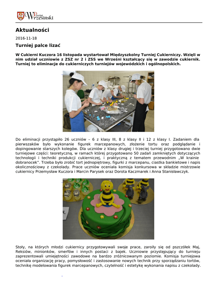 Aktualności 2016-11-18 Turniej palce lizać W Cukierni Kuczora 16 listopada wystartował Międzyszkolny Turniej Cukierniczy. Wzięli w nim udział uczniowie z ZSZ nr 2 i ZSS we Wrześni kształcący się w zawodzie cukiernik. Turniej to eliminacje do cukierniczych turniejów wojewódzkich i ogólnopolskich. Do eliminacji przystąpiło 26 uczniów – 6 z klasy III, 8 z klasy II i 12 z klasy I. Zadaniem dla pierwszaków było wykonanie figurek marcepanowych, złożenie tortu oraz podglądanie i dopingowanie starszych kolegów. Dla uczniów z klasy drugiej i trzeciej turniej przygotowano dwie turniejowe części: teoretyczną, w ramach której przygotowano 50 zadań zamkniętych dotyczących technologii i techniki produkcji cukierniczej, i praktyczną z tematem przewodnim „W krainie dobranocek”. Trzeba było zrobić tort jednopiętrowy, figurki z marcepanu, ciastka bankietowe i napis okolicznościowy z czekolady. Prace uczniów oceniała komisja konkursowa w składzie mistrzowie cukiernicy Przemysław Kuczora i Marcin Parysek oraz Dorota Kaczmarek i Anna Stanisławczyk. Stoły, na których młodzi cukiernicy przygotowywali swoje prace, zaroiły się od pszczółek Maj, Reksiów, minionków, smerfów i innych postaci z bajek. Uczniowie przystępujący do turnieju zaprezentowali umiejętności zawodowe na bardzo zróżnicowanym poziomie. Komisja turniejowa oceniała organizację pracy, pomysłowość i zastosowanie nowych technik przy sporządzaniu tortów, technikę modelowania figurek marcepanowych, czytelność i estetykę wykonania napisu z czekolady. Ostateczne wyniki turnieju: I miejsce Wiktoria Bączkiewicz kl. III kw praktyki Cukiernia Kuczora, II miejsce Adrianna Grodzka kl. III kw praktyki Cukiernia Cezar, III miejsce Renata Miłowska, kl. III kw praktyki Cukiernia Cezar. DK