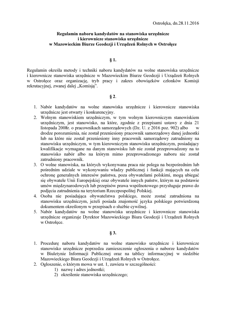 Ostrołęka, dn.28.11.2016 Regulamin naboru kandydatów na stanowiska urzędnicze i kierownicze stanowiska urzędnicze w Mazowieckim Biurze Geodezji i Urządzeń Rolnych w Ostrołęce § 1. Regulamin określa metody i techniki naboru kandydatów na wolne stanowiska urzędnicze i kierownicze stanowiska urzędnicze w Mazowieckim Biurze Geodezji i Urządzeń Rolnych w Ostrołęce oraz organizację, tryb pracy i zakres obowiązków członków Komisji rekrutacyjnej, zwanej dalej „Komisją”. § 2. 1. Nabór kandydatów na wolne stanowiska urzędnicze i kierownicze stanowiska urzędnicze jest otwarty i konkurencyjny. 2. Wolnym stanowiskiem urzędniczym, w tym wolnym kierowniczym stanowiskiem urzędniczym, jest stanowisko, na które, zgodnie z przepisami ustawy z dnia 21 listopada 2008r. o pracownikach samorządowych (Dz. U. z 2016 poz. 902) albo w drodze porozumienia, nie został przeniesiony pracownik samorządowy danej jednostki lub na które nie został przeniesiony inny pracownik samorządowy zatrudniony na stanowisku urzędniczym, w tym kierowniczym stanowisku urzędniczym, posiadający kwalifikacje wymagane na danym stanowisku lub nie został przeprowadzony na to stanowisko nabór albo na którym mimo przeprowadzonego naboru nie został zatrudniony pracownik. 3. O wolne stanowiska, na których wykonywana praca nie polega na bezpośrednim lub pośrednim udziale w wykonywaniu władzy publicznej i funkcji mających na celu ochronę generalnych interesów państwa, poza obywatelami polskimi, mogą ubiegać się obywatele Unii Europejskiej oraz obywatele innych państw, którym na podstawie umów międzynarodowych lub przepisów prawa wspólnotowego przysługuje prawo do podjęcia zatrudnienia na terytorium Rzeczpospolitej Polskiej. 4. Osoba nie posiadająca obywatelstwa polskiego, może zostać zatrudniona na stanowisku urzędniczym, jeżeli posiada znajomość języka polskiego potwierdzoną dokumentem określonym w przepisach o służbie cywilnej. 5. Nabór kandydatów na wolne stanowiska urzędnicze i kierownicze stanowiska urzędnicze organizuje Dyrektor Mazowieckiego Biura Geodezji i Urządzeń Rolnych w Ostrołęce. § 3. 1. Procedurę naboru kandydatów na wolne stanowisko urzędnicze i kierownicze stanowisko urzędnicze poprzedza zamieszczenie ogłoszenia o naborze kandydatów w Biuletynie Informacji Publicznej oraz na tablicy informacyjnej w siedzibie Mazowieckiego Biura Geodezji i Urządzeń Rolnych w Ostrołęce. 2. Ogłoszenie, o którym mowa w ust. 1, zawiera w szczególności: 1) nazwę i adres jednostki; 2) określenie stanowiska urzędniczego; 3) określenie wymagań związanych ze stanowiskiem urzędniczym zgodnie z opisem danego stanowiska, ze wskazaniem, które z nich są niezbędne, a które są dodatkowe; 4) wskazanie zakresu zadań wykonywanych na stanowisku urzędniczym; 5) wskazanie wymaganych dokumentów; 6) określenie terminu i miejsca składania dokumentów. 3. Termin do składania dokumentów określony w ogłoszeniu o naborze, nie może być krótszy niż 10 dni od dnia opublikowania tego ogłoszenia w Biuletynie. § 4. 1. Po upływie terminu do złożenia dokumentów, określonego w ogłoszeniu o naborze, kierownik Działu Organizacyjno – Gospodarczego i Kadr odpowiedzialny za proces rekrutacji: 1) dokonuje selekcji ofert nadesłanych przez kandydatów w odpowiedzi na ogłoszenie, pod względem spełnienia przez nich wymogów formalnych określonych w ogłoszeniu o naborze na wolne stanowisko; 2) przygotowuje listę kandydatów, którzy spełniają wymagania formalne zamieszczone w ogłoszeniu o naborze na wolne stanowisko, a następnie podpisuje listę; 3) ustala w porozumieniu z dyrektorem termin i miejsce spotkania Komisji, a następnie powiadamia o tym kandydatów nie później niż na 2 dni przed terminem spotkania. 2. O terminie oraz miejscu przeprowadzenia testu i rozmowy kwalifikacyjnej kandydaci, którzy spełniają wymogi formalne, zostają poinformowani telefonicznie lub poprzez e-mail. § 5. 1. W skład Komisji rekrutacyjnej na wolne stanowisko urzędnicze i kierownicze stanowisko urzędnicze mogą wchodzić : 1) Dyrektor 2) kierownik lub pracownik działu Organizacyjno – Gospodarczego i Kadr odpowiedzialny za proces rekrutacji; 3) kierownik działu/oddziału, który wnioskował o rekrutację lub upoważniony przez niego pracownik; 4) wyznaczony przez dyrektora pracownik Biura. 2. Skład Komisji może zostać powiększony o drugiego pracownika działu/oddziału, który wnioskował o rekrutację 3. Skład Komisji rekrutującej na wolne stanowisko urzędnicze i kierownicze stanowisko urzędnicze zatwierdza Dyrektor Mazowieckiego Biura Geodezji i Urządzeń Rolnych w Ostrołęce. 4. Do skuteczności podejmowanych przez Komisję czynności, wymagana jest obecność przynajmniej 3 członków. 5. Osoby biorące udział w posiedzeniu Komisji składają oświadczenie , zgodnie ze wzorem określonym w załączniku nr 1 do Regulaminu. § 6. 1. Do zadań Komisji należy przeprowadzenie postępowania kwalifikacyjnego celem wyłonienia najlepszego kandydata na wolne stanowisko urzędnicze/kierownicze stanowisko urzędnicze. 2. Członkowie Komisji wykonują powierzone im czynności w dobrej wierze, z zachowaniem najwyższej staranności, kierując się wyłącznie przepisami prawa, swoją wiedzą oraz doświadczeniem. 3. Osoby biorące udział w posiedzeniu Komisji składają oświadczenie, zgodnie ze wzorem określonym w załączniku do Regulaminu. § 7. 1. Postępowanie kwalifikacyjne może być przeprowadzone w jednym lub w dwóch etapach. 1) test kwalifikacyjny; 2) rozmowa kwalifikacyjna. 2. W ramach pierwszego etapu przeprowadzany jest test dla wszystkich kandydatów spełniających wymagania formalne, według następujących zasad: 1) Za dobrą odpowiedź kandydat otrzymuje 1 pkt; 2) W przypadku braku odpowiedzi lub udzielenia nieprawidłowej odpowiedzi – 0 pkt; 3) Kandydat może uzyskać maksymalnie 10 pkt. 3. Kandydatów, którzy uzyskaj minimum 