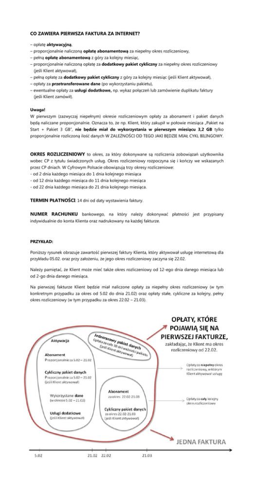 CO ZAWIERA PIERWSZA FAKTURA ZA INTERNET? – opłatę aktywacyjną, – proporcjonalnie naliczoną opłatę abonamentową za niepełny okres rozliczeniowy, – pełną opłatę abonamentową z góry za kolejny miesiąc, – proporcjonalnie naliczoną opłatę za dodatkowy pakiet cykliczny za niepełny okres rozliczeniowy (jeśli Klient aktywował), – pełną opłatę za dodatkowy pakiet cykliczny z góry za kolejny miesiąc (jeśli Klient aktywował), – opłaty za przetransferowane dane (po wykorzystaniu pakietu), – ewentualne opłaty za usługi dodatkowe, np. wykaz połączeń lub zamówienie duplikatu faktury (jeśli Klient zamówił). Uwaga! W pierwszym (zazwyczaj niepełnym) okresie rozliczeniowym opłaty za abonament i pakiet danych będą naliczane proporcjonalnie. Oznacza to, że np. Klient, który zakupił w połowie miesiąca „Pakiet na Start + Pakiet 3 GB”, nie będzie miał do wykorzystania w pierwszym miesiącu 3,2 GB tylko proporcjonalnie rozliczoną ilość danych W ZALEŻNOŚCI OD TEGO JAKI BĘDZIE MIAŁ CYKL BILINGOWY. OKRES ROZLICZENIOWY to okres, za który dokonywane są rozliczenia zobowiązań użytkownika wobec CP z tytułu świadczonych usług. Okres rozliczeniowy rozpoczyna się i kończy we wskazanych przez CP dniach. W Cyfrowym Polsacie obowiązują trzy okresy rozliczeniowe: - od 2 dnia każdego miesiąca do 1 dnia kolejnego miesiąca - od 12 dnia każdego miesiąca do 11 dnia kolejnego miesiąca - od 22 dnia każdego miesiąca do 21 dnia kolejnego miesiąca. TERMIN PŁATNOŚCI: 14 dni od daty wystawienia faktury. NUMER RACHUNKU bankowego, na który należy dokonywać płatności jest przypisany indywidualnie do konta Klienta oraz nadrukowany na każdej fakturze. PRZYKŁAD: Poniższy rysunek obrazuje zawartość pierwszej faktury Klienta, który aktywował usługę internetową dla przykładu 05.02. oraz przy założeniu, że jego okres rozliczeniowy zaczyna się 22.02. Należy pamiętać, że Klient może mieć także okres rozliczeniowy od 12-ego dnia danego miesiąca lub od 2-go dnia danego miesiąca. Na pierwszej fakturze Klient będzie miał naliczone opłaty za niepełny okres rozliczeniowy (w tym konkretnym przypadku za okres od 5.02 do dnia 21.02) oraz opłaty stałe, cykliczne za kolejny, pełny okres rozliczeniowy (w tym przypadku za okres 22.02 – 21.03). USŁUGA „LIMIT INTERNET” Usługa ta pozwala utrzymać wydatki na Internet pod pełną kontrolą – umożliwia ustalenie maksymalnego poziomu miesięcznego rachunku. Od 16.02.2010r. każdy Klient usługi internetowej CP ma aktywowaną usługę Limit Internet 150 zł. Jeżeli rachunek za Internet osiągnie 80% ustalonego limitu, na modem zostanie wysyłane powiadomienie SMS. Następny komunikat zostanie wysłany kiedy limit osiągnie 100%. Usługa Internet zostanie wtedy zablokowana. Na życzenie Klienta usługa ta może zostać dezaktywowana lub zmodyfikowana (z początkiem nowego okresu rozliczeniowego). Inne dostępne wartości to: 40zł, 70zł i 100zł. MODYFIKACJA: Zmiana limitu może nastąpić poprzez: - kontakt telefoniczny z COK (pod numerem telefonu 2222 i 699002222) - iCOK Jeżeli usługa została już zablokowana, a Abonent chce nadal z niej korzystać, może podwyższyć swój limit poprzez: - kontakt telefoniczny z COK (pod numerem telefonu 2222 i 699002222) - iCOK – korzystając z usługi „Limit+” (wartość doładowania zostanie doliczona do kolejnego rachunku). Wartości doładowań w usłudze Limit +: - 10 PLN (środki do wykorzystania przez 14 dni) - 25 PLN (środki do wykorzystania przez 30 dni) - 50 PLN (środki do wykorzystania przez 90 dni) - 100 PLN (środki do wykorzystania przez 180 dni) DEZAKTYWACJA: Abonent może złożyć zlecenie dezaktywacji Usługi Limit Internet poprzez: - kontakt telefoniczny z COK (pod numerem telefonu 2222 i 699002222) - iCOK Dezaktywacja następuje w dowolnym momencie okresu rozliczeniowego (jeśli Abonent zleca jedynie dezaktywację usługi), lub z końcem Okresu rozliczeniowego (jeśli Abonent zleci aktywację innego Limitu). Do wartości ustanowionego limitu wliczają się: - opłata abonamentowa, - opłaty miesięczne z tytułu pakietów cyklicznych, - opłaty z tytułu zakupu pakietów jednorazowych, - opłaty bieżące korzystanie z usług, - opłaty za aktywację / modyfikację / dezaktywację usług. Szczegółowe informacje o usłudze dostępne są na stronie WWW Cyfrowego Polsatu w Regulaminie korzystania z usługi promocyjnej „Limit Internet”.