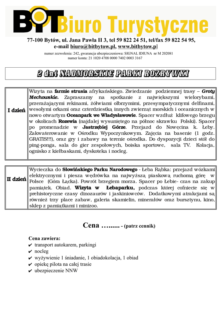 77-100 Bytów, ul. Jana Pawła II 3, tel 59 822 24 51, tel/fax 59 822 54 95, e-mail [email protected], www.bitbytow.pl numer zezwolenia: 242, gwarancja ubezpieczeniowa: SIGNAL IDIUNA nr M 202081 numer konta: 21 1020 4708 0000 7402 0003 3167 2 dni NADMORSKIE PARKI ROZRYWKI Wizyta na farmie strusia afrykańskiego. Zwiedzanie podziemnej trasy – Groty Mechowskie. Zapraszamy na spotkanie z największymi wielorybami, przerażającymi rekinami, żółw iami olbrzymimi, przesympatycznymi delfinami, I dzień wesołymi orkami oraz czterdziestką innych zwierząt morskich i oceanicznych w nowo otwartym Oceanpark we Władysławowie. Spacer wzdłuż klifowego brzegu w okolicach Rozewia (najdalej wysuniętego na północ skraw ku Polski). Spacer po promenadzie w Jastrzębiej Górze. Przejazd do Nowęcina k. Łeby. Zakwaterowanie w Ośrodku Wypoczynkowym. Zajęcia na basenie (1 godz. GRATIS!!!), oraz gry i zabawy na terenie ośrodka. Do dyspozycji dzieci stół do ping-ponga, sala do gier zespołowych, boiska sportowe, sala TV. Kolacja, ognisko z kiełbaskami, dyskoteka i nocleg. Wycieczka do Słowińskiego Parku Narodowego - Łeba Rąbka: przejazd wózkami elektrycznymi i piesza wędrówka na najwyższą piaskową ruchomą górę w II dzień Polsce (Góra Łącka). Pow rót brzegiem morza. Spacer po Łebie- czas na zakup pamiątek. Obiad. Wizyta w Łebaparku, podczas której cofniecie się w prehistoryczne czasy dinozaurów i jaskiniowców. Dodatkowymi atrakcjami są również trzy place zabaw, galeria skamielin, minerałów oraz bursztynu, kino, sklep z pamiątkami i minizoo. Cena …...... - (patrz cennik) Cena zawiera: ✔ transport autokarem, parkingi ✔ nocleg ✔ wyżywienie 1 śniadanie, 1 obiadokolacja, 1 obiad ✔ opiekę pilota na całej trasie ✔ ubezpieczenie NNW