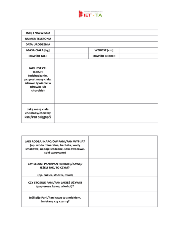 IMIĘ I NAZWISKO NUMER TELEFONU DATA URODZENIA MASA CIAŁA [kg] WZROST [cm] OBWÓD TALII OBWÓD BIODER JAKI JEST CEL TERAPII (odchudzanie, przyrost masy ciała, zdrowe żywienie w zdrowiu lub chorobie) Jaką masę ciała chciałaby/chciałby Pani/Pan osiągnąć? JAKI RODZAJ NAPOJÓW PANI/PAN WYPIJA? (np. woda mineralna, herbata, wody smakowe, napoje słodzone, soki owocowe, soki warzywne) CZY SŁODZI PANI/PAN HERBATĘ/KAWĘ? JEŻELI TAK, TO CZYM? (np. cukier, słodzik, miód) CZY STOSUJE PANI/PAN JAKIEŚ UŻYWKI (papierosy, kawa, alkohol)? Jeśli pije Pani/Pan kawę to z mlekiem, śmietaną czy czarną? PLAN DNIA (o której Pani/Pan wstaje, w jakich godzinach pracuje, o której ma Pani/Pan przerwę w pracy/szkole, jakie zajęcia po pracy, o której idzie Pani/Pan spać, jak wyglądają weekendy) ILE POSIŁKÓW DZIENNIE PANI/PAN SPOŻYWA? W JAKICH GODZINACH SPOŻYWA PANI/PAN POSIŁKI? ŚNIADANIE II ŚNIADANIE OBIAD PODWIECZOREK KOLACJA JAK OCENIA PANI/PAN SWOJĄ AKTYWNOŚĆ FIZYCZNĄ (jaki rodzaj aktywności, jak często, jak długo)? JAKI TYP PRACY PANI/PAN WYKONUJE (praca siedząca, praca fizyczna ciężka/lekka)? W jakich godzinach? CZY MA PANI/PAN MOŻLIWOŚĆ PRZYGOTOWANIA/PODGRZANIA POSIŁKU W PRACY/SZKOLE? CZY ZWRACA PANI/PAN UWAGĘ NA TO CO JE? CZY PLANUJE PANI/PAN POSIŁKI Z WYPRZEDZENIEM? KTO GOTUJE W DOMU? JAK CZĘSTO JADA PANI/PAN „NA MIEŚCIE” ULUBIONE PRODUKTY PRODUKTY KTÓRYCH PANI/PAN NIE LUBI JAKIE PRODUKTY PANI/PANU SZKODZĄ? (np. powodują zgagę, zaparcia, nadmierne odbijanie) JAKIE WARZYWA I OWOCE PANI/PAN SPOŻYWA? JAK CZĘSTO? CZY SPOŻYWA PANI/PAN KASZE? JAKI RODZAJ (jęczmienna, jaglana, kuskus, gryczana, manna)? JAK CZĘSTO? JAKI RODZAJ PIECZYWA PANI/PAN SPOŻYWA NAJCZĘŚCIEJ? CZYM PANI/PAN SMARUJE PIECZYWO? CZY SPOŻYWA PANI/PAN RYBY? JAK CZĘSTO? JAKI RODZAJ? CZY JE PANI/PAN MIĘSO? JAK CZĘSTO? JAKI RODZAJ? CZY SPOŻYWA PANI/PAN OWOCE MORZA? JAKIE? JAK CZĘSTO? CZY SPOŻYWA PANI/PAN PRODUKTY NABIAŁOWE? JAK CZĘSTO? CZY SPOŻYWA PANI/PAN NASIONA ROŚLIN STRĄCZKOWYCH (np. fasola, groch, soczewica, soja) JAKIE? JAK CZĘSTO? CZY SPOŻYWA PANI/PAN ZIEMNIAKI, RYŻ, KASZE Z SOSAMI CZY BEZ ICH DODATKU? JAKIE SOSY? JAKIE PRZYPRAWY PANI/PAN STOSUJE DO PRZYGOTOWYWANIA POTRAW? CZY SPOŻYWA PANI/PAN KETCHUP/MAJONEZ/SOS CZOSNKOWY LUB INNE SOSY? CZY LUBI PANI/PAN ZUPY? JAKIE TECHNIKI KULINARNE PANI/PAN STOSUJE (gotowanie, smażenie, gotowanie na parze, pieczenie, grillowanie)? CO ZWYCZAJOWO SPOŻYWA PANI/PAN NA: ŚNIADANIE II ŚNIADANIE OBIAD PODWIECZOREK KOLACJA CO SPOŻYWA PANI/PAN MIĘDZY POSIŁKAMI GŁÓWNYMI? JAK CZĘSTO? CZY JEST PANI W CIĄŻY? JEŻELI TAK, KTÓRY TYDZIEŃ? CZY KARMI PANI PIERSIĄ? CZY ZAUWAŻYŁA PANI NIETYPOWE OBJAWY U DZIECKA PO SPOŻYCIU WYBRANYCH POKARMÓW, JAKICH? CZY WYSTĘPUJĄ U PANI/PANA ALERGIE POKARMOWE? CZY WYSTĘPUJĄ U PANI/PANA JAKIEŚ JEDNOSTKI CHOROBOWE (np. cukrzyca, miażdżyca, nadciśnienie tętnicze, usunięty pęcherzyk żółciowy, choroba wrzodowa żołądka lub dwunastnicy)? WYNIKI BADAŃ KRWI (Uzupełnić lub załączyć do maila skan/zdjęcie posiadanych wyników) WYNIKI BADAŃ MOCZU Ciśnienie krwi Cholesterol całkowity Cholesterol LDL Cholesterol HDL Trójglicerydy Glukoza Hemoglobina (HGB) Erytrocyty (RBC) Hematokryt (HCT) MCV Inne (wpisać jakie) Cukier Białko Inne wyniki badań CZY STOSUJE PANI/PAN LEKI? JEŻELI TAK TO JAKIE? CZY STOSUJE PANI/PAN SUPLEMENTY? JEŻELI TAK TO JAKIE? UWAGA!!! Bardzo proszę o skrupulatne wypełnienie formularza, aby dieta była w pełni dopasowana do Państwa potrzeb Ważne jest, aby informacje podane w formularzu były zgodne ze stanem rzeczywistym. W przeciwnym wypadku dieta będzie nieskuteczna, a u osób chorych może prowadzić nawet do pogorszenia stanu zdrowia!! Warto dołączyć skany lub zdjęcia aktualnych wyników badań.