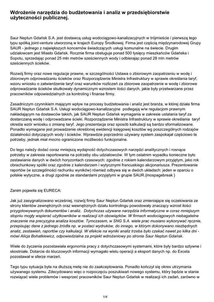 analiz, zestawień, raportów czy kalkulacji. W efekcie na wyniki analiz trzeba było czekać nawet po kilka dni mówi Alicja Bohatkiewicz, odpowiedzialna za projekt wdrożeniowy po stronie Saur Neptun Gdańsk.