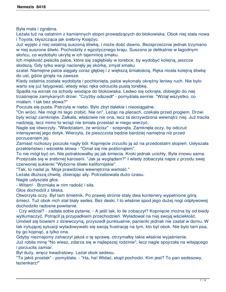 Nemezis 8418 Była mała i zgrabna. Leżała tuż na ostatnim z kamiennych stopni prowadzących do blokowiska. Obok niej stała nowa i Toyota, błyszcząca jak srebrny Księżyc. Już wyjęto z niej ostatnią suszoną śliwkę, i może dość dawno. Bezsprzecznie jednak trzymano w niej suszone śliwki. Pochodziły z egzotycznego kraju. Suszono je delikatnie w łagodnym słońcu, co wydobyło ukrytą w ich tajemnicę smaku. Ich miękkość pieściła palce, które się zagłębiały w torebce, by wydobyć kolejną, jeszcze słodszą. Gdy tylko wargi nacisnęły jej skórkę, zmysł smaku szalał. Namiętne palce sięgały coraz głębiej i z większą śmiałością. Ręka niosła kolejną śliwkę do ust, gdzie ginęła na zawsze. Kiedy ostatnia została wydobyta i pochłonięta, palce wykonały okrężny leniwy ruch. Nie było warto się już fatygować, wtedy więc ręka odrzuciła pustą torebkę. Spadła na wznak na schody wiodące do blokowiska. Ledwo się ocknęła, dobiegło do niej trzaśnięcie zamykanych drzwi. "Czyżby odszedł" - pomyślała sennie. "Wziął wszystko, co miałam. I tak bez słowa?" Poczuła się pusta. Patrzyła w niebo. Było zbyt dalekie i nieosiągalne. "On wróci. Nie mógł mi tego zrobić. Nie on". Leżąc na plecach, czekała przed progiem. Drzwi były wciąż zamknięte. Załkała, właściwie nie ona, lecz ta skrzywdzona wewnątrz niej. Już traciła nadzieję, lecz mimo to wciąż nie śmiała przestać w niego wierzyć. Nagle się otworzyły. "Wiedziałam, że wrócisz" - szepnęła. Zamknęła oczy, by odczuć intensywniej jego dotyk. Wierzyła, że pieszczota będzie bardziej namiętna niż przed porzuceniem jej. Zamiast rozkoszy poczuła nagły ból. Kopnięcie zrzuciło ją aż na przedostatni stopień. Usłyszała przekleństwo i wściekłe słowa - "Omal się nie pośliznąłem". To nie mógł być on. Nie potraktowałby jej jak śmiecia. Kroki jednak ucichły. Była znowu sama. Przejrzała się w srebrnej karoserii. "Jak ja wyglądam?" I wtedy zobaczyła napis z przodu swej czerwonej sukienki "Wyborne śliwki kalifornijskie". "Tak, to nadal ja. Moja prawdziwa wewnętrzna wartość." Leżała dłuższą chwilę, zbierając siły. Potrzebowała dużo czasu. Nagle usłyszała głos. - Witam! - Brzmiała w nim radość i siła. Głos dochodził z bliska. Otworzyła oczy. Był tam śmietnik. Po prawej stronie stały dwa kontenery wypełnione górą śmieci. Tuż obok nich stał biały sedes. Bez deski. I to właśnie spod jego dużej nogi odpływowej dochodziło radosne powitanie. - Czy widział? - zadała sobie pytanie. - A jeśli tak, to ile zobaczył? Kopnięcie można by od biedy wytłumaczyć. Potrącił ją przypadkiem przechodzień. Wyładował na niej swoją wściekłość. Umówił się bowiem z dziewczyną, przyszedł punktualnie, panienki jednak nie zastał w domu. W tak irytującej sytuacji wyładowywało się swoją frustrację na tym, kto był obok. Nie było tam psa, by go kopnąć, a tylko ona. Gdyby nieznajomy zahaczył jakoś o tę sprawę, otrzymałby takie właśnie wyjaśnienie. Już robiła minę "No wiesz, zdarza się w najlepszej rodzinie", lecz nagle spojrzała na witającego i porzuciła zamiar. Był duży, wręcz kwadratowy. Leżał obok sedesu. "To jakiś prostak" - pomyślała. - "Ha, ha! Widać, skąd pochodzi. Kim jest? To pan sedesowy, łazienkarz!" 1/4 Nemezis 8418 Choćby nie wiem jak, była skompromitowana, nie okaże po sobie żadnego zainteresowania. Właśnie podmuch popchnął go spod odpływowej nogi sedesu do leżącej tuż obok plastykowej siatki. Rzucił ją prosto na nią, zaczepił się więc jednym rogiem i tak trzymając się, oczekiwał reakcji damy. Czuł się jak marynarz na pokładzie jachtu, który w podmuchach silnego wiatru, uchwycił się ramieniem masztu i opierając się nawałnicy, uratuje swą wybrankę. "A jeśli widział wszystko, od samego początku? I nawet te powtarzające się akty namiętności? To miłosne pożeranie?" - zmartwiła się. Chciała mieć nadzieję na nową znajomość. Oglądanie jej w kompromitującej sytuacji zniszczyło jej aktywa. Nie wiedziała ani co myśleć, ani na co liczyć. Na wszelki jednak wypadek odpowiedziała - "I ja witam". Starała się, by odpowiedź brzmiała po prostu grzecznie, bez zachęty i niewymuszenie, ukrywające wstyd. Wietrzyk wczesnej jesieni pchnął go znowu bliżej. - A co to jest? - zapytała zaciekawiona. - Gdzie? - Tam, w tej reklamówce? Usiłował się obrócić, ale bez powodzenia, więc tylko zezował w bok. Zobaczył zawinięty w reklamówkę biały talerz z szlaczkiem wokół krawędzi i tuż obok stojące dwa kubeczki również ozdobione motywem z kwiatów. - Naczynia stołowe - odpowiedział nieco zdziwiony jej zainteresowaniem tymi przedmiotami. - Raczej chyba stara porcelana! - odrzekła z pewnością siebie. - Z pewnością bardzo cenna. - I już czując znany sobie temat, popłynęła. - Szlaczek wokół ich brzegu ma delikatny odcień świeżej zieleni, co zawsze kojarzy się z kwietniowym listowiem. Pijemy wręcz tę wiosenną świeżość. Proszę spojrzeć na kształt filiżanek. Wyrafinowana prostota! Nie są zbyt duże, ale również nie za małe. Ilość wlanej do nich kawy, akurat nas zaspokoi. Zamilkła i zamyśliła się, wyobrażając sobie poranną kawę podaną do łóżka w tej filiżance. Rzuciła po chwili spojrzenie na swego rozmówcę. Czy byłby zdolny do tak miłych gestów? Żółty jego kolor ujawniał w sobie ten nieznośny i tandetny odcień dolnej półki supermarketu, gdzie przylepiono napis "Najtańsze". - Nie pomyliłam się co do pochodzenia? - pomyślała wręcz zawiedziona. "Artystka!" - pomyślał. - Czy pracuje pani przy porcelanie? Może w fabryce? Chrząknęła i milczała chwilę, zastanawiając się nad odpowiedzią. - Pochodzę z zagranicy " odpowiedziała, starając się by nie zabrzmiało to jednak odpychająco. - No widzę. Podobno ładnie tam jest, ale drogo. - Stoją tam gł