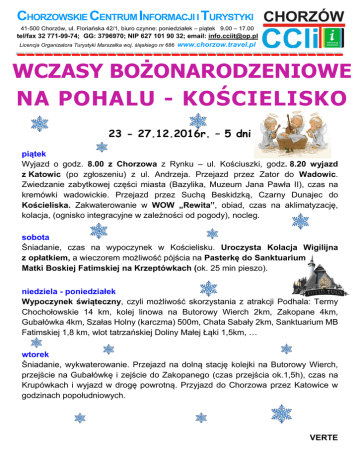 CHORZOWSKIE CENTRUM INFORMACJI I TURYSTYKI 41-500 Chorzów, ul. Floriańska 42/1, biuro czynne: poniedziałek – piątek 9.00 – 17.00 tel/fax 32 771-99-74; GG: 3796970; NIP 627 101 90 32; email: [email protected] Licencja Organizatora Turystyki Marszałka woj. śląskiego nr 686 www.chorzow.travel.pl WCZASY BOŻONARODZENIOWE NA POHALU - KOŚCIELISKO 23 - 27.12.2016r. – 5 dni piątek Wyjazd o godz. 8.00 z Chorzowa z Rynku – ul. Kościuszki, godz. 8.20 wyjazd z Katowic (po zgłoszeniu) z ul. Andrzeja. Przejazd przez Zator do Wadowic. Zwiedzanie zabytkowej części miasta (Bazylika, Muzeum Jana Pawła II), czas na kremówki wadowickie. Przejazd przez Suchą Beskidzką, Czarny Dunajec do Kościeliska. Zakwaterowanie w WOW „Rewita”, obiad, czas na aklimatyzację, kolacja, (ognisko integracyjne w zależności od pogody), nocleg. sobota Śniadanie, czas na wypoczynek w Kościelisku. Uroczysta Kolacja Wigilijna z opłatkiem, a wieczorem możliwość pójścia na Pasterkę do Sanktuarium Matki Boskiej Fatimskiej na Krzeptówkach (ok. 25 min pieszo). niedziela - poniedziałek Wypoczynek świąteczny, czyli możliwość skorzystania z atrakcji Podhala: Termy Chochołowskie 14 km, kolej linowa na Butorowy Wierch 2km, Zakopane 4km, Gubałówka 4km, Szałas Holny (karczma) 500m, Chata Sabały 2km, Sanktuarium MB Fatimskiej 1,8 km, wlot tatrzańskiej Doliny Małej Łąki 1,5km, … wtorek Śniadanie, wykwaterowanie. Przejazd na dolną stację kolejki na Butorowy Wierch, przejście na Gubałówkę i zejście do Zakopanego (czas przejścia ok.1,5h), czas na Krupówkach i wyjazd w drogę powrotną. Przyjazd do Chorzowa przez Katowice w godzinach popołudniowych. VERTE Świadczenia: transport autokarem w obie strony, pilot, przewodnik po Wadowicach i na Butorowy Wierch, 4 x noclegi w WOW „Rewita” (pok. 1-2-3 os., WC, łazienki, TV), śniadania (bufet), obiady, kolacje, bufet kawowy, uroczysta Kolacja Wigilijna z opłatkiem przy muzyce regionalnej, spotkanie ze Św. Mikołajem dla dzieci, program kulturalno – rozrywkowy: wieczorki taneczne z DJ-em, animacje dla dzieci (m.in. Bal Choinkowy), spotkanie z kosmetyczką i wizażystką, ubezpieczenie w Signal Iduna suma ubezpieczenia 5000 zł, opłata klimatyczna, ognisko integracyjne (w zależności od pogody), rabatowa Karta Tatrzańska. dorośli dzieci 3-10 lat do 3 lat w pok. 2 os.* w pok. 3 os. z rodzicami pełnopłatny 760 zł 580 zł 120 zł z rabatem 735 zł 565 zł 120 zł Koszt wyjazdu (czł. PTTK- skł. 2016r. i Karta Turysty CCIiT) *dopłata do pokoju 1 osobowego 150 zł Dodatkowe informacje: Koszt wyjazdu nie obejmuje ceny wstępu do zwiedzanych obiektów, przejazdu kolejką linową oraz korzystania z dodatkowych atrakcji jak Kulig z ogniskiem i kapelą góralską w cenie 50 zł. Wpisowe w wysokości 200 zł od uczestnika przy zapisie, rezerwacja telefoniczna miejsca na wyjeździe ważna do 4 dni roboczych, pozostała kwota na trzy tygodnie przed wyjazdem (w przypadku rezygnacji, zwrot zgodnie z Ogólnymi Warunkami Uczestnictwa w imprezach, które są dostępne w biurze CCIiT). O miejscu w autokarze decyduje data zapisu wraz wpłatą zaliczki za wycieczkę. Uczestnicy wchodzą do autokaru w takiej kolejności w jakiej dokonywali wpłat (dotyczy tylko wsiadania w Chorzowie), należy być 20 min przed podaną godziną wyjazdu. Nie ma możliwości wcześniejszej rezerwacji miejsc. Zapisy i informacji udziela biuro lub tel. 32 771 99 74 lub 502 46 38 28 *możliwość wpłaty na konto, po potwierdzeniu telefonicznym miejsca na wycieczce konto Deutsche Bank 12 1910 1048 2518 2100 8123 0001 z dopiskiem „Rewita”. Kompleks wypoczynkowo-szkoleniowy „Rewita Zakopane” w Kościelisku, zbudowany w latach 1898-1902, to nowoczesny zabytkowy i unikalny architektonicznie dom wczasowy. Ośrodek położony jest na rozległym terenie południowego stoku Gubałówki, zaledwie 4 km od centrum Zakopanego. Z jego okien rozciąga się malowniczy widok na Giewont i panoramę Tatr. Na terenie ośrodka dostępna jest sala dla dzieci, siłownia i Wi-Fi. Obiekt dostosowany jest do osób niepełnosprawnych. ZAPRASZAMY