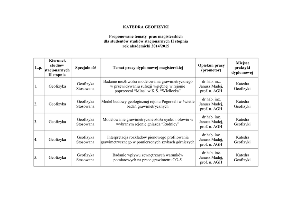 KATEDRA GEOFIZYKI Proponowane tematy prac