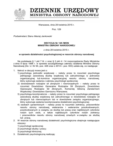 Warszawa, dnia 29 kwietnia 2015 r. Poz. 129 Podsekretarz Stanu Maciej Jankowski DECYZJA Nr 145 /MON MINISTRA OBRONY NARODOWEJ z dnia 28 kwietnia 2015 r. w sprawie działalności psychologicznej w resorcie obrony narodowej Na podstawie § 1 pkt 7 lit. c oraz § 2 pkt 4 i 14 rozporządzenia Rady Ministrów z dnia 9 lipca 1996 r. w sprawie szczegółowego zakresu działania Ministra Obrony Narodowej (Dz. U. Nr 94, poz. 426 oraz z 2014 r. poz. 933) ustala się, co następuje: 1. Ilekroć w decyzji mowa jest o: 1) psychologu jednostki wojskowej – należy przez to rozumieć psychologa pełniącego zawodową służbę wojskową lub zatrudnionego w jednostce organizacyjnej lub komórce organizacyjnej resortu obrony narodowej, który wykonuje zadania z zakresu psychologii społecznej; 2) dowództwach rodzajów sił zbrojnych i równorzędnych – należy przez to rozumieć Dowództwo Generalne Rodzajów Sił Zbrojnych, Dowództwo Operacyjne Rodzajów Sił Zbrojnych, Komendę Główną Żandarmerii Wojskowej i Dowództwo Garnizonu Warszawa; 3) psychologu-koordynatorze – należy przez to rozumieć psychologa pełniącego zawodową służbę wojskową lub zatrudnionego w dowództwie rodzajów sił zbrojnych lub równorzędnym lub w dowództwie związku organizacyjnego, który wykonuje zadania koordynowania działalności psychologicznej; 4) osobach uprawnionych – należy przez to rozumieć żołnierzy, pracowników resortu obrony narodowej, weteranów i weteranów poszkodowanych, poszkodowanych w związku ze służbą lub pracą oraz najbliższych członków rodzin tych osób, a także najbliższych członków rodzin żołnierzy i pracowników resortu obrony narodowej zmarłych w związku ze służbą lub pracą. 2. W resorcie obrony narodowej działalność psychologiczna obejmuje następujące obszary: 1) psychologii społecznej; 2) psychologii służby i pracy; 3) psychologii klinicznej. 3. Działalność psychologiczną realizują: 1 4. 5. 6. 7. 8. 9. 10. 11. 12. 13. 1) 2) 1) w obszarze psychologii społecznej – psychologowie jednostek wojskowych oraz psychologowie-koordynatorzy; 2) w obszarze psychologii służby i pracy – psychologowie wojskowych pracowni psychologicznych; 3) w obszarze psychologii klinicznej – psychologowie wojskowych instytutów medycznych, szpitali wojskowych, wojskowych szpitali uzdrowiskoworehabilitacyjnych oraz wojskowych specjalistycznych przychodni lekarskich. Nadzór nad działalnością psychologiczną sprawuje osoba zajmująca kierownicze stanowisko Ministerstwa Obrony Narodowej, właściwa do spraw społecznych, za pośrednictwem Dyrektora Departamentu Wojskowej Służby Zdrowia. Dyrektor Departamentu Wojskowej Służby Zdrowia przedstawia osobie zajmującej kierownicze stanowisko Ministerstwa Obrony Narodowej, właściwej do spraw społecznych, do dnia 30 marca każdego roku, roczną informację na temat działalności psychologicznej w resorcie obrony narodowej. Roczna informacja na temat działalności psychologicznej w resorcie obrony narodowej, o której mowa w pkt 5, stanowi źródło wiedzy dla potrzeb sprawozdawczości z działalności poszczególnych komórek organizacyjnych i jednostek organizacyjnych resortu obrony narodowej. Dyrektor Departamentu Wojskowej Służby Zdrowia wydaje specjalistyczne wytyczne do działalności psychologicznej w resorcie obrony narodowej. W zakresie wykonywania zawodu psycholog zachowuje samodzielność zgodnie z art. 2 ustawy z dnia 8 czerwca 2001 r. o zawodzie psychologa i samorządzie zawodowym psychologów (Dz. U. Nr 73, poz. 763 i Nr 154, poz. 1798 oraz z 2009 r. Nr 22, poz. 120 i Nr 92, poz. 753). Psychologowie realizujący zadania w obszarze psychologii społecznej uczestniczą w odprawach, analizowaniu i ocenianiu dyscypliny wojskowej, prognozowaniu zagrożeń dla dyscypliny oraz planowaniu i realizacji przedsięwzięć profilaktycznych w jednostce organizacyjnej i komórce organizacyjnej resortu obrony narodowej. Zasady działalności psychologicznej w resorcie obrony narodowej określa załącznik do decyzji. Rozkazy, wytyczne i inne dokumenty normatywne, dotyczące działalności psychologicznej, wydawane w dowództwach Rodzajów Sił Zbrojnych i równorzędnych, powinny być uzgadniane z Dyrektorem Departamentu Wojskowej Służby Zdrowia. Zakres i zasady wykonywania dodatkowych zadań psychologicznych, uwzględniających specyfikę działań Żandarmerii Wojskowej, określa, w drodze wytycznych, Komendant Główny Żandarmerii Wojskowej. Ustala się następującą podległość i podporządkowanie wojskowych pracowni psychologicznych: Centralna Wojskowa Pracownia Psychologiczna podlega Dyrektorowi Departamentu Wojskowej Służby Zdrowia - wraz z podporządkowanymi jej regionalnymi wojskowymi pracowniami psychologicznymi oraz wojskowymi pracowniami psychologicznymi; Centralnej Wojskowej Pracowni Psychologicznej podporządkowane są: a) Regionalna Wojskowa Pracownia Psychologiczna w Gdańsku, b) Regionalna Wojskowa Pracownia Psychologiczna w Krakowie, c) Regionalna Wojskowa Pracownia Psychologiczna w Poznaniu, 2 3) 4) 5) 6) 7) 14. 15. 16. d) Regionalna Wojskowa Pracownia Psychologiczna w Warszawie, e) Regionalna Wojskowa Pracownia Psychologiczna we Wrocławiu; Regionalnej Wojskowej Pracowni Psychologicznej w Gdańsku podporządkowane są: a) Wojskowa Pracownia Psychologiczna w Bydgoszczy, b) Wojskowa Pracownia Psychologiczna w Elblągu, c) Wojskowa Pracownia Psychologiczna w Ełku, d) Wojskowa Pracownia Psychologiczna w Gdyni, e) Pracownia Psychologiczna Gdynia w Gdańsku, f) Wojskowa Pracownia Psychologiczna w Olsztynie, g) Wojskowa Pracownia Psychologiczna w Słupsku, h) Wojskowa Pracownia Psychologiczna we Włocławku; Regionalnej Wojskowej Pracowni Psychologicznej w Krakowie podporządkowane są: a) Wojskowa Pracownia Psychologiczna w Częstochowie, b) Wojskowa Pracownia Psychologiczna w Kielcach, c) Wojskowa Pracownia Psychologiczna w Nowym Sączu, d) Wojskowa Pracownia Psychologiczna w Rzeszowie; R