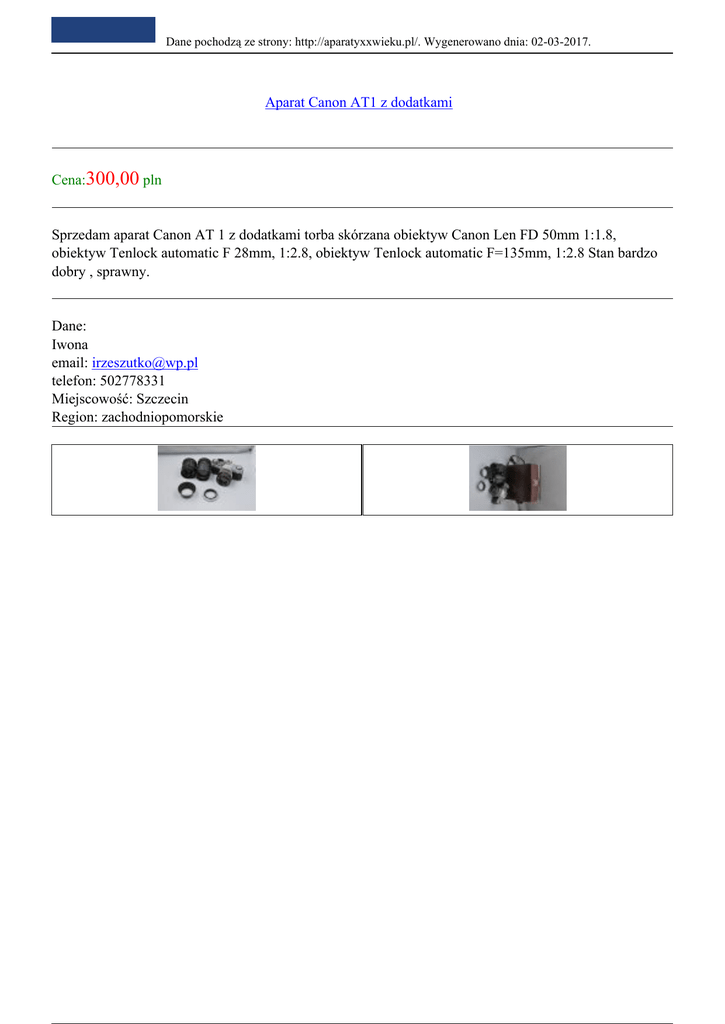Dane pochodzą ze strony: http://aparatyxxwieku.pl/. Wygenerowano dnia: 02-03-2017. Aparat Canon AT1 z dodatkami Cena:300,00 pln Sprzedam aparat Canon AT 1 z dodatkami torba skórzana obiektyw Canon Len FD 50mm 1:1.8, obiektyw Tenlock automatic F 28mm, 1:2.8, obiektyw Tenlock automatic F=135mm, 1:2.8 Stan bardzo dobry , sprawny. Dane: Iwona email: [email protected] telefon: 502778331 Miejscowość: Szczecin Region: zachodniopomorskie