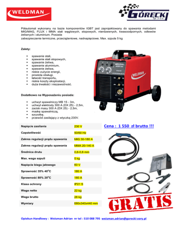 Półautomat wykonany na bazie komponentów IGBT jest zaprojektowany do spawania metodami MIG/MAG, FLUX i MMA stali węglowych, stopowych, nierdzewnych, kwasoodpornych, odlewów żeliwnych i aluminium. Posiada zabezpieczenie termiczne, przeciążeniowe, nadnapięciowe. Max. szpula 5 kg Zalety: spawanie stali, spawanie stali stopowych, spawanie żeliwa, spawanie aluminium, spawanie żeliwa, niskie zużycie energii, prostota obsługi, łatwość transportu, niskie koszty eksploatacji, duża trwałość i niezawodność. Dodatkowo na Wyposażeniu posiada: uchwyt spawalniczy MB 15 - 3m, uchwyt elektrody 300 A (DX 25) - 2,5m, zacisk masy 300 A (DX 25) - 2,5m, maskę spawalniczą, szczotkę, przewód zasilający z wtyczką 230V. Napięcie zasilania 230 V Częstotliwość 50/60 Hz Zakres regulacji prądu spawania MIG 30-180 A Zakres regulacji prądu spawania MMA 20-140 A Średnica drutu 0,6-0,8 mm Max. waga szpuli 5 kg Napięcie biegu jałowego 60 V o 180 A Sprawność 80% 20 C o 180 A Klasa ochrony IP21 S Waga netto 22 kg Waga brutto 28 kg Wymiary 680x340x440 mm Sprawność 35% 40 C Cena : 1 550 zł brutto !!! Opiekun Handlowy : Weisman Adrian nr tel : 510 088 795 [email protected] Najwyższej jakości spawarka (półautomat spawalniczy) inwerterowa WELDMAN MIDI MIG 220. Urządzenie umożliwia spawanie metodami MIG/MAG, a także elektroda otuloną MMA. Półautomat wykonany na bazie komponentów IGBT jest zaprojektowany do spawania metodami MIG/MAG i MMA stali węglowych, stopowych, nierdzewnych, kwasoodpornych, odlewów żeliwnych i aluminium. Wyświetlacz LCD wskazuje prąd spawania tylko w czasie pracy. Posiada zabezpieczenie termiczne, przeciążeniowe, nadnapięciowe. Max. szpula 5 kg SZCZEGÓŁOWY OPIS PRODUKTU Dane techniczne: Zasilanie 230V/50Hz Prąd spawania max 220A Płynna regulacja prądu spawania Średnica drutu 0,6-1,0mm Waga netto 19kg Waga brutto 20kg Wymiary 55x24x42cm Zalety: spawanie stali, spawanie stali stopowych, spawanie aluminium niskie zużycie energii, prostota obsługi, łatwość transportu, zwarta i lekka budowa, niskie koszty eksploatacji, duża trwałość i niezawodność. Cena : 1 230 zł brutto !!! Dodatkowo Zestaw zawiera: uchwyt spawalniczy MB 15 - 4 metry uchwyt elektrody 200 A (DX 25), przewód masowy z zaciskiem 200 A (DX 25), maskę spawalniczą, szczotkę, przewód zasilający z wtyczką 230V Opiekun Handlowy : Weisman Adrian nr tel : 510 088 795 [email protected]