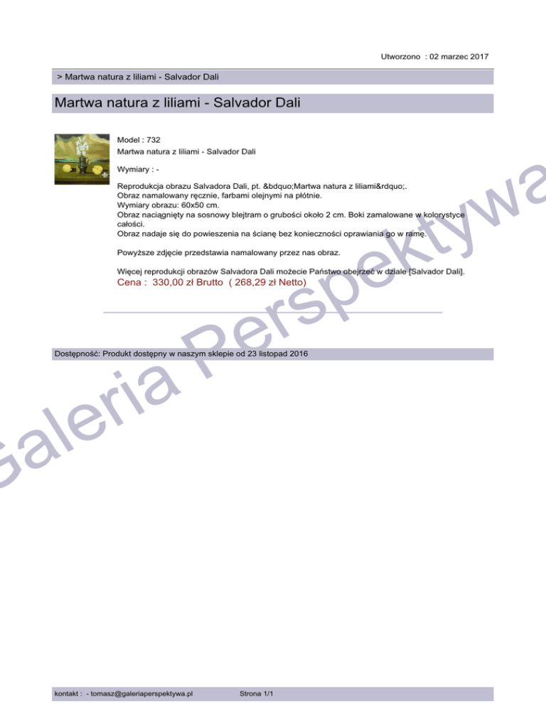 Utworzono : 02 marzec 2017 > Martwa natura z liliami - Salvador Dali Martwa natura z liliami - Salvador Dali Model : 732 Martwa natura z liliami - Salvador Dali a w ty Wymiary : - Reprodukcja obrazu Salvadora Dali, pt. „Martwa natura z liliami”. Obraz namalowany ręcznie, farbami olejnymi na płótnie. Wymiary obrazu: 60x50 cm. Obraz naciągnięty na sosnowy blejtram o grubości około 2 cm. Boki zamalowane w kolorystyce całości. Obraz nadaje się do powieszenia na ścianę bez konieczności oprawiania go w ramę. Powyższe zdjęcie przedstawia namalowany przez nas obraz. p rs k e Więcej reprodukcji obrazów Salvadora Dali możecie Państwo obejrzeć w dziale [Salvador Dali]. Cena : 330,00 zł Brutto ( 268,29 zł Netto) a i r e l a e P Dostępność: Produkt dostępny w naszym sklepie od 23 listopad 2016 G kontakt : - [email protected] Strona 1/1