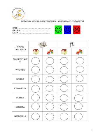 NOTATNIK LIDERA OSZCZĘDZANIA I KRASNALA ZŁOTÓWECZKI IMIĘ: ......................................... GRUPA:..................................... DATA:........................................ ☺ DZIEŃ TYGODNIA PONIEDZIAŁE K WTOREK ŚRODA CZWARTEK PIĄTEK SOBOTA NIEDZIELA 1 KARTA LIDERA OSZCZĘDZANIA W RAMACH DZIAŁAŃ EKOLOGICZNYCH ZWIĄZANYCH ZE ŚWIĘTEM ZIEMI Nauczyciel inicjuję rozmowę na temat „Notatnika Lidera Oszczędzania” i mówi, Ŝe Krasnal Złotóweczka jest przyjacielem przyrody i dlatego zaprasza wszystkie dzieci do akcji oszczędzania zasobów Ziemi takich jak – papier (las), woda. Nauczyciel wspólnie z dziećmi szuka moŜliwości i sposobów oszczędzania/ ochrony zasobów Ziemi. PAPIER Trzeba oszczędzać kartki, zbierać makulaturę, bo w ten sposób oszczędzamy drzewa, które trzeba byłoby ściąć aby wyprodukować nowy papier. Do wytworzenia 1 tony papieru potrzeba ściąć 17 drzew. Niepotrzebny papier i gazety to makulatura. MoŜna ją przetworzyć aŜ 7 razy. Proponowane działania dla dzieci: • wykorzystuj kartę z obu stron, • zbieraj makulaturę w przedszkolu, • w sposób przemyślany wykorzystuj powierzchnię kartki, • inne..... WODA Wszystko, co Ŝyje potrzebuje wody. śadna roślina i Ŝadne zwierzę, ani człowiek nie moŜe Ŝyć bez wody. Oszczędzanie wody jest obowiązkiem kaŜdego mieszkańca Ziemi. Proponowane działania dla dzieci, • korzystaj z przycisku „oszczędne spłukiwanie toalety”, • nie marnuj wody, • zakręcaj kran, gdy mydlisz dłonie lub szczotkujesz zęby, • upewnij się, Ŝe nie kapie woda kaŜdorazowo po skorzystaniu z łazienki, • inne........... INSTRUKCJA WYPEŁNIENIA TABELI Dziecko przez 7 dni codziennie w domu i w przedszkolu w odpowiednich rubrykach samodzielnie lub pod nadzorem osoby dorosłej rysuje minki buźkom. Samodzielnie ocenia swoje działania i uzasadnia wybór. JeŜeli w ciągu całego dnia dziecko pamiętało, aby wyrzucać śmieci do kosza, gasić zbędne oświetlenie, nie marnować wody i papieru, dbać o przyrodę itp. rysuje buźkę uśmiechniętą. JeŜeli czasami pamiętało o ustaleniach, a czasami robił to za nie ktoś inny. przedszkolak w odpowiedniej rubryce rysuje buźkę z prostymi ustami. JeŜeli dziecko zapominało o ustaleniach i inni musieli wykonywać za nie omawiane czynności - rysuje buźkę smutną. Po tygodniu, patrząc na tabelę, dzieci będą mogły przekonać się, jak duŜo zrobiły by oszczędzać zasoby i chronić środowisko naturalne. KaŜde z nich po rzetelnie wykonanym zadaniu otrzyma medal od Krasnala Złotóweczki i będzie nosić zaszczytny tytuł lidera Oszczędzania. Dzieci mogą samodzielnie go wyciąć i przykleić taśmą dwustronną do ubrań. Przedszkolaki swoje karty umieszczą w widocznym miejscu. 2 MEDAL LIDERA OSZĘDZANIA MEDAL Lidera Oszczędzania 3 NOTATNIK PRZYJACIELA PRZYRODY I KRASNALA ZŁOTÓWECZKI IMIĘ: ......................................... GRUPA:..................................... ☺ DATA:........................................ DZIEŃ TYGODNIA PONIEDZIAŁEK WTOREK ŚRODA CZWARTEK PIĄTEK SOBOTA NIEDZIELA KARTA PRZYJACIELA PRZYRODY W RAMACH DZIAŁAŃ EKOLOGICZNYCH ZWIĄZANYCH ZE ŚWIĘTEM ZIEMI 4 Nauczyciel inicjuję rozmowę na temat „Notatnika Przyjaciela Przyrody” mówi, Ŝe Krasnal Złotóweczka jest przyjacielem przyrody i dlatego zaprasza wszystkie dzieci do akcji oszczędzania zasobów Ziemi takich jak – energia, papier (las), woda, przyroda (istoty Ŝywe). Nauczyciel wspólnie z dziećmi szuka moŜliwości i sposobów oszczędzania/ ochrony zasobów Ziemi. ENERGIA ZłoŜa paliw kopalnych wciąŜ się kurczą, bo ludzie cały czas je wydobywają. Wkrótce moŜe zabraknąć nam węgla, ropy naftowej i gazu.. Dlatego bardzo waŜne jest oszczędzanie energii i korzystanie z jej odnawialnych źródeł – słońca, wody, wiatru i wody. Proponowane działania dla dzieci: Proponowane działania dla dzieci: • wyłączaj zbędne oświetlenie np. wychodząc z sali, pokoju, łazienki (gaś światło); • szybko zamykaj lodówkę; • wyłączaj z prądu urządzenia zostawione w trybie czuwania (czerwona dioda) np. komputer, telewizor itp.; • włącz się do akcji zbierania baterii; • inne.... PAPIER Trzeba oszczędzać kartki, zbierać makulaturę, bo w ten sposób oszczędzamy drzewa, które trzeba byłoby ściąć aby wyprodukować nowy papier. Do wytworzenia 1 tony papieru potrzeba ściąć 17 drzew. Niepotrzebny papier i gazety to makulatura. MoŜna ją przetworzyć aŜ 7 razy. Proponowane działania dla dzieci: • wykorzystuj kartę z obu stron; • zbieraj makulaturę w przedszkolu; • w sposób przemyślany wykorzystuj powierzchnię kartki • inne..... WODA Wszystko, co Ŝyje potrzebuje wody. śadna roślina i Ŝadne zwierzę, ani człowiek nie moŜe Ŝyć bez wody. Oszczędzanie wody jest obowiązkiem kaŜdego mieszkańca Ziemi. Proponowane działania dla dzieci: • korzystaj z przycisku „oszczędne spłukiwanie toalety”; • nie marnuj wody; • zakręcaj kran, gdy mydlisz dłonie lub szczotkujesz zęby; • upewnij się, Ŝe nie kapie woda kaŜdorazowo po skorzystaniu z łazienki; • inne........... PRZYRODA 5 KaŜda roślina, kaŜde zwierzę to Ŝywa istota. Jest potrzebna i poŜyteczna, dlatego teŜ trzeba ją chronić i szanować. Proponowane działania dla dzieci: • poznawaj przyrodę, by lepiej ją rozumieć i móc jej pomagać; • na spacerze papierki wyrzucaj do koszy na śmieci; • troszcz się o zwierzęta i pomagaj im, zwłaszcza zimą; • opiekuj się kwiatkami i zwierzętami domowymi; • segreguj śmieci – wyrzucaj śmieci do odpowiednich pojemników; • inne................... INSTRUKCJA WYPEŁNIENIA TABELI Dziecko przez 7 dni codziennie w domu i w przedszkolu w odpowiednich rubrykach samodzielnie lub pod nadzorem osoby dorosłej rysuje minki buźkom, zarysowując je odpowiednim kolorem kredki. Samodzielnie ocenia swoje działania i uzasadnia wybór. JeŜeli w ciągu c