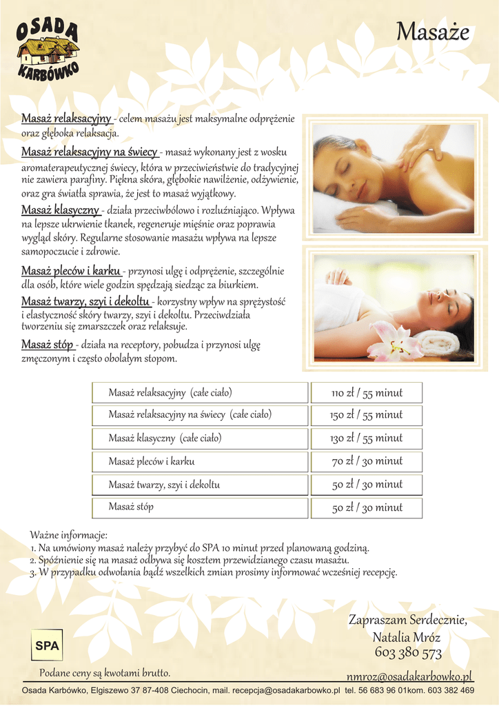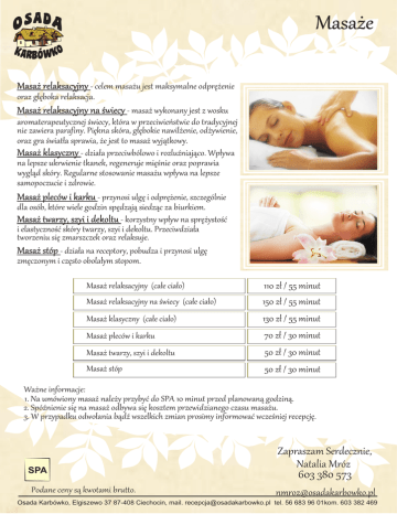 Masaże Masaż relaksacyjny - celem masażu jest maksymalne odprężenie oraz głęboka relaksacja. Masaż relaksacyjny na świecy - masaż wykonany jest z wosku aromaterapeutycznej świecy, która w przeciwieństwie do tradycyjnej nie zawiera parafiny. Piękna skóra, głębokie nawilżenie, odżywienie, oraz gra światła sprawia, że jest to masaż wyjątkowy. Masaż klasyczny - działa przeciwbólowo i rozluźniająco. Wpływa na lepsze ukrwienie tkanek, regeneruje mięśnie oraz poprawia wygląd skóry. Regularne stosowanie masażu wpływa na lepsze samopoczucie i zdrowie. Masaż pleców i karku - przynosi ulgę i odprężenie, szczególnie dla osób, które wiele godzin spędzają siedząc za biurkiem. Masaż twarzy, szyi i dekoltu - korzystny wpływ na sprężystość i elastyczność skóry twarzy, szyi i dekoltu. Przeciwdziała tworzeniu się zmarszczek oraz relaksuje. Masaż stóp - działa na receptory, pobudza i przynosi ulgę zmęczonym i często obolałym stopom. Masaż relaksacyjny (całe ciało) 110 zł / 55 minut Masaż relaksacyjny na świecy (całe ciało) 150 zł / 55 minut Masaż klasyczny (całe ciało) 130 zł / 55 minut Masaż pleców i karku 70 zł / 30 minut Masaż twarzy, szyi i dekoltu 50 zł / 30 minut Masaż stóp 50 zł / 30 minut Ważne informacje: 1. Na umówiony masaż należy przybyć do SPA 10 minut przed planowaną godziną. 2. Spóźnienie się na masaż odbywa się kosztem przewidzianego czasu masażu. 3. W przypadku odwołania bądź wszelkich zmian prosimy informować wcześniej recepcję. Zapraszam Serdecznie, Natalia Mróz 603 380 573 Podane ceny są kwotami brutto. [email protected] Osada Karbówko, Elgiszewo 37 87-408 Ciechocin, mail. [email protected] tel. 56 683 96 01kom. 603 382 469