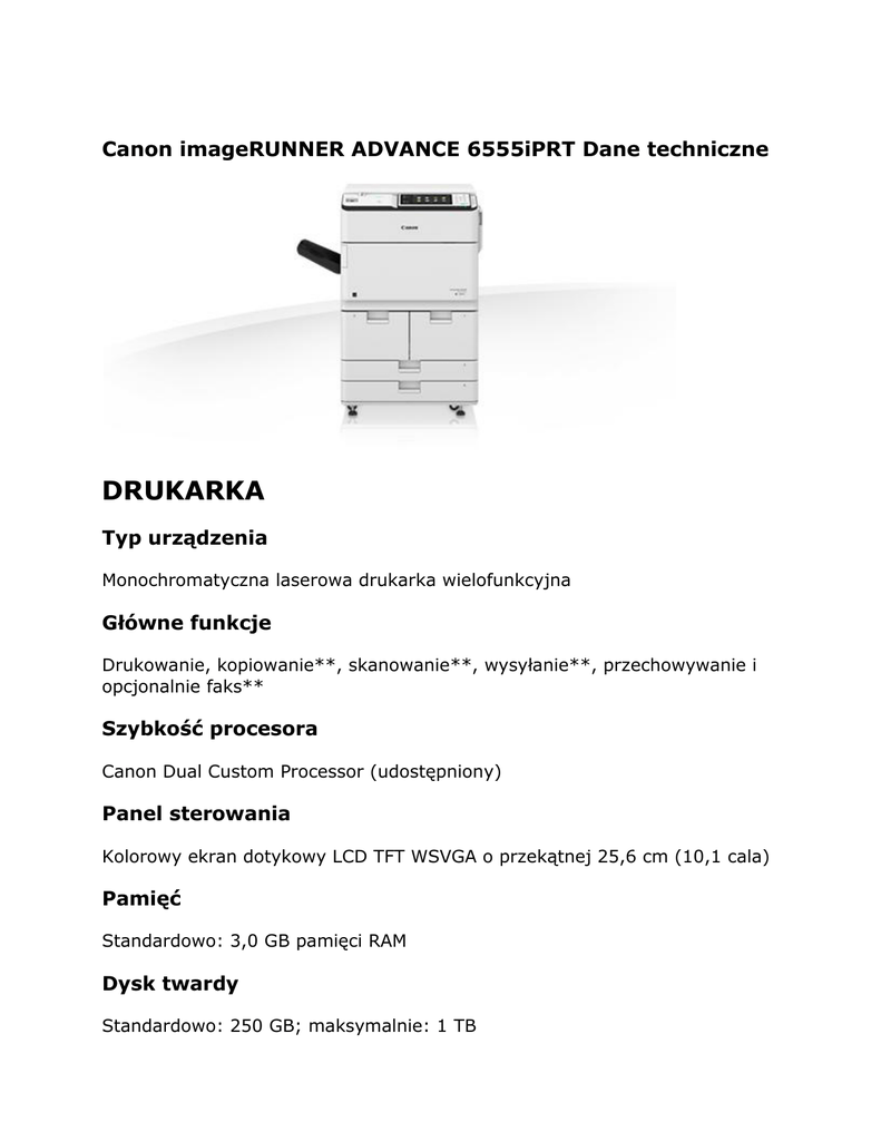 Canon imageRUNNER ADVANCE 6555iPRT Dane techniczne DRUKARKA Typ urządzenia Monochromatyczna laserowa drukarka wielofunkcyjna Główne funkcje Drukowanie, kopiowanie**, skanowanie**, wysyłanie**, przechowywanie i opcjonalnie faks** Szybkość procesora Canon Dual Custom Processor (udostępniony) Panel sterowania Kolorowy ekran dotykowy LCD TFT WSVGA o przekątnej 25,6 cm (10,1 cala) Pamięć Standardowo: 3,0 GB pamięci RAM Dysk twardy Standardowo: 250 GB; maksymalnie: 1 TB Kopia lustrzana dysku twardego (RAID 0) Opcje: 250 GB; 1 TB; metoda: Raid** Interfejsy podłączeniowe SIEĆ – standardowo: 10Base-T/100Base-TX/1000Base-T, bezprzewodowa sieć LAN (IEEE 802.11 b/g/n); opcja: NFC INNE – standardowo: 2 porty USB 2.0 (host), 1 port USB 3.0 (host), 1 port USB 2.0 (urządzenie); opcje: interfejs szeregowy, interfejs sterowania kopiowaniem Zasobniki papieru (w standardzie) 2 kasety na 1500 arkuszy, 2 kasety na 550 arkuszy (80 g/m²) Taca uniwersalna na 100 arkuszy (80 g/m²) Zasobniki papieru (opcjonalne) Dodatkowe 3500 arkuszy (ZASOBNIK POD LITE C1 lub ZASOBNIK PAPIERU E1) Maksymalna pojemność zasobników papieru 7700 arkuszy (80 g/m²) Pojemność tacy odbiorczej Z tacą kopiowania: 250 arkuszy (A4, 80 g/m²). Z tacą sortującą: 500 arkuszy (A4, 80 g/m²). Z zewnętrznymi modułami wykańczania: maks. 3500 arkuszy (A4, 80 g/m²). Funkcje wykańczania Z zewnętrznymi modułami wykańczania: sortowanie, grupowanie, wyrównywanie, zszywanie, szycie zeszytowe - broszurowanie, dziurkowanie, wstawianie, składanie C i Z Typy obsługiwanych nośników Lewa/prawa kaseta górna (1/2): Cienki papier, papier zwykły, papier makulaturowy, papier kolorowy, papier o dużej gramaturze, papier perforowany, papier z nagłówkiem, papier typu Bond Dolne kasety (3/4): Cienki papier, papier zwykły, papier makulaturowy, papier kolorowy, papier o dużej gramaturze, papier perforowany, papier z nagłówkiem, papier typu Bond, zakładki*. * Zakładki mogą być podawane z kasety nr 3 i 4, gdy zainstalowany jest opcjonalny ZESTAW PODAWANIA ZAKŁADEK B1. Taca uniwersalna: Papier cienki, papier zwykły, papier z makulatury, papier kolorowy, papier gruby, papier dziurkowany, papier typu Bond, folie, etykiety, papier firmowy, papier zakładkami, kalki¹ Typy obsługiwanych nośników (kontynuacja) ZASOBNIK POD LITE C1: papier cienki, papier zwykły, papier z makulatury, papier kolorowy, papier gruby, papier dziurkowany, papier firmowy, papier typu Bond ZASOBNIK PAPIERU E1: papier cienki, papier zwykły, papier z makulatury, papier kolorowy, papier gruby, papier dziurkowany, papier firmowy, papier typu Bond Formaty obsługiwanych nośników Lewa/prawa kaseta górna (1/2): Standardowe formaty: A4, B5 Dolne kasety (3/4): Rozmiar standardowy: A3, A4, A4R, A5R, B5, B5R Rozmiar niestandardowy: od 139,7 × 182 mm do 297 × 431,8 mm Taca uniwersalna: Rozmiar standardowy: A4, A4R, A3, A5R, B5, B5R Rozmiar niestandardowy: od 100 × 148 mm do 297 × 431,8 mm Dowolny rozmiar: od 100 × 182,2 mm do 297 × 431,8 mm ZASOBNIK POD LITE C1: A3, A4, A4R, A5R oraz rozmiary niestandardowy (od 139,7 × 182 mm do 297 × 431,8 mm) ZASOBNIK PAPIERU E1: A4 Obsługiwana gramatura nośników Kasety: 52–220 g/m² Taca uniwersalna: 52–256 g/m² Druk dwustronny: 52–220 g/m² Czas nagrzewania Od włączenia zasilania: maksymalnie 30 sekund Od wyjścia z trybu uśpienia: maksymalnie 30 sekund Tryb szybkiego uruchamiania: 3 sekundy¹ Wymiary (wys. × szer. × dł.) 670 × 779 × 1220 mm Miejsce na instalację (wys. × szer. × dł.) 1362 × 1353 mm (podstawowe: tylko taca uniwersalna + otwarte szuflady + taca kopiowania) 2407 × 1353 mm (pełna konfiguracja: obejmuje moduł wykańczania broszur + zasobnik papieru A3 + moduł wstawiania wkładek i składania dokumentów + moduł dziurkacza + otwarte szuflady) 2381 × 1353 mm (pełna konfiguracja: obejmuje moduł wykańczania broszur + zasobnik papieru A3 + moduł wstawiania wkładek i składania dokumentów + moduł dziurkacza + otwarte szuflady) Masa Około 234 kg¹ DANE TECHNICZNE WYDRUKU Technologia druku Monochromatyczny druk laserowy Szybkość drukowania iR-ADV 6555i/6555i PRT 55 str./min (A4) 32 str./min (A3) 40 str./min (A4R) 35 str./min (A5R) iR-ADV 6565i 65 str./min (A4) 32 str./min (A3) 47 str./min (A4R) 35 str./min (A5R) iR-ADV 6575i 75 str./min (A4) 37 str./min (A3) 54 str./min (A4R) 35 str./min (A5R) Rozdzielczość drukowania 1200 × 1200 dpi, 600 × 600 dpi Języki opisu strony UFR II, PCL 5e/6 (w standardzie) Oryginalny język Adobe PostScript Level 3 (opcja) Drukowanie dwustronne Automatyczne (w standardzie) Drukowanie bezpośrednie Możliwość drukowania bezpośrednio z pamięci USB, Advanced Space, zdalnego interfejsu użytkownika i oprogramowania Web Access¹ Obsługiwane typy plików: TIFF, JPEG, PDF i XPS Drukowanie z urządzeń przenośnych i chmury Oferujemy całą gamę dopasowanego do wymagań użytkowników oprogramowania i rozwiązań opartych na platformie MEAP do obsługi drukowania z urządzeń mobilnych, urządzeń z dostępem do Internetu i usług opartych na chmurze. W celu uzyskania dalszych informacji należy skontaktować się z przedstawicielem handlowym. Czcionki Czcionki PCL: 93 czcionki romańskie, 10 czcionek bitmapowych, 2 czcionki OCR, Andalé Mono WT J/K/S/T* (japoński, koreański, chiński uproszczony i chiński tradycyjny)* * Wymaga opcjonalnego ZESTAWU MIĘDZYNARODOWYCH CZCIONEK PCL A1. Czcionki PS: 136 Roman Funkcje drukowania Limit czasu wstrzymania zadania, wykańczanie podzbioru (tylko PS), ustawienia profilu, zabezpieczone drukowanie, znak wodny, obramowanie strony, nagłówek/stopka, układ strony, drukowanie dwustronne, składanie, drukowanie broszury, grupowanie, mieszane rozmiary/orientacje papieru, druk offsetowy, drukowanie na foliach, okładki przednie/tylne, redukcja zużycia toneru, drukowanie plakatów System operacyjny UFRII: Server 2003 / Server 2003 / R2 Vista Server 2008 / Windows 7 / Server 2008 R2 / Windows 8 / Ser