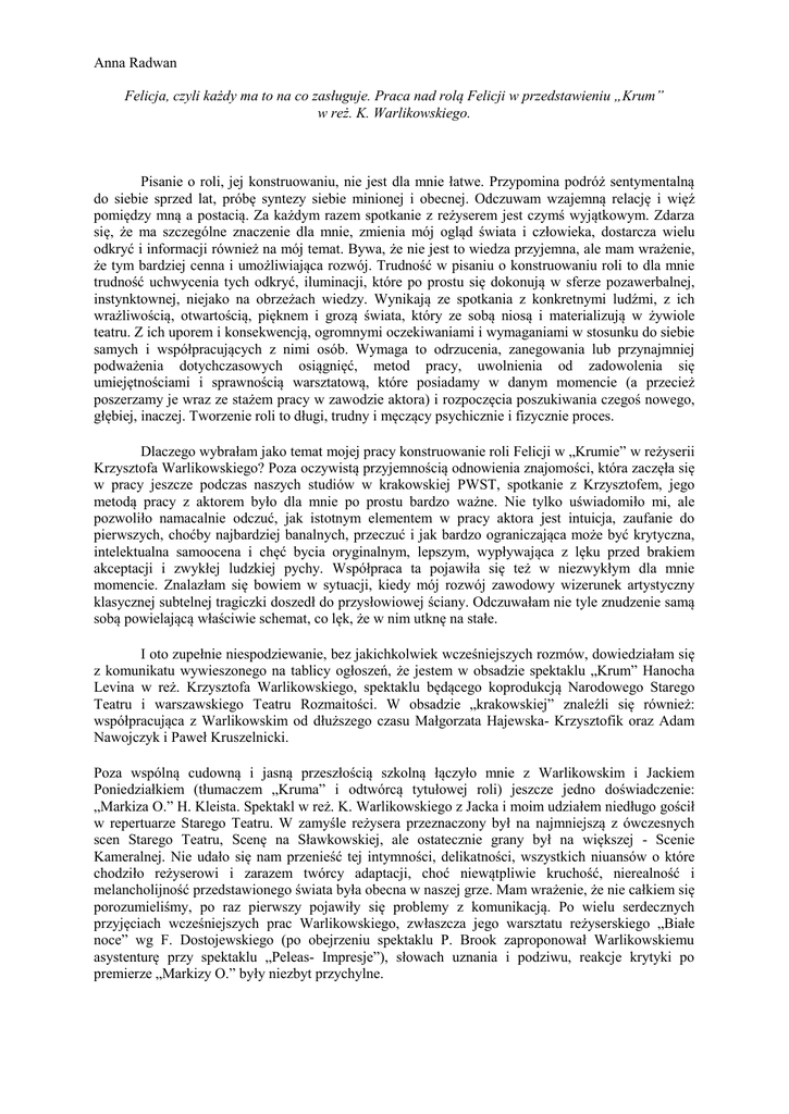 Anna Radwan Felicja, czyli każdy ma to na co zasługuje. Praca nad rolą Felicji w przedstawieniu „Krum” w reż. K. Warlikowskiego. Pisanie o roli, jej konstruowaniu, nie jest dla mnie łatwe. Przypomina podróż sentymentalną do siebie sprzed lat, próbę syntezy siebie minionej i obecnej. Odczuwam wzajemną relację i więź pomiędzy mną a postacią. Za każdym razem spotkanie z reżyserem jest czymś wyjątkowym. Zdarza się, że ma szczególne znaczenie dla mnie, zmienia mój ogląd świata i człowieka, dostarcza wielu odkryć i informacji również na mój temat. Bywa, że nie jest to wiedza przyjemna, ale mam wrażenie, że tym bardziej cenna i umożliwiająca rozwój. Trudność w pisaniu o konstruowaniu roli to dla mnie trudność uchwycenia tych odkryć, iluminacji, które po prostu się dokonują w sferze pozawerbalnej, instynktownej, niejako na obrzeżach wiedzy. Wynikają ze spotkania z konkretnymi ludźmi, z ich wrażliwością, otwartością, pięknem i grozą świata, który ze sobą niosą i materializują w żywiole teatru. Z ich uporem i konsekwencją, ogromnymi oczekiwaniami i wymaganiami w stosunku do siebie samych i współpracujących z nimi osób. Wymaga to odrzucenia, zanegowania lub przynajmniej podważenia dotychczasowych osiągnięć, metod pracy, uwolnienia od zadowolenia się umiejętnościami i sprawnością warsztatową, które posiadamy w danym momencie (a przecież poszerzamy je wraz ze stażem pracy w zawodzie aktora) i rozpoczęcia poszukiwania czegoś nowego, głębiej, inaczej. Tworzenie roli to długi, trudny i męczący psychicznie i fizycznie proces. Dlaczego wybrałam jako temat mojej pracy konstruowanie roli Felicji w „Krumie” w reżyserii Krzysztofa Warlikowskiego? Poza oczywistą przyjemnością odnowienia znajomości, która zaczęła się w pracy jeszcze podczas naszych studiów w krakowskiej PWST, spotkanie z Krzysztofem, jego metodą pracy z aktorem było dla mnie po prostu bardzo ważne. Nie tylko uświadomiło mi, ale pozwoliło namacalnie odczuć, jak istotnym elementem w pracy aktora jest intuicja, zaufanie do pierwszych, choćby najbardziej banalnych, przeczuć i jak bardzo ograniczająca może być krytyczna, intelektualna samoocena i chęć bycia oryginalnym, lepszym, wypływająca z lęku przed brakiem akceptacji i zwykłej ludzkiej pychy. Współpraca ta pojawiła się też w niezwykłym dla mnie momencie. Znalazłam się bowiem w sytuacji, kiedy mój rozwój zawodowy wizerunek artystyczny klasycznej subtelnej tragiczki doszedł do przysłowiowej ściany. Odczuwałam nie tyle znudzenie samą sobą powielającą właściwie schemat, co lęk, że w nim utknę na stałe. I oto zupełnie niespodziewanie, bez jakichkolwiek wcześniejszych rozmów, dowiedziałam się z komunikatu wywieszonego na tablicy ogłoszeń, że jestem w obsadzie spektaklu „Krum” anocha e ina w reż. Krzysztofa Warlikowskiego, spektaklu będącego koprodukcją Narodowego Starego Teatru i warszawskiego Teatru Rozmaitości. W obsadzie „krakowskiej” znaleźli się również: współpracująca z Warlikowskim od dłuższego czasu Małgorzata ajewska- Krzysztofik oraz Adam Nawojczyk i Paweł Kruszelnicki. Poza wspólną cudowną i jasną przeszłością szkolną łączyło mnie z Warlikowskim i Jackiem Poniedziałkiem (tłumaczem „Kruma” i odtwórcą tytułowej roli) jeszcze jedno doświadczenie „Markiza O.” . Kleista. pektakl w reż. K. Warlikowskiego z Jacka i moim udziałem niedługo gościł w repertuarze Starego Teatru. W zamyśle reżysera przeznaczony był na najmniejszą z ówczesnych scen Starego Teatru, cenę na ławkowskiej, ale ostatecznie grany był na większej - Scenie Kameralnej. Nie udało się nam przenieść tej intymności, delikatności, wszystkich niuansów o które chodziło reżyserowi i zarazem twórcy adaptacji, choć niewątpliwie kruchość, nierealność i melancholijność przedstawionego świata była obecna w naszej grze. Mam wrażenie, że nie całkiem się porozumieliśmy, po raz pierwszy pojawiły się problemy z komunikacją. Po wielu serdecznych przyjęciach wcześniejszych prac Warlikowskiego, zwłaszcza jego warsztatu reżyserskiego „Białe noce” wg F. Dostojewskiego (po obejrzeniu spektaklu P. Brook zaproponował Warlikowskiemu asystenturę przy spektaklu „Peleas- Impresje”), słowach uznania i podziwu, reakcje krytyki po premierze „Markizy O.” były niezbyt przychylne. Wszyscy byliśmy bardzo młodzi i zaczynaliśmy dopiero naszą zawodową pracę. Może był to moment, kiedy dopiero krystalizowały się nasze indywidualność, własny styl, sposób pracy. Zaimponowała mi jednak konsekwencja Warlikowskiego, upór i wiara w słuszność własnej wizji i brak jakichkolwiek pośpiesznych, histerycznych zmian byleby zadowolić gusta krytyków i licznych doradców. Obecny był na każdym spektaklu i pracował z nami spokojnie dalej. Z chwilą, kiedy pojawiła się możliwość ponownej współpracy, zaczęła nurtować mnie myśl: jaka informacja płynęła z tego doświadczenia, po którym nasz (mój z Jackiem i Warlikowskim) kontakt urwał się na kilka lat? Co to doświadczenie nam dało, co w nas zmieniło i czy będzie miało wpływ na nasze ponowne spotkanie? Trudno jest mi sobie wyobrazić odpowiedz na pytanie ” A co gdyby tej pracy nie było?". Dzięki niej sama dla siebie odkryłam w sobie nie tylko skłonność, ale przyjemność ryzykowania, „artystycznego hazardu”. Przy żadnym innym reżyserze nie przeżyłam sytuacji tak ekstremalnych jak te, kiedy na dosłownie kilkanaście minut przed spektaklem proponuje mi inne (nie tylko topograficzne) rozwiązanie sceny, ale sugeruje inną emocję, inne akcenty dramatyczne w scenie, czy inny kostium bez możliwości bezpiecznego spróbowania. Próbą jest bezpośrednia konfrontacja z publicznością i partnerami na scenie podczas spektaklu. Wymaga to oczywiście otwartości, zaufania do reżysera, odwagi ryzykowania i uwolnienia się 