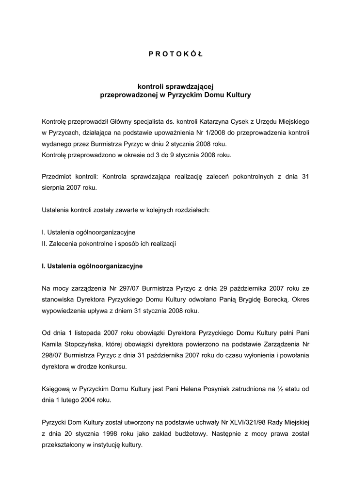 PROTOKÓŁ kontroli sprawdzającej przeprowadzonej w Pyrzyckim Domu Kultury Kontrolę przeprowadził Główny specjalista ds. kontroli Katarzyna Cysek z Urzędu Miejskiego w Pyrzycach, działająca na podstawie upoważnienia Nr 1/2008 do przeprowadzenia kontroli wydanego przez Burmistrza Pyrzyc w dniu 2 stycznia 2008 roku. Kontrolę przeprowadzono w okresie od 3 do 9 stycznia 2008 roku. Przedmiot kontroli: Kontrola sprawdzająca realizację zaleceń pokontrolnych z dnia 31 sierpnia 2007 roku. Ustalenia kontroli zostały zawarte w kolejnych rozdziałach: I. Ustalenia ogólnoorganizacyjne II. Zalecenia pokontrolne i sposób ich realizacji I. Ustalenia ogólnoorganizacyjne Na mocy zarządzenia Nr 297/07 Burmistrza Pyrzyc z dnia 29 października 2007 roku ze stanowiska Dyrektora Pyrzyckiego Domu Kultury odwołano Panią Brygidę Borecką. Okres wypowiedzenia upływa z dniem 31 stycznia 2008 roku. Od dnia 1 listopada 2007 roku obowiązki Dyrektora Pyrzyckiego Domu Kultury pełni Pani Kamila Stopczyńska, której obowiązki dyrektora powierzono na podstawie Zarządzenia Nr 298/07 Burmistrza Pyrzyc z dnia 31 października 2007 roku do czasu wyłonienia i powołania dyrektora w drodze konkursu. Księgową w Pyrzyckim Domu Kultury jest Pani Helena Posyniak zatrudniona na ½ etatu od dnia 1 lutego 2004 roku. Pyrzycki Dom Kultury został utworzony na podstawie uchwały Nr XLVI/321/98 Rady Miejskiej z dnia 20 stycznia 1998 roku jako zakład budżetowy. Następnie z mocy prawa został przekształcony w instytucję kultury. Na mocy uchwały Nr V/21/03 Rady Miejskiej z dnia 29 stycznia 2003 roku nadano statut Pyrzyckiemu Domu Kultury. II. Zalecenia pokontrolne i sposób ich realizacji W wyniku kontroli przeprowadzonej w terminie od 9 lipca do 22 sierpnia 2007 roku za okres I półrocza 2007 roku stwierdzono nieprawidłowości i uchybienia zawarte w wystąpieniu pokontrolnym KN/0913/5/2007 z dnia 31 sierpnia 2007 roku. W związku z powyższym obecny stan realizacji zaleceń pokontrolnych ustalono na podstawie czynności podjętych w okresie od września do grudnia 2007 roku. Podjęte działania związane z realizacją zaleceń pokontrolnych kształtowały się następująco w zakresie poszczególnych zagadnień: 1. W zakresie prawidłowego dokumentowania, ustalania i egzekwowania należności wynikających z obowiązujących porozumień i zarządzeń lub dokonania odpowiedniej zmiany obecnych uregulowań, w szczególności w zakresie opłat za: zajęcia umuzykalniające, naukę gry na instrumentach, udział w kołach zainteresowań oraz zajęciach tanecznych, wynajem sali i usługi ksero Zajęcia umuzykalniające Zawarto następujące umowy na prowadzenie zajęć umuzykalniających, w których jednoznacznie określono, że opłata miesięczna wynosi 6,50 zł lub 6,00 zł brutto tj.: - dnia 1 września 2007 roku z Przedszkolem Publicznym Nr 3 i Nr 4 - dnia 5 listopada 2007 roku z Przedszkolem Publicznym w Brzezinie - dnia 17 września 2007 roku ze Szkołą Podstawową Nr 2 Stwierdzona poprzednio nieprawidłowość polegająca na braku list uczestników rytmiki w Szkole Podstawowej Nr 2 oraz w Przedszkolu Publicznym Nr 4 stanowiących podstawę dokonania płatności – została obecnie wyeliminowana. Nauka gry na instrumentach i zajęcia taneczne W toku poprzedniej kontroli stwierdzono brak wpłat z tytułu nauki gry na pianinie oraz udziału w zajęciach tanecznych. 2 Na podstawie danych ewidencji księgowej stwierdzono, że w okresie od września do grudnia zarejestrowano wpływy do kasy za naukę gry na pianinie w kwocie 105 zł oraz uczestnictwo w zajęciach tanecznych w kwocie 596 zł. Nadmienia się, że wpłaty zaewidencjonowane jako „za uczestnictwo w zajęciach tanecznych” stanowiły według dowodu wpłaty „wpłaty na działalność zespołu” i wynosiły 2x10 zł, 20x15 zł i 23x12 zł od uczestnika zajęć. Zgodnie z obowiązującym Zarządzeniem Dyrektora Pyrzyckiego Domu Kultury z dnia 11 września 2006 roku – opłata winna wynosić 10 zł. Ponadto w dniu 03.07.2007r. instruktor dokonał wpłaty 5 240 zł. Kontrolującemu okazano listy z podziałem na uczestników poszczególnych grup za okres od IX 2006 roku do VI 2007 roku. Na podstawie okazanych list nie można ustalić daty pobrania opłaty tj. okresu przechowywania gotówki przez instruktora. Opłaty wpłacone do kasy dnia 03.07.2007r. dotyczące roku 2006 wynosiły łącznie – 2 310 zł a za 2007 rok – 2 930 zł. Opłaty pobierano w wysokości 5 zł lub 10 zł. Koła zainteresowań Wyniki poprzedniej kontroli wskazały na nieprawidłowości związane z: - pobieraniem opłaty za udział w kole modelarskim w wysokości 30 zł, pomimo jej nieokreślenia w uregulowaniach wewnętrznych, - pobieraniem opłat za udział w kole rzeźby w wysokości 10 zł zamiast 5 zł zgodnie z zarządzeniem Dyrektora Pyrzyckiego Domu Kultury z dnia 11 września 2006 roku. W toku niniejszej kontroli ustalono brak wpłat za udział w kole modelarskim w okresie od września do grudnia 2007 roku oraz nadal istniejącą niezgodność w zakresie wysokości opłaty za udział w kole rzeźby. Ponadto stwierdzono, że w badanym okresie pokontrolnym wpłynęły 3 wpłaty po 10 zł za udział w kole dziennikarskim, co nie znajdowało uzasadnienia w stosownym zarządzeniu kierownika jednostki. Obecnie na mocy zarządzenia Nr 2/2008 Dyrektora Pyrzyckiego Domu Kultury z dnia 3 stycznia 2008 roku ustalono wysokość stawek za zajęcia w Pyrzyckim Domu Kultury, w tym miesięcznie po 10 zł za udział w kole rzeźby, dziennikarskim i modelarskim, po 35 zł za naukę gry na instrumentach oraz 20 zł za zajęcia taneczne/ZPiT. Ustalono ponadto wysokość opłat w przypadku wpłat półrocznych i rocznych a także terminy oraz sposób ich dokonywania. 3 Powyższym zarządzeniem ujednolicono i dostosowano wysokość pobieranych opłat do stanu faktycznego. Wynajem sali W toku poprzedniej kontroli stwierdzono niezgodność pobranej opłaty z obowiązującą stawką w