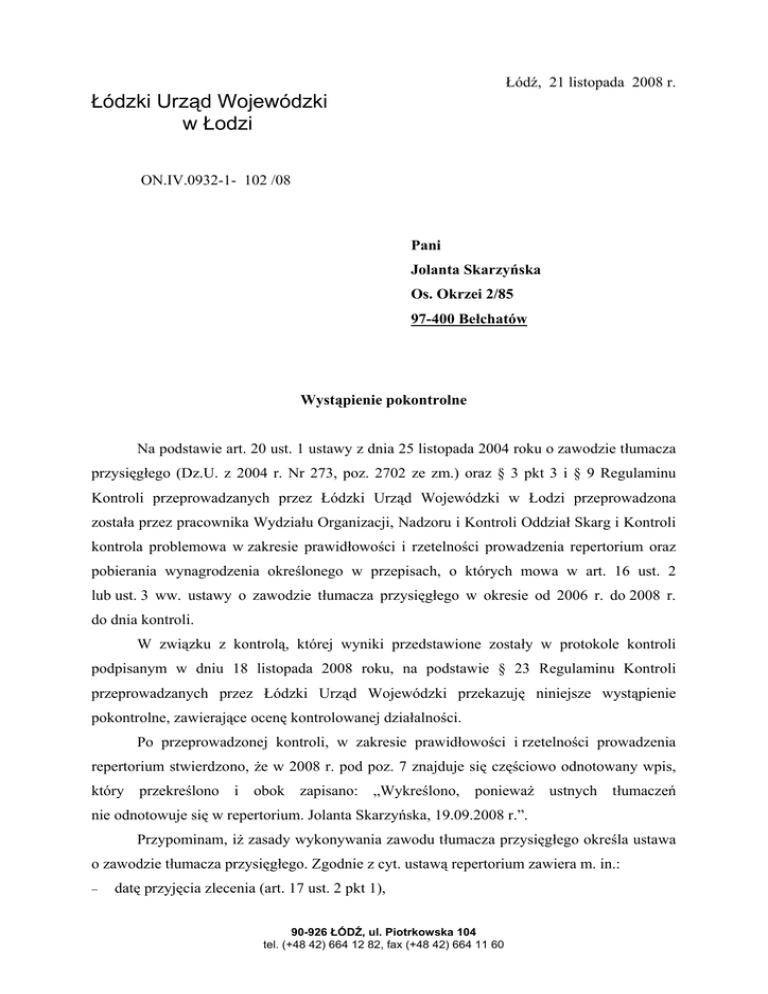 Łódź, 21 listopada 2008 r. Łódzki Urząd Wojewódzki w Łodzi ON.IV.0932-1- 102 /08 Pani Jolanta Skarzyńska Os. Okrzei 2/85 97-400 Bełchatów Wystąpienie pokontrolne Na podstawie art. 20 ust. 1 ustawy z dnia 25 listopada 2004 roku o zawodzie tłumacza przysięgłego (Dz.U. z 2004 r. Nr 273, poz. 2702 ze zm.) oraz § 3 pkt 3 i § 9 Regulaminu Kontroli przeprowadzanych przez Łódzki Urząd Wojewódzki w Łodzi przeprowadzona została przez pracownika Wydziału Organizacji, Nadzoru i Kontroli Oddział Skarg i Kontroli kontrola problemowa w zakresie prawidłowości i rzetelności prowadzenia repertorium oraz pobierania wynagrodzenia określonego w przepisach, o których mowa w art. 16 ust. 2 lub ust. 3 ww. ustawy o zawodzie tłumacza przysięgłego w okresie od 2006 r. do 2008 r. do dnia kontroli. W związku z kontrolą, której wyniki przedstawione zostały w protokole kontroli podpisanym w dniu 18 listopada 2008 roku, na podstawie § 23 Regulaminu Kontroli przeprowadzanych przez Łódzki Urząd Wojewódzki przekazuję niniejsze wystąpienie pokontrolne, zawierające ocenę kontrolowanej działalności. Po przeprowadzonej kontroli, w zakresie prawidłowości i rzetelności prowadzenia repertorium stwierdzono, że w 2008 r. pod poz. 7 znajduje się częściowo odnotowany wpis, który przekreślono i obok zapisano: „Wykreślono, ponieważ ustnych tłumaczeń nie odnotowuje się w repertorium. Jolanta Skarzyńska, 19.09.2008 r.”. Przypominam, iż zasady wykonywania zawodu tłumacza przysięgłego określa ustawa o zawodzie tłumacza przysięgłego. Zgodnie z cyt. ustawą repertorium zawiera m. in.: − datę przyjęcia zlecenia (art. 17 ust. 2 pkt 1), 90-926 ŁÓDŹ, ul. Piotrkowska 104 tel. (+48 42) 664 12 82, fax (+48 42) 664 11 60 − oznaczenie zleceniodawcy albo zamawiającego wykonanie oznaczonego tłumaczenia (art. 17 ust. 2 pkt 2), − opis tłumaczenia ustnego, wskazujący datę, miejsce, zakres i czas trwania tłumaczenia (art. 17 ust. 2 pkt 5), − wysokość pobranego wynagrodzenia (art. 17 ust. 2 pkt 6). Jak wyjaśniła Pani ustnie podczas prowadzonej kontroli, na poświadczonych tłumaczeniach, które wydaje tłumacz przysięgły, wymieniona jest pozycja, pod którą tłumaczenie jest odnotowane w repertorium, a także – w przypadku tłumaczenia z kopii poświadczonej / z kopii niepoświadczonej - widnieje stwierdzenie: „Poświadczam zgodność tłumaczenia (kserokopia, częściowo pismo ręczne)”, bez informacji, czy kopia jest poświadczona i przez kogo. W zakresie pobierania wynagrodzenia za czynności tłumacza przysięgłego wykonane na żądanie sądu, prokuratora, Policji oraz organów administracji publicznej stwierdzono: − w poz. 3 z dnia 15.04.2008 r. język, w którym dokument sporządzono: „język polski”, oznaczenie czynności: „Tłumaczenie z j. polskiego na język rosyjski”, 6 stron, 1 egzemplarz, pobrane wynagrodzenie: „180,21”, uwagi: „Dokument sporządzony drukiem, kserokopia”. Rozporządzenie Ministra Sprawiedliwości z dnia 24 stycznia 2005 r. w sprawie wynagrodzenia za czynności tłumacza przysięgłego (Dz. U. z 2005 r. Nr 15, poz. 131 ze zm.) przewiduje: 30,07 zł x 6 stron = 180,42 zł. Mając na względzie dokonane ustalenia proszę Panią: - o dokonywanie wpisów w repertorium wymaganych przepisem art. 17 ust. 1 i ust. 2 ww. ustawy o zawodzie tłumacza przysięgłego, - o stosowanie na poświadczonych tłumaczeniach oraz poświadczonych odpisach pism wpisów wynikających z art. 18 ust. 2 ustawy o zawodzie tłumacza przysięgłego, - o pobieranie wynagrodzenia za czynności tłumacza przysięgłego, wykonane na żądanie sądu, prokuratora, Policji oraz organów administracji publicznej zgodnie z ww. rozporządzeniem Ministra Sprawiedliwości. Jednocześnie oczekuję w terminie 30 dni od daty otrzymania niniejszego wystąpienia pokontrolnego informacji o sposobie wykonania powyższych uwag i wniosków, bądź o podjętych działaniach lub o przyczynach niepodjęcia działań mających na celu eliminację stwierdzonych w toku kontroli uchybień. Z up. Wojewody Łódzkiego /-/ Elżbieta Staszyńska Dyrektor Wydziału Organizacji, Nadzoru i Kontroli