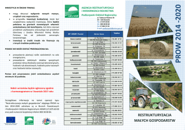 mogą dotyczyć wyłącznie nowych maszyn, urządzeń oraz wyposażenia; w przypadku inwestycji budowlanej, może być uwzględniona wyłącznie inwestycja, która będzie położona na gruntach stanowiących własność wnioskodawcy lub beneficjenta, lub która stanowi przedmiot użytkowania wieczystego lub przedmiot dzierżawy z Zasobu Własności Rolnej Skarbu Państwa lub od jednostek samorządu terytorialnego; inwestycji w środki trwałe nie finansuje się z innych środków publicznych. POMOC NIE MOŻE ZOSTAĆ PRZEZNACZONA NA: prowadzenie plantacji roślin wieloletnich na cele energetyczne, prowadzenie niektórych działów specjalnych produkcji rolnej (hodowla zwierząt laboratoryjnych, hodowla ryb akwariowych, hodowla psów rasowych oraz hodowla kotów rasowych). AGENCJA RESTRUKTURYZACJI i MODERNIZACJI ROLNICTWA Podkarpacki Oddział Regionalny al. Tadeusza Rejtana 36 35 – 310 Rzeszów Tel. 17 875 60 00 Inf. 800 38 00 84 Fax 17 864 25 50 E-mail: [email protected] PROW 2014 -2020 INWESTYCJE W ŚRODKI TRWAŁE: Pomoc jest przyznawana jeżeli wnioskodawca uzyskał minimum 10 punktów. Nabór wniosków będzie ogłoszony zgodnie z harmonogramem w I kwartale 2017 roku Szczegółowe informacje na temat operacji typu "Restrukturyzacja małych gospodarstw" objętego PROW na lata 2014-2020 udzielane są w Biurach Powiatowych i Podkarpackim Oddziale Regionalnym ARiMR (17) 875 60 00 oraz pod numerem bezpłatnej infolinii 800 38 00 84. RESTRUKTURYZACJA MAŁYCH GOSPODARSTW WARUNKI PRZYZNAWANIA POMOCY: PRZEZNACZENIE POMOCY: Premia może zostać przyznana rolnikowi albo małżonkowi rolnika, który m.in.: Premia przyznawana jest na operację: o wielkości ekonomicznej mniejszej niż 10 tys. euro; FORMA I WYSOKOŚĆ POMOCY: obejmującą restrukturyzację gospodarstwa w zakresie produkcji żywnościowych lub nieżywnościowych produktów rolnych lub przygotowania do sprzedaży produktów rolnych wytwarzanych w gospodarstwie; która ma na celu poprawę konkurencyjności i zwiększenie rentowności gospodarstwa oraz doprowadzi do wzrostu wielkości ekonomicznej gospodarstwa o do co najmniej 10 tys. euro, o co najmniej o 20 % w stosunku do wielkości wyjściowej; Premia w wysokości 60 tysięcy zł (jednak nie więcej niż równowartość 15 tys. euro), płatna w II transzach: w szczególności w wyniku zmiany rodzaju prowadzonej produkcji rolnej. jest posiadaczem samoistnym lub zależnym: o gospodarstwa rolnego, obejmującego co najmniej 1 ha gruntów ornych, sadów, łąk trwałych, pastwisk trwałych, gruntów rolnych zabudowanych, gruntów pod stawami lub gruntów pod rowami lub o nieruchomości służącej do prowadzenia produkcji w zakresie działów specjalnych produkcji rolnej, prowadzi w celach zarobkowych, osobiście i na własny rachunek działalność rolniczą w zakresie produkcji roślinnej lub zwierzęcej, z wyłączeniem chowu i hodowli ryb; jest pełnoletni w dniu złożenia wniosku; podlega ubezpieczeniu społecznemu rolników z mocy ustawy i w pełnym zakresie jako rolnik lub małżonek rolnika nieprzerwanie przez co najmniej 24 miesiące poprzedzające miesiąc złożenia wniosku o przyznanie pomocy i w tym okresie nie prowadził innej działalności gospodarczej; przedłożył biznesplan i zobowiązał się do jego realizacji w ciągu 3 lat od dnia wypłaty pierwszej raty pomocy. I rata - 80% całkowitej wartości pomocy, ale nie więcej niż 48 000 złotych (wniosek o płatność I raty składany w terminie 9 miesięcy od dnia doręczenia decyzji o przyznaniu pomocy); II rata - 20% całkowitej wartości pomocy, ale nie więcej niż 12 000 złotych (wniosek o płatność II raty składany po realizacji biznesplanu, jednak nie później niż do dnia upływu 3 lat od dnia wypłaty pierwszej raty pomocy). Pomoc przyznaje się na dane gospodarstwo tylko raz. W przypadku małżonków premię przyznaje się wyłącznie jednemu z nich, co do którego współmałżonek wyraził pisemną zgodę, niezależnie od tego czy posiadają wspólne czy odrębne gospodarstwa rolne. . Premia w całości musi zostać przeznaczona na prowadzoną w gospodarstwie działalność rolniczą lub przygotowanie do sprzedaży produktów rolnych wytwarzanych w gospodarstwie, przy czym inwestycje w środki trwałe muszą stanowić wartość równą co najmniej 80% kwoty pomocy.