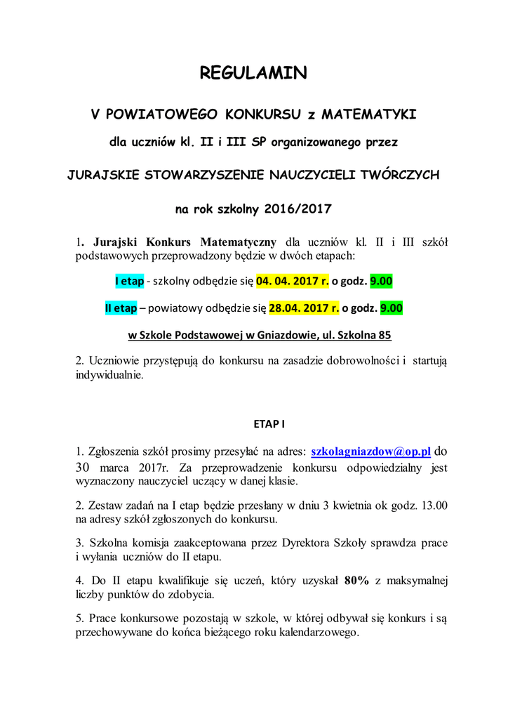 REGULAMIN V POWIATOWEGO KONKURSU z MATEMATYKI dla uczniów kl. II i III SP organizowanego przez JURAJSKIE STOWARZYSZENIE NAUCZYCIELI TWÓRCZYCH na rok szkolny 2016/2017 1. Jurajski Konkurs Matematyczny dla uczniów kl. II i III szkół podstawowych przeprowadzony będzie w dwóch etapach: I etap - szkolny odbędzie się 04. 04. 2017 r. o godz. 9.00 II etap – powiatowy odbędzie się 28.04. 2017 r. o godz. 9.00 w Szkole Podstawowej w Gniazdowie, ul. Szkolna 85 2. Uczniowie przystępują do konkursu na zasadzie dobrowolności i startują indywidualnie. ETAP I 1. Zgłoszenia szkół prosimy przesyłać na adres: [email protected] do 30 marca 2017r. Za przeprowadzenie konkursu odpowiedzialny jest wyznaczony nauczyciel uczący w danej klasie. 2. Zestaw zadań na I etap będzie przesłany w dniu 3 kwietnia ok godz. 13.00 na adresy szkół zgłoszonych do konkursu. 3. Szkolna komisja zaakceptowana przez Dyrektora Szkoły sprawdza prace i wyłania uczniów do II etapu. 4. Do II etapu kwalifikuje się uczeń, który uzyskał 80% z maksymalnej liczby punktów do zdobycia. 5. Prace konkursowe pozostają w szkole, w której odbywał się konkurs i są przechowywane do końca bieżącego roku kalendarzowego. 6. Protokół z przebiegu I etapu i zgłoszenia uczniów, którzy zakwalifikowali się do II etapu konkursu należy przesłać do dnia 24. 04. 2017 r. na adres: Szkoła Podstawowa w Gniazdowie, ul. Szkolna 85, 42-350 Koziegłowy, z dopiskiem na kopercie: V Jurajski Konkurs Matematyczny kl. II i III lub mailowo na adres: [email protected] II ETAP 7. II etap konkursu jest etapem powiatowym i wyłoni laureatów tego konkursu. 8. Zgłoszenia nauczycieli chętnych do pracy w komisji sprawdzającej II etap konkursu prosimy przesyłać na adres: [email protected] do 24. 04. 2017 r. Do 26. kwietnia 2017 r. nauczyciele – członkowie komisji zostaną powiadomieni drogą mailową lub telefonicznie. 9. Tytuł laureata otrzymuje uczeń, który uzyskał 85% punktów możliwych do zdobycia z testu II etapu. 10. Komisja zastrzega sobie prawo wskazania najlepszych prac w przypadku trudności z wyłonieniem laureatów. 11. Informacji na temat wyników konkursu udzielać będzie sekretariat Szkoły Podstawowej w Gniazdowie pod nr tel. 34 3141158 od dnia 4. maja 2017r. Wyniki zostaną również podane na stronie internetowej szkoły. Koordynator konkursu: Beata Gawenda [email protected] Zakres materiału do V POWIATOWEGO KONKURSU z MATEMATYKI dla uczniów klas II i III SP pod patronatem JURAJSKIEGO STOWARZYSZENIA NAUCZYCIELI TWÓRCZYCH na rok szkolny 2016/2017 I etap 1. Umiejętności w zakresie liczenia i sprawności rachunkowej: 1. sprawdzanie wyników dzielenia za pomocą mnożenia i odwrotnie. 2. zapisywanie liczb cyframi w zakresie 1000, 3. liczenie dziesiątkami w zakresie 100, 4. porównywanie liczb w zakresie100, 5. dodawanie i odejmowanie liczb w zakresie 100 i setkami w zakresie 1000, 6. sprawdzanie wyników odejmowania za pomocą dodawania, 7. rozwiązywanie równań jednodziałaniowych z niewiadomą w postaci okienka, 8. obliczanie długości linii łamanych, obwodów prostokątów, kwadratów i trójkątów , 9. mnożenie i dzielenie liczb w zakresie tabliczki mnożenia, 10. dokonywanie obliczeń kalendarzowych i zegarowych. 2.Umiejętności w zakresie dokonywania pomiarów: 1. dokonywanie obliczeń użytecznych, związanych z długością, masą, temperaturą, czasem, 2. posługiwanie się oznaczeniami i skrótami jednostek, 3. mierzenie i zapisywanie wyników pomiarów, stosowanie jednostek miary, 4. odczytywanie wskazań zegara, dokonywanie obliczeń zegarowych i kalendarzowych 5. zapisywanie i porządkowanie chronologicznie dat 6. rysowanie odcinków o podanej długości, 7. odczytywanie temperatury 8. odczytywanie i zapisywanie liczb w systemie rzymskim od I do XII. 3. Umiejętności w zakresie obliczeń pieniężnych: 1. dokonywanie prostych obliczeń pieniężnych: cena – ilość – wartość. 4. Umiejętności w zakresie czynności umysłowych: 1. rozwiązywanie zadań tekstowych na porównywanie różnicowe, 2. rozpoznawanie i nazywanie figur geometrycznych: koło, kwadrat, prostokąt, trójkąt, 3. rysowanie figur symetrycznych, 4. rysowanie figur w powiększeniu i pomniejszeniu, 5. rozwiązywanie zadań tekstowych, II etap - Zagadnienia obowiązujące na I etap oraz 1. kwadraty magiczne, 2. grafy i drzewka matematyczne, 3. zadania na logiczne myślenie. Koordynator konkursu: Beata Gawenda [email protected]
