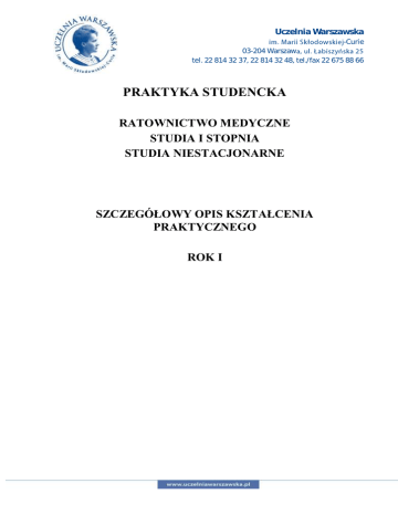 Uczelnia Warszawska -Curie 03-204 Warszaw tel. 22 814 32 37, 22 814 32 48, tel./fax 22 675 88 66 PRAKTYKA STUDENCKA RATOWNICTWO MEDYCZNE STUDIA I STOPNIA STUDIA NIESTACJONARNE SZCZEGÓŁOWY OPIS KSZTAŁCENIA PRAKTYCZNEGO ROK I Uczelnia Warszawska -Curie 03-204 Warszaw tel. 22 814 32 37, 22 814 32 48, tel./fax 22 675 88 66 ZARZĄDZANIE KRYZYSOWE Rodzaj i czas trwania praktyki zawodowej Miejsce praktyki Cele ogólne kształcenia Efekty kształcenia Zakres praktyk Obowiązkowa praktyka studencka na kierunku ratownictwo medyczne, przewidziana na okres przerwy międzysemestralnej po 2 semestrze. Czas trwania: 40 godzin dydaktycznych (1 tydzień) Liczba punktów ECTS: 2 Miejsce odbywania praktyki studenckiej w Wydziale Zarządzania Kryzysowego lub Centrum Powiadamiania Ratunkowego student ma prawo wybrać samodzielnie lub skorzystać z propozycji Uczelni. Szczegółowo: Wydziały zarządzenia kryzysowego (różne poziomy), Centra powiadamiania ratunkowego. Celem praktyki jest poznanie zasad funkcjonowania, planowania, dokumentowania i archiwizacji danych w Centrum Powiadamiania Ratunkowego lub Centrum Zarządzania Kryzysowego. WIEDZA – Student: W1. Zna zasady bhp oraz akty prawne obowiązujące w danej jednostce W2. Zna zadania i kompetencje osób funkcyjnych w danej jednostce organizacyjnej W3. Zna zadania jednostki w przypadku sytuacji kryzysowej oraz procedury decyzyjne obowiązujące w czasie pokoju, kryzysu i wojny W4. Określa zadania zespołu ratownictwa medycznego w systemie zarządzania kryzysowego oraz w medycznym zabezpieczeniu katastrofy UMIEJĘTNOŚĆ – Student: U1. Posiada umiejętność opracowywania projektów aktów normatywnych stanowionych przez organy danej instytucji dotyczącej bezpieczeństwa narodowego, bezpieczeństwa obywateli i porządku publicznego U2. Analizuje plany i programy organizacji działań ratunkowych w systemie ratownictwa U3. Stosuje rozwiązania teleinformatyczne wspomagające wykonywanie zawodu U4. Posiada umiejętność opracowywania indywidualnych aktów normatywnych, decyzji i postanowień, aktów kierownictwa wewnętrznego, projektów regulaminów. U5. Posiada umiejętność wykonywania dokumentacji na poszczególnych stanowiskach pracy i poprawnym jej prowadzeniu U6. Umiejętnie posługuje się aktami prawnymi dotyczącymi roli ratownika medycznego w systemie zarzadzania kryzysowego U7. Umiejętnie posługuje się systemem organizacji łączności KOMPETENCJE SPOŁECZNE – Student: K 1.Jest świadomy własnych ograniczeń i wie, kiedy zwrócić się do ekspertów, przełożonych K 2.Przestrzega zasad kultury K 3.Potrafi współdziałać i pracować w grupie K 4.Realizuje zadania zgodnie z zasadami bhp K 5.Potrafi uzupełniać i doskonalić nabyta wiedzę i umiejętności K 6.Potrafi formułować opinie dotyczące klientów, grup społecznych w kontekście związanym z wykonywaniem zawodu ratownika medycznego oraz prawidłowo identyfikuje i rozstrzyga dylematy związane z wykonywaniem zawodu Podczas praktyki student ma obowiązek asystowania we wszystkich czynnościach obowiązujących i realizowanych w jednostce. W czasie obywania praktyki zawodowej student powinien pogłębić swoją wiedzę w zakresie: 1. Instytucji zapewniających bezpieczeństwo w Polsce oraz zasad współdziałania na różnych szczeblach w strukturach bezpieczeństwa państwa. 2. Procedur przewidywania i przeciwdziałania ewentualnym zagrożeniom czasu Uczelnia Warszawska -Curie 03-204 Warszaw tel. 22 814 32 37, 22 814 32 48, tel./fax 22 675 88 66 pokoju i wojny. 3. Prognozowania możliwych zagrożeń naturalnych i spowodowanych przez człowieka oraz określania procedur i wykorzystania sił i środków w zakresie ewakuacji. 4. Przeznaczenia podstawowych jednostek w zwalczaniu różnego rodzaju zagrożeń oraz podstawowego i specjalistycznego sprzętu do likwidacji skutków tych zagrożeń. Zakres praktyk obejmuje: 1. Poznanie struktury organizacyjnej danej jednostki, systemu kontroli i nadzoru, 2. Zapoznanie z zasadami bezpieczeństwa i higieny pracy obowiązującymi w jednostce organizacyjnej; 3. Zapoznanie z aktami prawnymi dotyczącymi podstaw prawnych funkcjonowania danej jednostki organizacyjnej; 4. Zapoznanie z przepisami prawnymi dotyczącymi zadań i kompetencji osób funkcyjnych w danej jednostce organizacyjnej; 5. Zapoznanie z przepisami prawnymi dotyczącymi ochrony informacji niejawnych i wiadomości prawnie chronionych obowiązującymi w jednostce organizacyjnej; 6. Zapoznanie z techniką wykonywania dokumentacji na poszczególnych stanowiskach pracy i poprawnym jej prowadzeniu; 7. Zapoznanie z procedurami decyzyjnymi w jednostce obowiązującymi w czasie pokoju, kryzysu i wojny; 8. Zapoznanie z zadaniami mobilizacyjnymi danej jednostki organizacyjnej; 9. Zapoznanie z zadaniami jednostki w przypadku sytuacji kryzysowej; 10. Zapoznanie z zadaniami jednostki w przypadku klęski żywiołowej, stanu wyjątkowego i wojny; 11. Zdobycie umiejętności opracowywania projektów aktów normatywnych stanowionych przez organy danej instytucji dotyczącej bezpieczeństwa narodowego, bezpieczeństwa obywateli i porządku publicznego; 12. Zdobycie umiejętności opracowywania indywidualnych aktów normatywnych, decyzji i postanowień, aktów kierownictwa wewnętrznego, projektów regulaminów; 13. Poznanie systemów i technologii informacyjnych stosowanych przez zakład pracy; 14. Poznanie miejsca ratownictwa medycznego w systemie zarządzenia kryzysowego, 15. Asystowanie pracownikom jednostki w ich czynnościach zawodowych. Uczelnia Warszawska -Curie 03-204 Warszaw tel. 22 814 32 37, 22 814 32 48, tel./fax 22 675 88 66 ODDZIAŁ SZPITALNY Rodzaj i czas trwania praktyki zawodowej Miejsce praktyki Cele ogólne kształcenia Efekty kształcenia Obowiązkowa praktyka studencka na kierunku ratownictwo medyczne, przewidziana na okres przerwy międzysemestralnej po 2 semestrze. Czas trwania: 40 godzin dydaktycznych (1 tydzień) Liczba punktów ECTS: 2 Miejsce odbywania praktyki