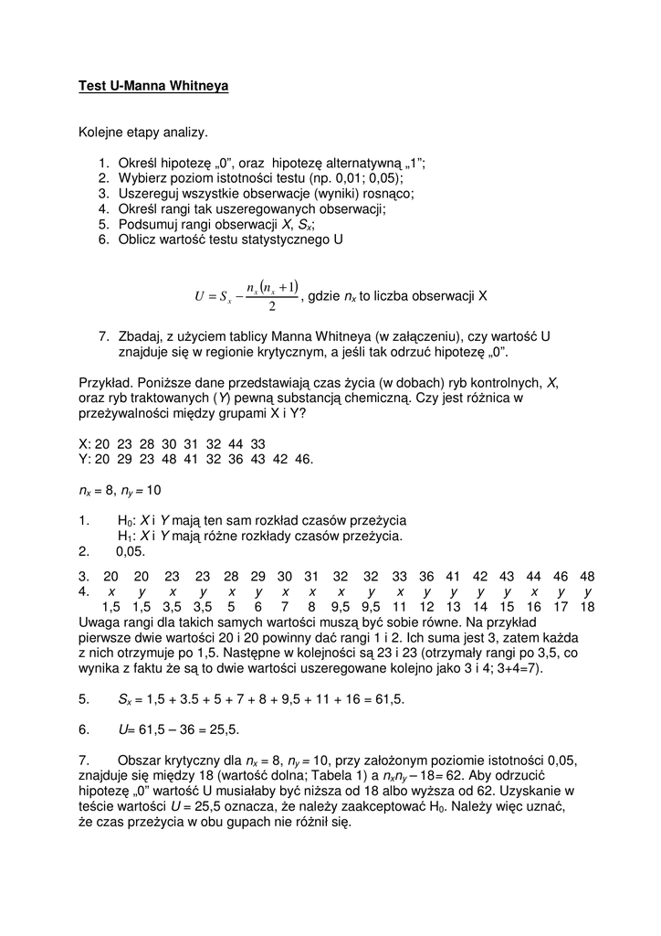 Test U-Manna Whitneya Kolejne etapy analizy. 1. 2. 3. 4. 5. 6. Okre l hipotez „0”, oraz hipotez alternatywn „1”; Wybierz poziom istotno ci testu (np. 0,01; 0,05); Uszereguj wszystkie obserwacje (wyniki) rosn co; Okre l rangi tak uszeregowanych obserwacji; Podsumuj rangi obserwacji X, Sx; Oblicz warto testu statystycznego U U = Sx − n x (n x + 1) , gdzie nx to liczba obserwacji X 2 7. Zbadaj, z u yciem tablicy Manna Whitneya (w zał czeniu), czy warto znajduje si w regionie krytycznym, a je li tak odrzu hipotez „0”. U Przykład. Poni sze dane przedstawiaj czas ycia (w dobach) ryb kontrolnych, X, oraz ryb traktowanych (Y) pewn substancj chemiczn . Czy jest ró nica w prze ywalno ci mi dzy grupami X i Y? X: 20 23 28 30 31 32 44 33 Y: 20 29 23 48 41 32 36 43 42 46. nx = 8, ny = 10 1. 2. H0: X i Y maj ten sam rozkład czasów prze ycia H1: X i Y maj ró ne rozkłady czasów prze ycia. 0,05. 3. 4. 20 20 23 23 28 29 30 31 32 32 33 36 41 42 43 44 46 48 x y x y x y x x x y x y y y y x y y 1,5 1,5 3,5 3,5 5 6 7 8 9,5 9,5 11 12 13 14 15 16 17 18 Uwaga rangi dla takich samych warto ci musz by sobie równe. Na przykład pierwsze dwie warto ci 20 i 20 powinny da rangi 1 i 2. Ich suma jest 3, zatem ka da z nich otrzymuje po 1,5. Nast pne w kolejno ci s 23 i 23 (otrzymały rangi po 3,5, co wynika z faktu e s to dwie warto ci uszeregowane kolejno jako 3 i 4; 3+4=7). 5. Sx = 1,5 + 3.5 + 5 + 7 + 8 + 9,5 + 11 + 16 = 61,5. 6. U= 61,5 – 36 = 25,5. 7. Obszar krytyczny dla nx = 8, ny = 10, przy zało onym poziomie istotno ci 0,05, znajduje si mi dzy 18 (warto dolna; Tabela 1) a nxny – 18= 62. Aby odrzuci hipotez „0” warto U musiałaby by ni sza od 18 albo wy sza od 62. Uzyskanie w te cie warto ci U = 25,5 oznacza, e nale y zaakceptowa H0. Nale y wi c uzna , e czas prze ycia w obu gupach nie ró nił si . Tabela 1. Dolne krytyczne warto ci dla testu U Manna- Whitneya. Górna warto krytyczna: nxny – (dolna warto krytyczna). Dla ka dej liczby obserwacji w kolumnach podawane s poziomy istotno ci = 2%, 5% oraz 10%.