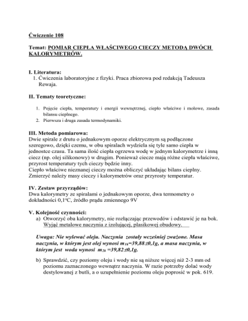 Ćwiczenie 108 Temat: POMIAR CIEPŁA WŁAŚCIWEGO CIECZY