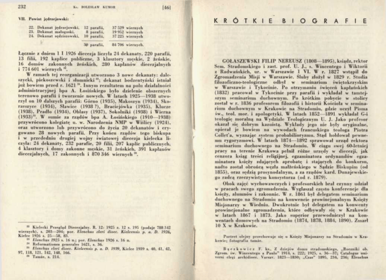 22. Dekanat jęd rzejow ski, 23. Dekanat m alogoski, 24. Dekanat sędziszowski, 12 parafii, 8 parafii, 10 parafii, 37 529 wiernych 19 952 wiernych 37 225 wiernych 3<) parafii, 84 706 wiernych. Łącznie z dniein 1 I 1926 diecezja liczyła 24 dekanaty, 220 parafii, 13 filii, 192 kaplice publiczne, 3 klasztory męskie, 2 żeńskie, 16 domów zakonnych żeńskich, 280 kapłanów diecezjalnych i 774 601 wiernych W ramach tej reorganizacji utworzono 3 nowe dekanaty: daleszycki, piekoszewski i słom nicki i3; dekanat bodzentyński istniał już bowiem przed r. 1621 "’4. Innym rezultatem na polu działalności administracyjnej bpa A. Łosińskiego było dzielenie obszernych terenowo parafii i tworzenie nowych. W latach 1925— 1938 utwo rzył on 10 dalszych parafii: Górno (1935), Makoszyn (1934), Skorzeszyce (1934), Sławice (1938 ?), Braciejówka (1935), Klucze (1938), Pradło (1934), Oblasy (1937), Sokolniki (1938) i Wierna (1933)25. W sumie za rządów bpa A. Łosińskiego (1910— 1938) przywrócono kolegiatę u. w. Narodzenia NMP w Wiślicy (1924), oraz utworzono lub przywrócono do życia 20 dekanatów i ery gowano 28 nowych parafii. Przy końcu rządów tego biskupa i w przededniu drugiej wojny światowej diecezja kielecka li czyła: 24 dekanaty, 232 parafie, 20 filii, 207 kaplic publicznych, 4 klasztory i domy zakonne męskie, 31 żeńskich, 391 kapłanów diecezjalnych, 17 zakonnych i 870 346 wiernych 2*. 22 K ielecki Przegląd D iecezjalny. R. 12: 1925 z. 12 s. 195 (podaje 788 342 w iernych), 8. 203— 204; por. Elenchus cleri dioec. K ielcen sis p. a. D. 1926, K ielce 1926 s. 25— 58, 83. 2:1 Elenchus 1925 s. 16 n.; por. Elenchus 1926 s. 16 n. 24 R eform ationes generales 1621, 8. 36. 25 Elenchus cleri d ioec. K ielcen sis p. a. D. 1939, K ielce 1939 s. 40, 41, 42, 97, 118, 121, 142, 14S, 166. 29 Tam że, s. 214. GOŁASZEWSKI FILIP NEREUSZ (1808— 1895), ksiądz, rektor Sem. Stradomskiego i zast. prof. U. J., s. Wincentego i Wiktorii z Radwańskich, ur. w Warszawie 1 VI. W r. 1827 wstąpił do Zgromadzenia Misji w Warszawie. Śluby złożył w 1829 r. Studia filozoficzno-teologiczne odbył w seminarium świętokrzyskim w Warszawie i Tykocinie. Po otrzymaniu święceń kapłańskich (1832) pracował w Tykocinie przy parafii i wykładał w tamtej szym seminarium duchownym. Po krótkim pobycie w stolicy został w r. 1836 profesorem filozofii i historii Kościoła w semina rium duchownym w Krakowie na Stradomiu, gdzie uczył Pisma św., teol. mor. i apologetyki. W latach 1852— 1891 wykładał G-i teologię moralną na Wydziale Teologicznym U. J. Jako profesor okazał się dobrym kazuistą. Wykłady jego nie były oryginalne, opierał je bowiem na wywodach francuskiego teologa Piotra Collet’ a, wyznając system prohahilioryzmu. Stąd hołdował pewne mu rygoryzmowi. W latach 1874— 1892 sprawował urząd rektora seminarium duchownego na Stradomiu. W ciągu swej 60-letniej pracy na terenie Krakowa pełnił różne urzędy w diecezji, jak cenzora ksiąg treści religijnej, egzaminatora ordynandów egza minatora księży zdających aprobatę i stających do konkursu, nadto został obrońcą węzła małżeńskiego w Sądzie Biskupim (od 1855), oraz sędzią prosynodalnym, a za rządów kard. Dunajewskie go radcą rzeczywistym konsystorza (od r. 1879). Obok zajęć wychowawczych i profesorskich brał czynny udział w pracach swego zgromadzenia. Wygłaszał często konferencje dla księży, alumnów i zakonnic. W r. 1861 był delegatem seminarium duchownego na Stradomiu na konwencie prowincjonalnym Księży Misjonarzy w Wiedniu. Dwukrotnie był delegatem na konwenty prowincjonalne zgromadzenia, które odbywały się w Krakowie w latach 1867 i 1873. Jako supęrior przewodniczył na kon wentach domowych na Stradomiu (1874, 1878, 1884. 1890). Zmarł 10 X w Krakowie. Portret olejny przechow uje się u Księży M isjonarzy na Stradom iu w K ra kow ie; fotografia tamże. B ą c z k o w i c z F. ks., Z dziejów dom u stradom skiego, ,.R oczniki oh. Zgrom . św. W incentego a Paulo” 1914, s. 222; 1925, s. 36— 3 7 ; Catalogus universi cleri archidioec. Varsav. 1823— 1830; „Czas” 1895, 234, 236; Elenchus universi cleri (lioec. Crac. 1836— 1895; Księga Pam iątkowa trzeclisetlecia Zgrom . Księży M isjonarzy, Kr. 1825 s. 97, 134; 1896, s. 52— 66 (nekrolog z fo to g ra fią ); Spisy w ykładów U. J. z lat 1853/54 — 1877/78; S z y m b o r W . x., Stradomskie konw enty dom ow e, „R o czn ik i ob. Zgrom adzeń św. W in cen tego a Paulo” 1933, s. 264— 74; W i c h e r W l. ks., T eologia m oralna na W ydziale T eologiczn ym Akadem ii K rakow skiej od końca X V III w. „P olon ia Sacra” I (1948), s. 131— 32; Rkpsy w Arch. K sięży M isjonarzy w K r. na Strad.: Catalogus seminaristarum; Catalogus dom orum et personarum ; M iscell. W arsz.; D o r ob i s A. ks., K sięga do zapisywania w ażniejszych w ypadków w Z g ro madzeniu od r. 1851; T e n ż e , Relatio visitatoris provinciae de statu dom orum et personarum (z r. 18 5 2); A rch. U. J.: Akta W ydz. T eol. (T eologia m oralna), nr 13; K sięgi m etrykalne par. T ykocin 1832— 35. K s. A lfon s Schletz G O R Z K I E W I C Z M A T E U S Z (1780— 1860), misjonarz, tir. 27 IX w Leśnej wsi (dziś włączona do Łasina), pow. grudziądz kim. Pierwsze nauki pobierał w Żurominie, ukończył je zaś w Mła wie w r. 1797. Pod koniec następnego roku wstąpił do Seminarium Internuin Zgrom. Księży Misjonarzy w Warszawie. Śluby złożył w r. 1800. Po ukończeniu filozofii i teologii otrzymał w r. 1804 święcenia kapłańskie. Odtąd przez prawie 30 lat poświęcił się pracy wychowawczej w seminariach duchownych. W 11. 1804-— 1812 wykładał w Seminarium Duchownym w Poznaniu. Przenie siony następnie do Warszawy, był w 11. 1812— 1817 profesorem Seminarium św. Krzyża, dyrektorem kleryków i egzaminatorem ordynandów. Przez trzy lata następne uczył łiistorii Kościoła i pra wa w Seminarium Stradomskim w Kr