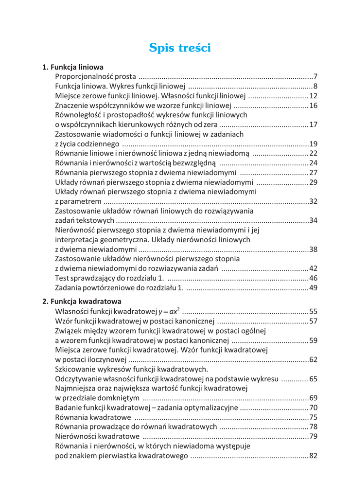 Spis treœci 1. Funkcja liniowa Proporcjonalnoœæ prosta ....................................................................................7 Funkcja liniowa. Wykres funkcji liniowej ............................................................8 Miejsce zerowe funkcji liniowej. W³asnoœci funkcji liniowej ............................. 12 Znaczenie wspó³czynników we wzorze funkcji liniowej ....................................16 Równoleg³oœæ i prostopad³oœæ wykresów funkcji liniowych o wspó³czynnikach kierunkowych ró¿nych od zera ...........................................17 Zastosowanie wiadomoœci o funkcji liniowej w zadaniach z ¿ycia codziennego ..........................................................................................19 Równanie liniowe i nierównoœæ liniowa z jedn¹ niewiadom¹ ........................... 22 Równania i nierównoœci z wartoœci¹ bezwzglêdn¹ ...........................................24 Równania pierwszego stopnia z dwiema niewiadomymi ................................. 27 Uk³ady równañ pierwszego stopnia z dwiema niewiadomymi ......................... 29 Uk³ady równañ pierwszego stopnia z dwiema niewiadomymi z parametrem ...................................................................................................32 Zastosowanie uk³adów równañ liniowych do rozwi¹zywania zadañ tekstowych .............................................................................................34 Nierównoœæ pierwszego stopnia z dwiema niewiadomymi i jej interpretacja geometryczna. Uk³ady nierównoœci liniowych z dwiema niewiadomymi ..................................................................................38 Zastosowanie uk³adów nierównoœci pierwszego stopnia z dwiema niewiadomymi do rozwiazywania zadañ ..........................................42 Test sprawdzaj¹cy do rozdzia³u 1. ....................................................................46 Zadania powtórzeniowe do rozdzia³u 1. ...........................................................49 2. Funkcja kwadratowa W³asnoœci funkcji kwadratowej y = ax2 .............................................................55 Wzór funkcji kwadratowej w postaci kanonicznej ............................................57 Zwi¹zek miêdzy wzorem funkcji kwadratowej w postaci ogólnej a wzorem funkcji kwadratowej w postaci kanonicznej .....................................59 Miejsca zerowe funkcji kwadratowej. Wzór funkcji kwadratowej w postaci iloczynowej .......................................................................................62 Szkicowanie wykresów funkcji kwadratowych. Odczytywanie w³asnoœci funkcji kwadratowej na podstawie wykresu ............. 65 Najmniejsza oraz najwiêksza wartoœæ funkcji kwadratowej w przedziale domkniêtym ................................................................................69 Badanie funkcji kwadratowej – zadania optymalizacyjne ................................. 70 Równania kwadratowe ....................................................................................75 Równania prowadz¹ce do równañ kwadratowych ...........................................78 Nierównoœci kwadratowe ................................................................................79 Równania i nierównoœci, w których niewiadoma wystêpuje pod znakiem pierwiastka kwadratowego .........................................................82 Zadania prowadz¹ce do równañ i nierównoœci kwadratowych ........................ 84 Wzory Viète’a ...................................................................................................88 Równania i nierównoœci kwadratowe z parametrem .......................................90 Wykres funkcji kwadratowej z wartoœci¹ bezwzglêdn¹ ....................................94 Równania i nierównoœci kwadratowe z wartoœci¹ bezwzglêdn¹ ....................... 96 Równania kwadratowe z wartoœci¹ bezwzglêdn¹ i parametrem ...................... 98 Test sprawdzaj¹cy do rozdzia³u 2. ....................................................................99 Zadania powtórzeniowe do rozdzia³u 2. .........................................................102 3. Geometria p³aska – czworok¹ty Podzia³ czworok¹tów. Trapezoidy ..................................................................109 Trapezy ...........................................................................................................110 Równoleg³oboki .............................................................................................113 Okr¹g opisany na czworok¹cie .......................................................................115 Okr¹g wpisany w czworok¹t ...........................................................................116 Okr¹g opisany na czworok¹cie, okr¹g wpisany w czworok¹t – zadania na dowodzenie ..................................................................................119 Podobieñstwo. Figury podobne .....................................................................121 Podobieñstwo czworok¹tów ..........................................................................123 Test sprawdzaj¹cy do rozdzia³u 3. ..................................................................125 Zadania powtórzeniowe do rozdzia³u 3. .........................................................127 4. Geometria p³aska – pole czworok¹ta Pole prostok¹ta. Pole kwadratu .....................................................................131 Pole równoleg³oboku. Pole rombu .................................................................132 Pole trapezu ...................................................................................................134 Pole czworok¹ta – zadania ró¿ne ....................................................................137 Pola figur podobnych .............................................................................