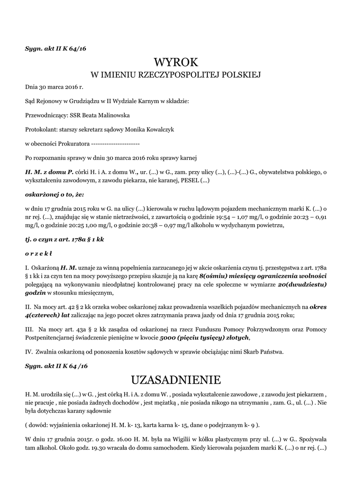 Sygn. akt II K 64/16 WYROK W IMIENIU RZECZYPOSPOLITEJ POLSKIEJ Dnia 30 marca 2016 r. Sąd Rejonowy w Grudziądzu w II Wydziale Karnym w składzie: Przewodniczący: SSR Beata Malinowska Protokolant: starszy sekretarz sądowy Monika Kowalczyk w obecności Prokuratora ---------------------Po rozpoznaniu sprawy w dniu 30 marca 2016 roku sprawy karnej H. M. z domu P. córki H. i A. z domu W., ur. (...) w G., zam. przy ulicy (...), (...)-(...) G., obywatelstwa polskiego, o wykształceniu zawodowym, z zawodu piekarza, nie karanej, PESEL (...) oskarżonej o to, że: w dniu 17 grudnia 2015 roku w G. na ulicy (...) kierowała w ruchu lądowym pojazdem mechanicznym marki K. (...) o nr rej. (...), znajdując się w stanie nietrzeźwości, z zawartością o godzinie 19:54 – 1,07 mg/l, o godzinie 20:23 – 0,91 mg/l, o godzinie 20:25 1,00 mg/l, o godzinie 20:38 – 0,97 mg/l alkoholu w wydychanym powietrzu, tj. o czyn z art. 178a § 1 kk orzekł I. Oskarżoną H. M. uznaje za winną popełnienia zarzucanego jej w akcie oskarżenia czynu tj. przestępstwa z art. 178a § 1 kk i za czyn ten na mocy powyższego przepisu skazuje ją na karę 8(ośmiu) miesięcy ograniczenia wolności polegającą na wykonywaniu nieodpłatnej kontrolowanej pracy na cele społeczne w wymiarze 20(dwudziestu) godzin w stosunku miesięcznym, II. Na mocy art. 42 § 2 kk orzeka wobec oskarżonej zakaz prowadzenia wszelkich pojazdów mechanicznych na okres 4(czterech) lat zaliczając na jego poczet okres zatrzymania prawa jazdy od dnia 17 grudnia 2015 roku; III. Na mocy art. 43a § 2 kk zasądza od oskarżonej na rzecz Funduszu Pomocy Pokrzywdzonym oraz Pomocy Postpenitencjarnej świadczenie pieniężne w kwocie 5000 (pięciu tysięcy) złotych, IV. Zwalnia oskarżoną od ponoszenia kosztów sądowych w sprawie obciążając nimi Skarb Państwa. Sygn. akt II K 64 /16 UZASADNIENIE H. M. urodziła się (...) w G. , jest córką H. i A. z domu W. , posiada wykształcenie zawodowe , z zawodu jest piekarzem , nie pracuje , nie posiada żadnych dochodów , jest mężatką , nie posiada nikogo na utrzymaniu , zam. G., ul. (...) . Nie była dotychczas karany sądownie ( dowód: wyjaśnienia oskarżonej H. M. k- 13, karta karna k- 15, dane o podejrzanym k- 9 ). W dniu 17 grudnia 2015r. o godz. 16.00 H. M. była na Wigilii w kółku plastycznym przy ul. (...) w G.. Spożywała tam alkohol. Około godz. 19.30 wracała do domu samochodem. Kiedy kierowała pojazdem marki K. (...) o nr rej. (...) na ul. (...) inny kierowca zauważył wykonany przez nią nieprawidłowo manewr i podejrzaną jazdę tzw. „zygzakiem” i powiadomił o tym policję. H. M. zatrzymała pojazd na ul. (...) . W tym też miejscu została podjęta do kontroli przez funkcjonariuszy Policji. O godz. 19.54 H. M. została poddana badaniom trzeźwości urządzeniem A. Sensor z wynikiem 1,07 mg/dm 3 alkoholu w wydychanym powietrzu. Następnie została przewieziona do K. w G.. Podczas badania przeprowadzonego o godz. 20.23 alkometr wykazał u H. M. 0,91 mg/l , o godz. 20.25 – 1,00 mg/l zaś o godz.20.38 – 0,97 mg/l zawartości alkoholu w wydychanym powietrzu ( dowód: wyjaśnienia oskarżonej k- 19, 13v-14 , protokoły z przebiegu badania stanu trzeźwości urządzeniem elektronicznym k- 2 i 3 , świadectwo wzorcowania k- 2a i 3a). Oskarżona H. M. w toku postępowania przygotowawczego przyznała się do popełnienia zarzucanego jej czynu i wyjaśniła ,że faktycznie spożywała alkohol na krótko przed tym kiedy kierowała samochodem (dowód: wyjaśnienia oskarżonej k- 19-20 , 13v-14 ). Wobec powyższego, zgodnie z treścią art. 335§ 2 kpk Prokurator dołączył do aktu oskarżenia wniosek o wydanie wyroku skazującego i orzeczenie uzgodnionej z oskarżoną kary i środków karnych bez przeprowadzenia rozprawy albowiem okoliczności popełnienia przestępstwa nie budziły wątpliwości a postawa oskarżonej wskazywała ,że cele postępowania zostaną osiągnięte( k. 19v-20, 24-25). Zgodnie zaś z treścią art. 343 § 6 kpk Sąd uwzględnił wniosek Prokuratora. Sąd dał wiarę wyjaśnieniom oskarżonej albowiem znalazły one w pełni potwierdzenie w zgromadzonym w sprawie materiale dowodowym a w szczególności w protokołach z przebiegu badania stanu trzeźwości urządzeniem elektronicznym z dnia 17 grudnia 2015r. Sąd dał wiarę dowodom z dokumentów, pism i protokołów zgromadzonym w toku postępowania uznając je za w pełni wiarygodne i nie znajdując podstaw do kwestionowania ich autentyczności. W świetle zgromadzonego w sprawie materiału dowodowego zarówno wina oskarżonej jak i okoliczności popełnienia czynu nie budzą wątpliwości. Zebrane w sprawie dowody jednoznacznie wskazują , że oskarżona H. M. swoim zachowaniem wyczerpała znamiona umyślnego występku z art. 178a § 1 kk gdyż kierowała samochodem znajdując się w stanie nietrzeźwości . Zdawała sobie sprawę z tego , że tego samego dnia , w krótkim odstępie czasu do momentu kiedy wsiadła za kierownicę spożywała alkohol a pomimo tego, kierowała pojazdem. Zdaniem Sądu orzeczona wobec oskarżonego kara 8 miesięcy ograniczenia wolności polegająca na wykonywaniu nieodpłatnej , kontrolowanej pracy na cele społeczne w wymiarze 20 godzin w stosunku miesięcznym jest odpowiednia do stopnia społecznego niebezpieczeństwa czynu. Spełni swą funkcję w zakresie prewencji ogólnej jak i funkcję represyjno-wychowawczą. Na mocy art. 42 § 2 kk Sąd orzekł wobec oskarżonej środek karny w postaci zakazu prowadzenia wszelkich pojazdów mechanicznych na okres 4 lat gdyż zgodnie z obowiązującym w chwili czynu brzmieniem tego przepisu środek ten może być orzeczony od lat 3 a stężenie alkoholu w wydychanym powietrzu u oskarżonej było wysokie . Na mocy art. 63 § 2 kk Sąd zaliczył na poczet orzeczonego zakazu prowadzenia pojazdów mechanicznych okres faktycznego zatrzymania prawa jazdy oskarżonej od dnia 17 grudnia 2015r. Na mocy art. 43a § 2 kk Sąd zasądził od osk