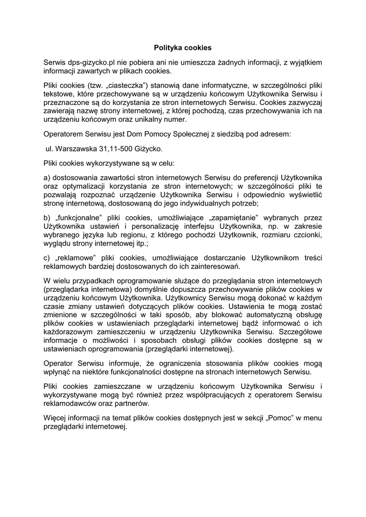 Polityka cookies Serwis dps-gizycko.pl nie pobiera ani nie