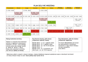 PLAN SESJI WE WRZEŒNIU Poniedzia³ek Wtorek C 07:00 - 08:00 Œroda C 07:00 - 08:00 B 10:30 -12:00 Pi¹tek Sobota Niedziela 02 i 16 wrzeœnia Niedziela Niedziela 09 i 23 wrzeœnia 30 wrzeœnia B 10:30 - 12:00 B 10:30 - 12:00 C 07:00 - 08:00 B 09:00 - 10:30 B 09:00 - 10:30 Sesja ³agodnej praktyki Od 21 wrzeœnia Sesja ³agodnej praktyki Od 18 wrzeœnia B 10:30 -12:00 Czwartek B 10:30 -12:00 B 10:30 -12:00 B 12:00 - 13:30 B 10:30 -12:00 B 10:30 - 12:00 B 10:30 - 12:00 B 12:00 - 13:30 sesja ³agodnej praktyki od 24 wrzeœnia 12:00 - 13:00 sesja ³agodnej praktyki od 22 wrzeœnia C 14:00 - 15:30 sesja kobieca 13:30 - 15:30 Sesja Przygotowawcza 15:00 - 17:30 C 15:30 - 17:00 C 15:00 - 16:30 C 15:30 - 17:00 C 15:00 - 16:30 C 15:30 - 17:00 C 15:30 - 17:00 spotkanie 16:00 - 17:30 B 17:00 - 18:30 B 16:30 - 18:00 B 17:00 - 18:30 B 16:30 - 18:00 B 17:00 - 18:30 g³êboki relaks B 18:30 - 20:00 A 18:00 - 20:00 B 18:30 - 20:00 A 18:00 - 20:00 B 18:30 - 20:00 A 18:00 - 20:00 A 18:00 - 20:00 A 20:00 - 21:30 A 20:00 - 21:30 20:00 - 22:00 Sesja Przygotowawcza Wykup konkretne terminy: Wybierz co najmniej dwa konkretne terminy w tygodniu z oznaczonych literkami A, B lub C. Cena jednego terminu przez ca³y miesi¹c wynosi: A - 90 z³, B - 70 z³, C - 55 z³. Dodaj ceny wybranych terminów, aby obliczyæ op³atê za miesi¹c. A 18:00 - 20:00 A 18:00 - 20:00 A 20:00 - 21:30 Kup Karnet otwarty, jeœli chcesz uczêszczaæ czêœciej i taniej: Kup Abonament, jeœli nie mo¿esz uczêszczaæ regularnie: Karnet 300 z³ - A, B, C i g³êboki relaks Karnet 250 z³ - B, C i g³êboki relaks Karnet 200 z³ - B, C do 15:30 w³¹cznie Karnet 150 z³ - C Karnet 130 z³ - B, C (uczniowie i studenci) pon.- pt. do 15:30 w³¹cznie. W ramach Abonamentu jest 8 sesji do wykorzystania w dowolnych terminach w ci¹gu dwóch miesiêcy od daty wykupienia. Cena 200 z³. Op³aciwszy udzia³ w sesjach w danym miesi¹cu, mo¿esz dodatkowo kupowaæ pojedyncze sesje w dowolnych terminach (w miarê wolnych miejsc na sali) koszt jednej sesji wynosi 25 z³. Oprócz standardowych pó³toragodzinnych sesji, bêd¹cych podstawow¹ form¹ pracy w Akademii, polecamy: Sesje dwugodzinne z pe³nym cyklem æwiczeñ, optymalnym tempem i stosownym relaksem na koñcu. Sesje ³agodnej praktyki, które proponujemy osobom starszym i o s³abszej kondycji psychofizycznej. Sesje kobiece (bezp³atne), na które zapraszamy panie nie uczestnicz¹ce w zwyk³ych sesjach z powodu okresu. Sesje g³êbokiego relaksu ucz¹ce systematycznego rozluŸniania cia³a i umys³u w pozycji le¿¹cej. Jednorazowy koszt - 25 z³. Sesje pranajamy, sztuki jogicznego oddychania, które s¹ organizowane cyklicznie. Jednodniowe Warsztaty doskonal¹ce praktykê prowadzone przez zespó³ Akademii lub zaproszonych wybitnych nauczycieli. Integracyjne bezp³atne Spotkania zawieraj¹ce wyk³ady, sesje pytañ i odpowiedzi, projekcje filmów, poczêstunek. Jak siê zapisaæ? Praktykê jogi w naszej Akademii mo¿esz rozpocz¹æ w dowolnym momencie od udzia³u w jednej Sesji Przygotowawczej (dwie godziny). Masz dwa terminy do wyboru: œroda 20:00 22:00 lub sobota 13:30 15:30. Koszt 40 z³. Nasi doœwiadczeni nauczyciele w ciekawy i inspiruj¹cy sposób przeka¿¹ Ci po³¹czon¹ wiedzê teoretyczn¹ i praktyczn¹, niezbêdn¹ w dalszej praktyce jogi. Przygotuj¹ do p³ynnego wejœcia w tok zajêæ Akademii. Na tej sesji ju¿ bêd¹ æwiczenia, a zatem: - za³ó¿ strój nie krêpuj¹cy ruchów - æwicz boso, nie zak³adaj skarpet - przyjdŸ z pustym ¿o³¹dkiem, du¿y posi³ek zjedz 3-4 godziny wczeœniej, przed sesj¹ mo¿esz wypiæ fili¿ankê napoju - nie musisz przynosiæ pomocy do æwiczeñ, na sali jest niezbêdny sprzêt Na tê pierwsz¹ sesjê zapraszamy 30 minut wczeœniej w celu zapoznania siê z Regulaminem i dope³nienia formalnoœci. Prosimy tak¿e o przyniesienie zdjêcia legitymacyjnego do Karty Uczestnika. Po zaliczeniu tej sesji mo¿esz od razu, nawet w œrodku miesi¹ca, zapisaæ siê na zwyk³e sesje. Wówczas miesiêczna op³ata bêdzie obliczona proporcjonalnie do liczby dni pozosta³ych do koñca miesi¹ca. Natomiast w kolejnych okresach bêdzie ju¿ zawsze obowi¹zywa³a op³ata za ca³y miesi¹c kalendarzowy. Mo¿esz æwiczyæ dwa razy w tygodniu lub czêœciej. Op³ata miesiêczna zale¿y od liczby terminów oraz godzin rozpoczêcia sesji i wynosi od 110 do 300 z³. Od razu mo¿esz uczêszczaæ na sesje oznaczone literkami B i C. Na pozosta³e sesje - po zaliczeniu pe³nego miesi¹ca kalendarzowego. ul. Wa³owa 3, 00-211 Warszawa tel: 635 68 69 oraz 0601 33 19 39 internet: www.ahj.pl, e-mail: [email protected] PKO Inteligo 80 1020 1013 0000 0102 0102 3894