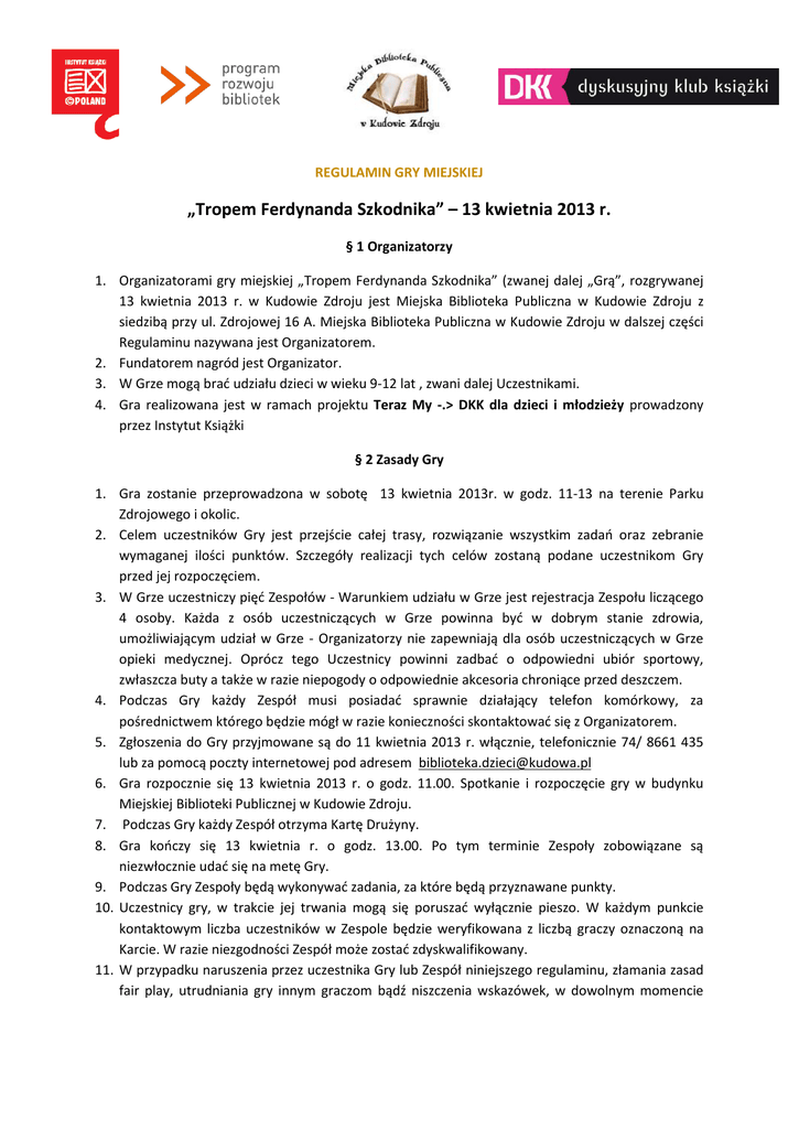 REGULAMIN GRY MIEJSKIEJ „Tropem Ferdynanda Szkodnika” – 13 kwietnia 2013 r. § 1 Organizatorzy 1. Organizatorami gry miejskiej „Tropem Ferdynanda Szkodnika” (zwanej dalej „Grą”, rozgrywanej 13 kwietnia 2013 r. w Kudowie Zdroju jest Miejska Biblioteka Publiczna w Kudowie Zdroju z siedzibą przy ul. Zdrojowej 16 A. Miejska Biblioteka Publiczna w Kudowie Zdroju w dalszej części Regulaminu nazywana jest Organizatorem. 2. Fundatorem nagród jest Organizator. 3. W Grze mogą brad udziału dzieci w wieku 9-12 lat , zwani dalej Uczestnikami. 4. Gra realizowana jest w ramach projektu Teraz My -.> DKK dla dzieci i młodzieży prowadzony przez Instytut Książki § 2 Zasady Gry 1. Gra zostanie przeprowadzona w sobotę 13 kwietnia 2013r. w godz. 11-13 na terenie Parku Zdrojowego i okolic. 2. Celem uczestników Gry jest przejście całej trasy, rozwiązanie wszystkim zadao oraz zebranie wymaganej ilości punktów. Szczegóły realizacji tych celów zostaną podane uczestnikom Gry przed jej rozpoczęciem. 3. W Grze uczestniczy pięd Zespołów - Warunkiem udziału w Grze jest rejestracja Zespołu liczącego 4 osoby. Każda z osób uczestniczących w Grze powinna byd w dobrym stanie zdrowia, umożliwiającym udział w Grze - Organizatorzy nie zapewniają dla osób uczestniczących w Grze opieki medycznej. Oprócz tego Uczestnicy powinni zadbad o odpowiedni ubiór sportowy, zwłaszcza buty a także w razie niepogody o odpowiednie akcesoria chroniące przed deszczem. 4. Podczas Gry każdy Zespół musi posiadad sprawnie działający telefon komórkowy, za pośrednictwem którego będzie mógł w razie konieczności skontaktowad się z Organizatorem. 5. Zgłoszenia do Gry przyjmowane są do 11 kwietnia 2013 r. włącznie, telefonicznie 74/ 8661 435 lub za pomocą poczty internetowej pod adresem [email protected] 6. Gra rozpocznie się 13 kwietnia 2013 r. o godz. 11.00. Spotkanie i rozpoczęcie gry w budynku Miejskiej Biblioteki Publicznej w Kudowie Zdroju. 7. Podczas Gry każdy Zespół otrzyma Kartę Drużyny. 8. Gra kooczy się 13 kwietnia r. o godz. 13.00. Po tym terminie Zespoły zobowiązane są niezwłocznie udad się na metę Gry. 9. Podczas Gry Zespoły będą wykonywad zadania, za które będą przyznawane punkty. 10. Uczestnicy gry, w trakcie jej trwania mogą się poruszad wyłącznie pieszo. W każdym punkcie kontaktowym liczba uczestników w Zespole będzie weryfikowana z liczbą graczy oznaczoną na Karcie. W razie niezgodności Zespół może zostad zdyskwalifikowany. 11. W przypadku naruszenia przez uczestnika Gry lub Zespół niniejszego regulaminu, złamania zasad fair play, utrudniania gry innym graczom bądź niszczenia wskazówek, w dowolnym momencie Gry Organizatorzy mają prawo odebrania Zespołowi Karty i wykluczenia go z Gry. Decyzja Organizatorów w tej kwestii jest ostateczna. 12. Gra toczy się w normalnym ruchu miejskim i prosimy o zachowanie szczególnej ostrożności. 13. Poprzez nadesłanie zgłoszenia do udziału w Grze uczestnik wyraża zgodę na wzięcie udziału w Grze na warunkach określonych w niniejszym regulaminie oraz przetwarzanie przez Organizatorów danych osobowych uczestnika w zakresie niezbędnym dla przeprowadzenia Gry zgodnie z Ustawą z dnia 29 sierpnia 1997 r. o ochronie danych osobowych (Dz. U. z 2002 r., Nr 101, poz. 926 z późn. zm.). Podanie danych jest dobrowolne, a uczestnikowi przysługuje prawo dostępu do swoich danych osobowych oraz ich poprawiania. § 3 Wyłanianie zwycięzców 1. Wygrywa Zespół, który jako pierwszy dotrze na metę z kompletem rozwiązanych zadao i maksymalną ilością punktów. 2. O kolejnych miejscach w klasyfikacji będą decydowały zdobyte przez Zespoły punkty. W sprawach niejasnych decyzja o przyznaniu miejsca należy do Organizatora. 3. Ogłoszenie wyników Gry i wręczenie nagród nastąpi 13 kwietnia 2013 r. nie później niż o godz. 13.30 na mecie Gry. § 4 Nagrody 1. Dla Zwycięzców przewidziano nagrodę główną, dla pozostałych Zespołów zestawy gadżetów ufundowane przez Organizatora. § 5 Postanowienia koocowe 1. Regulamin znajduje się do wglądu w siedzibie Miejskiej Biblioteki Publicznej w Kudowie Zdroju przy ul. Zdrojowej 16 A 2. W kwestiach dotyczących przebiegu Gry, nieprzewidzianych niniejszym regulaminem, a także w zakresie interpretacji niniejszego regulaminu, głos rozstrzygający należy do Organizatora. 3. Organizatorzy zastrzegają sobie prawo wprowadzenia zmian w regulaminie z ważnych przyczyn. 4. Gra ma charakter Konkursu, który nie podlega przepisom ustawy z dnia 29 lipca 1992 roku o grach i zakładach wzajemnych (Dz.U. z 2004, Nr.4, poz 27 z późniejszymi zmianami). Projekt Teraz My -.> DKK dla dzieci i młodzieży prowadzony jest przez Instytut Książki w ramach Programu Rozwoju Bibliotek. „Program Rozwoju Bibliotek w Polsce wspierany jest przez Global Libraries- przedsięwzięcie prowadzone w ramach Światowego Programu Rozwoju Fundacji Billa i Melindy Gates, której partnerem i grantobiorcą w Polsce jest Polsko-Amerykaoska Fundacja Wolności. Realizatorem Programu jest Fundacja Rozwoju Społeczeostwa Informacyjnego, która na ten cel otrzymała grant od Polsko-Amerykaoskiej Fundacji Wolności”.