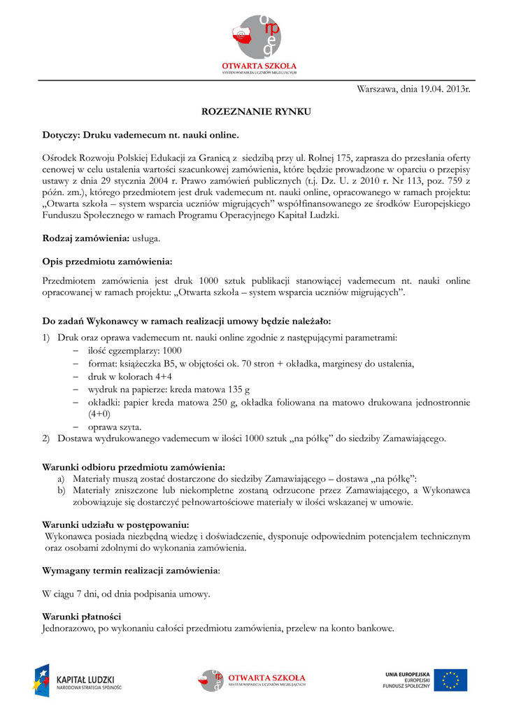 Warszawa, dnia 19.04. 2013r. ROZEZNANIE RYNKU Dotyczy: Druku vademecum nt. nauki online. Ośrodek Rozwoju Polskiej Edukacji za Granicą z siedzibą przy ul. Rolnej 175, zaprasza do przesłania oferty cenowej w celu ustalenia wartości szacunkowej zamówienia, które będzie prowadzone w oparciu o przepisy ustawy z dnia 29 stycznia 2004 r. Prawo zamówień publicznych (t.j. Dz. U. z 2010 r. Nr 113, poz. 759 z późn. zm.), którego przedmiotem jest druk vademecum nt. nauki online, opracowanego w ramach projektu: „Otwarta szkoła – system wsparcia uczniów migrujących” współfinansowanego ze środków Europejskiego Funduszu Społecznego w ramach Programu Operacyjnego Kapitał Ludzki. Rodzaj zamówienia: usługa. Opis przedmiotu zamówienia: Przedmiotem zamówienia jest druk 1000 sztuk publikacji stanowiącej vademecum nt. nauki online opracowanej w ramach projektu: „Otwarta szkoła – system wsparcia uczniów migrujących”. Do zadań Wykonawcy w ramach realizacji umowy będzie należało: 1) Druk oraz oprawa vademecum nt. nauki online zgodnie z następującymi parametrami: ilość egzemplarzy: 1000 format: książeczka B5, w objętości ok. 70 stron + okładka, marginesy do ustalenia, druk w kolorach 4+4 wydruk na papierze: kreda matowa 135 g okładki: papier kreda matowa 250 g, okładka foliowana na matowo drukowana jednostronnie (4+0) oprawa szyta. 2) Dostawa wydrukowanego vademecum w ilości 1000 sztuk „na półkę” do siedziby Zamawiającego. Warunki odbioru przedmiotu zamówienia: a) Materiały muszą zostać dostarczone do siedziby Zamawiającego – dostawa „na półkę”: b) Materiały zniszczone lub niekompletne zostaną odrzucone przez Zamawiającego, a Wykonawca zobowiązuje się dostarczyć pełnowartościowe materiały w ilości wskazanej w umowie. Warunki udziału w postępowaniu: Wykonawca posiada niezbędną wiedzę i doświadczenie, dysponuje odpowiednim potencjałem technicznym oraz osobami zdolnymi do wykonania zamówienia. Wymagany termin realizacji zamówienia: W ciągu 7 dni, od dnia podpisania umowy. Warunki płatności Jednorazowo, po wykonaniu całości przedmiotu zamówienia, przelew na konto bankowe. Ofertę proszę przesłać do dnia 24 kwietnia 2013 r. do godz. 12:00 na adres korespondencyjny Zamawiającego (ul. Rolna 175, 02-729 Warszawa) lub na numer faksu +48 22 853 8702 lub adres e-mail: [email protected] z dopiskiem/tytułem: „Oferta na druk vademecum” Oferta powinna zawierać: 1) Nazwę/firmę/Imię i nazwisko i adres Wykonawcy; 2) Informację o rodzaju prowadzonej działalności (działalność wykonywana osobiście, działalność gospodarcza prowadzona przez osobę fizyczną, działalność prowadzona w formie spółki ze wskazaniem nr KRS); 3) Oferowaną cenę (brutto) za realizację zamówienia. 4) Termin realizacji zamówienia, 5) Termin ważności oferty nie krótszy niż 60 dni, licząc od daty złożenia, 6) Warunki płatności (jednorazowo po wykonaniu całości, przelew na konto bankowe); Niniejsze zapytanie ofertowe nie stanowi zobowiązania do zawarcia umowy.