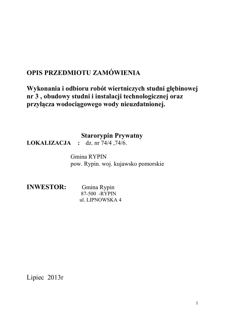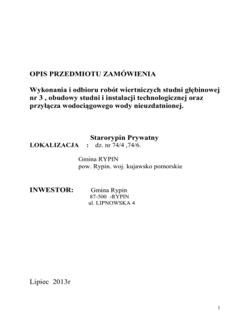 OPIS PRZEDMIOTU ZAMÓWIENIA Wykonania i odbioru robót wiertniczych studni głębinowej nr 3 , obudowy studni i instalacji technologicznej oraz przyłącza wodociągowego wody nieuzdatnionej. Starorypin Prywatny LOKALIZACJA : dz. nr 74/4 ,74/6. Gmina RYPIN pow. Rypin. woj. kujawsko pomorskie INWESTOR: Gmina Rypin 87-500 -RYPIN ul. LIPNOWSKA 4 Lipiec 2013r 1 1. CHARAKTERYSTYKA OGÓLNA 1.1. Określenie przedmiotu zamówienia Przedmiotem zamówienia jest : wykonanie odwiertu studni głębinowej nr 3 , obudowa studni głębinowej nr 3 oraz , instalacja technologiczna i przyłącze wodociągowe wody nieuzdatnionej od projektowanej studni głębinowej do istniejącego przewodu wody surowej.Wykonanie pozalicznikowego przyłącza energetycznego zasilającego głębinowy agregat pompowy oraz ogrodzenia strefy bezpośredniej. 1.2. Uczestnicy procesu inwestycyjnego 1/ Zamawiający: 2/ Finansujący: 3/ Organ nadzoru budowlanego 1.3. Charakterystyka przedsięwzięcia 1.3.1. Przeznaczenie zamierzenia inwestycyjnego Woda z projektowanej studni nr 3 wykorzystana zostanie dla celów socjalno bytowych mieszkańców gminy Rypin jak również stanowić będzie źródło zabezpieczenia p/poż. 1.3.2. Ogólny zakres robót - Roboty wiertnicze - Roboty budowlane Obudowa studni Ogrodzenie strefy bezpośredniej - Roboty instalacyjne > Instalacja pompowa studni głębinowej > Przyłącze wodociągowe wody nieuzdatnionej od proj studni do istn przewodu wody surowej Pozalicznikowe zasilanie w energię elektryczną pompy głębinowej 2 1.3.3. Zakres robót przewidziany do wykonania Odwiert studni głębinowej wykonany metodą udarową do głębokości 51.0m w/g projektu prac geologicznych. Obudowa studni głębinowej - Obudowa studni z kręgów żelbetowych zagłębionych w ziemi o średnicy 1,5 m. - Płyta fundamentowa wylewana na mokro z betonu B-15,gr 30cm , dozbrajana prętami stalowymi ø 4,5mm, na podkładzie betonowym gr 15 cm - Ściany obudowy z typowych prefabrykowanych kręgów żelbetowych o gr 12 cm i średnicy wewnętrznej 1500 mm, spoiny między kręgami wypełnione zaprawą cementowa - Przykrycie obudowy typową płytą średnicy 1740mm, żelbetową, prefabrykowaną, wyposażoną w szczelny właz stalowy o średnicy 600mm i komin wentylacyjny z PVC o średnicy 160mm - Izolacje poziome i pionowe z lepiku asfaltowego na gorąco na wysuszonej powierzchni dna i ściany zewnętrznej obudowy –dwukrotnie - drabinę wewnętrzną z rur stalowych o średnicy 25 mm - Głowica studni wierconej z rury stalowej o średnicy 408 mm Część instalacyjna – technologia - podwodny agregat pompowy typ GC 5.05 /uwaga dobór pompy głębinowej ostatecznie określony zostanie po wykonaniu odwiertu i ustaleniu zasobów eksploatacyjnych studni./ - głowica studni wierconej - przewód tłoczony/stalowy/ podwodnego agregatu pompowego o średnicy 100mm - zawór zwrotny, kołnierzowy średnicy 100mm - wodomierz śrubowy typu MZ ø 100mm - punkt poboru wody ø15mm 3 - czujnik poziomu lustra wody ELcluwo -skrzynka sterownicza usytuowana nazewnątrz obudowy studni. Przyłącze wodociągowe Przyłącze wodociągowe wody surowej z rur PVC śr 110mm i długości 8.0m. Włączenie proj przyłącza do istn przewodu wodociągowego wody nieuzdatnionej wg schematu montażowego . Węzeł wodociągowy z hydrantem nadziemnym śr 80mm. Ogrodzenie strefy bezpośredniej Ogrodzenie z siatki na słupkach stalowych z bramą wjazdową Zasilanie studni głębinowej Zasilanie w energię elektryczną poprzez wykonanie przyłącza pozalicznikowego kablem YAKY 4x3,5mm2 o długości 8.0 m.od istniejącego przewodu wraz ze skrzynką rozdzielczą. 1.4. Dokumentacja techniczna określająca przedmiot zamówienia i stanowiąca podstawę do realizacji - Projekt prac geologicznych ujęcia wód podziemnych z utworów czwartorzędowych opracowany przez HYDRO-GEO Helena Kubiak - Projekt budowlany obudowy studni głębinowej nr 3 w m. Starorypin, oraz przyłącza wodociągowego wody nieuzdatnionej od st. głębinowej do przewodu istn wody surowej opracowany przez firmę „OLMAR” Jerzy Olczak. 1.4.1. Zgodność robót z dokumentacją techniczną Wykonawca jest odpowiedzialny za jakość prac i ich zgodność z dokumentacją techniczną , specyfikacjami technicznymi i instrukcjami zarządzającego realizacją umowy. 2. Prowadzenie robót 2.1. Ogólne zasady wykonywania robót Wykonawca jest odpowiedzialny za prowadzenie robót zgodnie z umową i ścisłe przestrzeganie harmonogramu robót oraz za jakość zastosowanych 4 materiałów i wykonanych robót za zgodność z projektem wykonawczym, wymaganiami specyfikacji technicznych . 2.2. Teren budowy 2.2.1. Charakterystyka terenu budowy Teren jest uzbrojony w następującą infrastrukturę techniczną podziemną. - przewody wodociągowe - zasilanie w energię elektr istniejących studni 2.2.2. Przekazanie placu budowy Zamawiający protokólarnie przekazuje wykonawcy teren budowy na warunkach ogólnych umowy, podając wymagania niezbędne do prawidłowej organizacji robót Ochrona i utrzymanie terenu budowy Wykonawca będzie odpowiedzialny za ochronę placu budowy oraz wszystkich materiałów użytych do realizacji zadania od czasu rozpoczęcia do ostatecznego odbioru. W trakcie realizacji robót wykonawca utrzyma wszystkie niezbędne zabezpieczenia ruchu i urządzenia żeby zapewnić bezpieczeństwo całego ruchu kołowego i pieszego. Ochrona własności urządzeń Wykonawca jest odpowiedzialny za ochronę istniejących instalacji nadziemnych i podziemnych. Przed rozpoczęciem robót wykonawca powiadomi wszystkich zainteresowanych którzy są właścicielami uzbrojenia podziemnego i nadziemnego. Wykonawca spowoduje żeby: miejsce robót, instalacje i urządzenia zostały właściwie oznakowane i zabezpieczone przed uszkodzeniami. Ochrona środowiska w trakcie realizacji robót 5 W trakcie realizacji robót wykonawca jest zobowiązany do pełnej wiedzy i stosować się do przepisów zawartych we wszystkich regulac