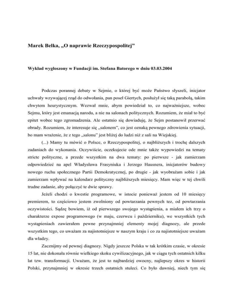 Marek Belka, „O naprawie Rzeczypospolitej” Wykład wygłoszony w Fundacji im. Stefana Batorego w dniu 03.03.2004 Podczas porannej debaty w Sejmie, o której być może Państwo słyszeli, inicjator uchwały wzywającej rząd do odwołania, pan poseł Giertych, posłużył się taką parabolą, takim chwytem heurystycznym. Wezwał mnie, abym powiedział to, co najważniejsze, wobec Sejmu, który jest emanacją narodu, a nie na salonach politycznych. Rozumiem, że miał to być epitet wobec tego zgromadzenia. Ale ostatnio się dowiaduję, że Sejm postanowił przerwać obrady. Rozumiem, że interesuje się „salonem”, co jest oznaką pewnego zdrowienia sytuacji, bo mam wrażenie, że z tego „salonu” jest bliżej do ludzi niż z sali na Wiejskiej. (...) Mamy tu mówić o Polsce, o Rzeczypospolitej, o najbliższych i trochę dalszych zadaniach do wykonania. Oczywiście, oczekujecie ode mnie także wypowiedzi na tematy stricte polityczne, a przede wszystkim na dwa tematy: po pierwsze - jak zamierzam odpowiedzieć na apel Władysława Frasyniuka i Jerzego Hausnera, inicjatorów budowy nowego ruchu społecznego Partii Demokratycznej, po drugie - jak wyobrażam sobie i jak zamierzam wpływać na kalendarz polityczny najbliższych miesięcy. Mam więc w tej chwili trudne zadanie, aby połączyć te dwie sprawy. Jeżeli chodzi o kwestie programowe, w istocie ponieważ jestem od 10 miesięcy premierem, to częściowo jestem zwolniony od powtarzania pewnych tez, od powtarzania oczywistości. Sądzę bowiem, iż od pierwszego swojego wystąpienia, a miałem ich trzy o charakterze expose programowego (w maju, czerwcu i październiku), we wszystkich tych wystąpieniach zawierałem pewne przynajmniej elementy mojej diagnozy, ale przede wszystkim tego, co uważam za najistotniejsze w naszym kraju i co za najistotniejsze uważam dla władzy. Zacznijmy od pewnej diagnozy. Nigdy jeszcze Polska w tak krótkim czasie, w okresie 15 lat, nie dokonała równie wielkiego skoku cywilizacyjnego, jak w ciągu tych ostatnich kilku lat tzw. transformacji. Uważam, że jest to najbardziej owocny, najlepszy okres w historii Polski, przynajmniej w okresie trzech ostatnich stuleci. Co było dawniej, niech tym się zajmują historycy. 15 lat niesłychanego sukcesu, cudu. Nie cudu rynkowego, nie tylko, ale cudu „nad skryptem” - 2 miliony studentów zamiast 300 tysięcy, kiedy ja byłem studentem (może jeszcze mniej). Cudu w zakresie stylu życia. Dzisiaj żyjemy podobno 5 lat, niektórzy mówią, że więcej lat dłużej niż zaledwie kilkanaście lat temu. Nie tylko dlatego, że są lepsze metody leczenia, coraz droższe, a więc wprowadzające zdrowie w permanentny kryzys, ale także że żyjemy lepiej - lepiej się odżywiamy, lepiej pracujemy (...) Społeczeństwo, pytane przez socjologów, jest zdegustowane już nie tylko klasą polityczną, ale ludzie mówią, że Polska idzie w złym kierunku. Generalnie żyjemy w przekonaniu, że Polacy są pesymistami. Nie wyobrażam sobie, jakim szokiem musiała być pierwsza strona "Rzeczpospolitej" z dnia wczorajszego (2 marca - przyp. CIR), kiedy okazało się, że jeżeli przymierzyć obiektywne kryteria, które badają nie opinie, a zachowania ludzi, to jesteśmy najbardziej optymistycznym narodem w Europie. A dlaczego? Bo pesymiści nie biorą kredytów. Kredytów hipotecznych, a nie kredytów „chwilówek”, w SKOK-ach, do przeżycia do następnego wtorku. Tylko ktoś, kto ma jednoznacznie optymistyczny obraz przyszłości swojej i swojej rodziny, bierze kredyt hipoteczny. Nigdzie w Europie nie ma takiej dynamiki jak w Polsce. Jak Polaków pytają, jakich zakupów dóbr trwałego użytku chcą dokonać, to mówią, jakie mają plany w stosunku do swoich dzieci, dokąd chcą je posłać do szkół. Okazuje się, że zmiana na lepsze w tym zakresie w Polsce jest najsilniejsza w całej Europie. Jeżeli pytają dzisiaj przedsiębiorców nie o to, czy podatki są za duże, bo przecież nawet najgłupszy przedsiębiorca powie, że są za wysokie, tylko czy zamierza dokonywać ekspansji swojego przedsiębiorstwa i na jakie rynki, czy zamierza inwestować, to na tej podstawie okazuje się, że polscy przedsiębiorcy i polscy konsumenci są nie najbardziej optymistyczni, są zdecydowanie najbardziej optymistyczni w całej Europie. Z drugiej strony rząd jest do bani, Sejm jest do bani, wszystko jest do bani. Trzeba by wyjaśnić, skąd się to wzięło. Myślę, że wzięło się to stąd, że myśmy tę gospodarkę rynkową i demokrację niejako dostali w prezencie. Niektórzy mogą powiedzieć, że została ona nam niejako narzucona. Myśmy do niej nie dorastali, chociaż zawsze powtarzałem, że jesteśmy krajem tolerancyjnym i krajem o bardzo długich tradycjach demokratycznych. Oczywiście, to jest inna demokracja. Nie ta, która się budowała w krajach Europy Zachodniej przez ostatnich kilkaset lat, a już na pewno przez ostatnich sto kilkadziesiąt lat. Myśmy przez 15 lat musieli przejść drogę budowania instytucji: instytucji demokratycznych, ale i instytucji gospodarki rynkowej, w tempie super-ekspresowym. Przez to ci, którzy mówią, że w Polsce reformy idą za wolno, po prostu bredzą, nie wiedzą, o czym mówić. I co 2 za tym idzie, nasza świadomość, nasze przygotowanie, ale także nasze nawyki pozostały w tyle. Poza tym my nie uznaliśmy, że te przemiany są nasze. Owszem 30, a może 40 proc., w następnym pokoleniu będzie już 50 albo 60 proc. ludzi uważających, że to jest nasze, że to jest nasz sukces. Ale w tym pokoleniu, do którego ja należę, prawdopodobnie większość ludzi uznaje, że to jest coś narzuconego, coś zewnętrznego. A jeżeli zewnętrzne, to trzeba się z tym jakoś uporać. Polskie społeczeństwo ma długą tradycję radzenia sobie z czymś obcym. Wiemy, skąd się to bierze - z historii. Nasze społeczeństwo znakomicie się do tego dostosowało. Ludzie sobie radzą lepiej, niż mówią, że sobie radzą, ale