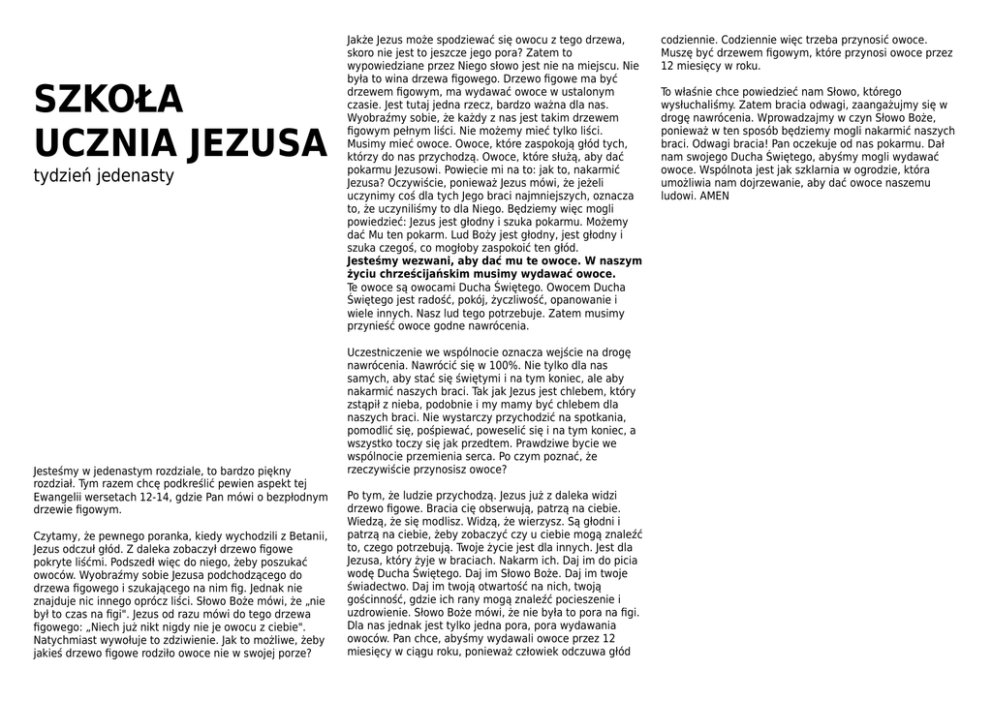 SZKOŁA UCZNIA JEZUSA tydzień jedenasty Jesteśmy w jedenastym rozdziale, to bardzo piękny rozdział. Tym razem chcę podkreślić pewien aspekt tej Ewangelii wersetach 12-14, gdzie Pan mówi o bezpłodnym drzewie figowym. Czytamy, że pewnego poranka, kiedy wychodzili z Betanii, Jezus odczuł głód. Z daleka zobaczył drzewo figowe pokryte liśćmi. Podszedł więc do niego, żeby poszukać owoców. Wyobraźmy sobie Jezusa podchodzącego do drzewa figowego i szukającego na nim fig. Jednak nie znajduje nic innego oprócz liści. Słowo Boże mówi, że „nie był to czas na figi". Jezus od razu mówi do tego drzewa figowego: „Niech już nikt nigdy nie je owocu z ciebie". Natychmiast wywołuje to zdziwienie. Jak to możliwe, żeby jakieś drzewo figowe rodziło owoce nie w swojej porze? Jakże Jezus może spodziewać się owocu z tego drzewa, skoro nie jest to jeszcze jego pora? Zatem to wypowiedziane przez Niego słowo jest nie na miejscu. Nie była to wina drzewa figowego. Drzewo figowe ma być drzewem figowym, ma wydawać owoce w ustalonym czasie. Jest tutaj jedna rzecz, bardzo ważna dla nas. Wyobraźmy sobie, że każdy z nas jest takim drzewem figowym pełnym liści. Nie możemy mieć tylko liści. Musimy mieć owoce. Owoce, które zaspokoją głód tych, którzy do nas przychodzą. Owoce, które służą, aby dać pokarmu Jezusowi. Powiecie mi na to: jak to, nakarmić Jezusa? Oczywiście, ponieważ Jezus mówi, że jeżeli uczynimy coś dla tych Jego braci najmniejszych, oznacza to, że uczyniliśmy to dla Niego. Będziemy więc mogli powiedzieć: Jezus jest głodny i szuka pokarmu. Możemy dać Mu ten pokarm. Lud Boży jest głodny, jest głodny i szuka czegoś, co mogłoby zaspokoić ten głód. Jesteśmy wezwani, aby dać mu te owoce. W naszym życiu chrześcijańskim musimy wydawać owoce. Te owoce są owocami Ducha Świętego. Owocem Ducha Świętego jest radość, pokój, życzliwość, opanowanie i wiele innych. Nasz lud tego potrzebuje. Zatem musimy przynieść owoce godne nawrócenia. Uczestniczenie we wspólnocie oznacza wejście na drogę nawrócenia. Nawrócić się w 100%. Nie tylko dla nas samych, aby stać się świętymi i na tym koniec, ale aby nakarmić naszych braci. Tak jak Jezus jest chlebem, który zstąpił z nieba, podobnie i my mamy być chlebem dla naszych braci. Nie wystarczy przychodzić na spotkania, pomodlić się, pośpiewać, poweselić się i na tym koniec, a wszystko toczy się jak przedtem. Prawdziwe bycie we wspólnocie przemienia serca. Po czym poznać, że rzeczywiście przynosisz owoce? Po tym, że ludzie przychodzą. Jezus już z daleka widzi drzewo figowe. Bracia cię obserwują, patrzą na ciebie. Wiedzą, że się modlisz. Widzą, że wierzysz. Są głodni i patrzą na ciebie, żeby zobaczyć czy u ciebie mogą znaleźć to, czego potrzebują. Twoje życie jest dla innych. Jest dla Jezusa, który żyje w braciach. Nakarm ich. Daj im do picia wodę Ducha Świętego. Daj im Słowo Boże. Daj im twoje świadectwo. Daj im twoją otwartość na nich, twoją gościnność, gdzie ich rany mogą znaleźć pocieszenie i uzdrowienie. Słowo Boże mówi, że nie była to pora na figi. Dla nas jednak jest tylko jedna pora, pora wydawania owoców. Pan chce, abyśmy wydawali owoce przez 12 miesięcy w ciągu roku, ponieważ człowiek odczuwa głód codziennie. Codziennie więc trzeba przynosić owoce. Muszę być drzewem figowym, które przynosi owoce przez 12 miesięcy w roku. To właśnie chce powiedzieć nam Słowo, którego wysłuchaliśmy. Zatem bracia odwagi, zaangażujmy się w drogę nawrócenia. Wprowadzajmy w czyn Słowo Boże, ponieważ w ten sposób będziemy mogli nakarmić naszych braci. Odwagi bracia! Pan oczekuje od nas pokarmu. Dał nam swojego Ducha Świętego, abyśmy mogli wydawać owoce. Wspólnota jest jak szklarnia w ogrodzie, która umożliwia nam dojrzewanie, aby dać owoce naszemu ludowi. AMEN Wtorek Środa Czwartek Mk 11,1-6 Gdy się zbliżali do Jerozolimy, do Betfage i Betanii na Górze Oliwnej, posłał dwóch spośród swoich uczniów i rzekł im: «Idźcie do wsi, która jest przed wami, a zaraz przy wejściu do niej znajdziecie oślę uwiązane, na którym jeszcze nikt z ludzi nie siedział. Odwiążcie je i przyprowadźcie tutaj! A gdyby was kto pytał, dlaczego to robicie, powiedzcie: Pan go potrzebuje i zaraz odeśle je tu z powrotem». Poszli i znaleźli oślę przywiązane do drzwi z zewnątrz, na ulicy. Odwiązali je, a niektórzy ze stojących tam pytali ich: «Co to ma znaczyć, że odwiązujecie oślę?» Oni zaś odpowiedzieli im tak, jak Jezus polecił. I pozwolili im. Mk 11,7-11 Przyprowadzili więc oślę do Jezusa i zarzucili na nie swe płaszcze, a On wsiadł na nie. Wielu zaś słało swe płaszcze na drodze, a inni gałązki ścięte na polach. A ci, którzy Go poprzedzali i którzy szli za Nim, wołali: «Hosanna! Błogosławiony Ten, który przychodzi w imię Pańskie. Błogosławione królestwo ojca naszego Dawida, które przychodzi. Hosanna na wysokościach!» Tak przybył do Jerozolimy i wszedł do świątyni. Obejrzał wszystko, a że pora była już późna, wyszedł razem z Dwunastoma do Betanii. Mk 11,12-14 Nazajutrz, gdy wyszli oni z Betanii, uczuł głód. A widząc z daleka drzewo figowe, okryte liśćmi, podszedł ku niemu zobaczyć, czy nie znajdzie czegoś na nim. Lecz przyszedłszy bliżej, nie znalazł nic prócz liści, gdyż nie był to czas na figi. Wtedy rzekł do drzewa: «Niech nikt nigdy nie je owocu z ciebie!» Słyszeli to Jego uczniowie. ------------------------------ ----------------------------------------------------------Czy potrafisz być posłuszny Panu Jezusowi? Do czego zaprasza Cię dzisiaj? Co Ci dzisiaj Jezus polecił? Co odpowiadasz ludziom gdy pytają Cię o wiarę? Czy uwielbiasz każdego dnia Pana? Czy modlisz się jak na spotkaniach wspólnoty uwielbiając Pana? Czy dostrzegasz w Jezusie Króla, który przychodzi z pokojem? Czy można prowadzić wojnę si
