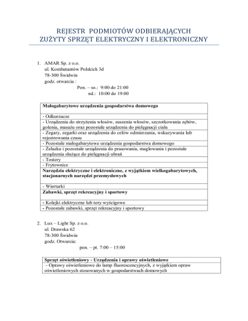 REJESTR PODMIOTOW ODBIERAJĄCYCH ZUZYTY SPRZĘT ELEKTRYCZNY I ELEKTRONICZNY 1. AMAR Sp. z o.o. ul. Kombatantów Polskich 3d 78-300 Świdwin godz. otwarcia : Pon. – so.: 9:00 do 21:00 nd.: 10:00 do 19:00 Małogabarytowe urządzenia gospodarstwa domowego - Odkurzacze - Urządzenia do strzyżenia włosów, suszenia włosów, szczotkowania zębów, golenia, masażu oraz pozostałe urządzenia do pielęgnacji ciała - Zegary, zegarki oraz urządzenia do celów odmierzania, wskazywania lub rejestrowania czasu - Pozostałe małogabarytowe urządzenia gospodarstwa domowego - Żelazka i pozostałe urządzenia do prasowania, maglowania i pozostałe urządzenia służące do pielęgnacji ubrań - Tostery - Frytownice Narzędzia elektryczne i elektroniczne, z wyjątkiem wielkogabarytowych, stacjonarnych narzędzi przemysłowych - Wiertarki Zabawki, sprzęt rekreacyjny i sportowy - Kolejki elektryczne lub tory wyścigowe - Pozostałe zabawki, sprzęt rekreacyjny i sportowy 2. Lux – Light Sp. z o.o. ul. Drawska 62 78-300 Świdwin godz. Otwarcia: pon. – pt. 7:00 – 15:00 Sprzęt oświetleniowy - Urządzenia i oprawy oświetleniowe - Oprawy oświetleniowe do lamp fluorescencyjnych, z wyjątkiem opraw oświetleniowych stosowanych w gospodarstwach domowych 3. P.U.H. KRIS Krzysztof Rzepecki, ul. 3 Marca 52, 78-300 Świdwin godz. Otwarcia : pon. – pt.: 10:00 do 18:00 so.: 10:00 do 14:00 Małogabarytowe urządzenia gospodarstwa domowego - Pozostałe małogabarytowe urządzenia gospodarstwa domowego Sprzęt teleinformatyczny i telekomunikacyjny - Komputery osobiste: Telefony komórkowe - Komputery osobiste: Pozostałe produkty lub sprzęt służący do transmisji głosu, obrazu lub innych informacji za pomocą technologii telekomunikacyjnej 4. Zakład Usług Komunalnych Sp. z o.o. ul. Armii Krajowej 21 78- 300 Świdwin godz. Otwarcia: pon. – pt. : 7:00 do 15:00 Wielkogabarytowe urządzenia gospodarstwa domowego Wielkogabarytowe urządzenia chłodzące Elektryczne płyty grzejne Mikrofalówki Pozostałe wielkogabarytowe urządzenia używane do gotowania i innego typu przetwarzania żywności Elektryczne urządzenia grzejne Grzejniki elektryczne Pozostałe wielkogabarytowe urządzenia używane do ogrzewania pomieszczeń, łóżek, mebli wypoczynkowych Wentylatory elektryczne Urządzenia klimatyzacyjne Pozostały sprzęt wentylujący, wyciągi wentylacyjne i sprzęt konfekcjonujący Chłodziarki Zamrażarki Pozostałe wielkogabarytowe urządzenia używane do chłodzenia, konserwowania i przechowywania żywności Pralki Suszarki do ubrań Zmywarki Urządzenia kuchenne, w tym kuchenki Piece elektryczne Małogabarytowe urządzenia gospodarstwa domowego Odkurzacze Urządzenia do strzyżenia włosów, suszenia włosów, szczotkowania zębów, golenia, masażu oraz pozostałe urządzenia do pielęgnacji ciała Zegary, zegarki oraz urządzenia do celów odmierzania, wskazywania lub rejestrowania czasu Wagi Pozostałe małogabarytowe urządzenia gospodarstwa domowego Zamiatacze do dywanów Pozostałe urządzenia czyszczące Urządzenia używane do szycia, dziania, tkania i innego typu przetwarzania wyrobów włókienniczych Żelazka i pozostałe urządzenia do prasowania, maglowania i pozostałe urządzenia służące do pielęgnacji ubrań Tostery Frytkownice Rozdrabniacze, młynki do kawy oraz urządzenia do otwierania i zamykania pojemników i opakowań Noże elektryczne Sprzęt teleinformatyczny i telekomunikacyjny Scentralizowane przetwarzanie danych: Komputery duże Scentralizowane przetwarzanie danych: Stacje robocze Scentralizowane przetwarzanie danych: Jednostki drukujące Komputery osobiste: Komputery osobiste stacjonarne, w tym procesor, mysz, monitor i klawiatura Komputery osobiste: Terminale i systemy użytkownika Komputery osobiste: Faksy Komputery osobiste: Teleksy Komputery osobiste: Telefony Komputery osobiste: Automaty telefoniczne Komputery osobiste: Telefony bezprzewodowe Komputery osobiste: Telefony komórkowe Komputery osobiste: Systemy zgłoszeniowe/ sekretarki automatyczne Komputery osobiste: Pozostałe produkty lub sprzęt służący do transmisji głosu, obrazu lub innych informacji za pomocą technologii telekomunikacyjnej Komputery osobiste: Laptopy, w tym procesor, mysz, monitor i klawiatura Komputery osobiste: Notebooki Komputery osobiste: Notepady Komputery osobiste: Drukarki Komputery osobiste: Sprzęt kopiujący Komputery osobiste: Elektryczne i elektroniczne maszyny do pisania Komputery osobiste: Kalkulatory kieszonkowe i biurowe Komputery osobiste: Pozostały sprzęt do zbierania, przechowywania, przetwarzania, prezentowania lub przekazywania informacji drogą elektroniczną Sprzęt audiowizualny Odbiorniki radiowe Odbiorniki telewizyjne Kamery video Sprzęt video Sprzęt hi-fi Wzmacniacze dźwięku Instrumenty muzyczne Pozostałe produkty lub sprzęt do celów nagrywania lub odtwarzania dźwięku lub obrazów, w tym sygnałów lub innych technologii, dystrybucji dźwięku i obrazu za pomocą technologii telekomunikacyjnych Sprzęt oświetleniowy - Urządzenia i oprawy oświetleniowe Oprawy oświetleniowe do lamp fluorescencyjnych, z wyjątkiem opraw oświetleniowych stosowanych w gospodarstwach domowych Sprzęt oświetleniowy - Lampy wszelkiego rodzaju Liniowe lampy fluorescencyjne Kompaktowe lampy fluorescencyjne Wysokoprężne lampy wyładowcze, w tym ciśnieniowe lampy sodowe oraz lampy metalohalogenkowe Niskoprężne lampy sodowe Sprzęt oświetleniowy - Urządzenia i oprawy oświetleniowe Pozostałe urządzenia oświetleniowe służące do celów rozpraszania i kontroli światła, z wyjątkiem żarówek Narzędzia elektryczne i elektroniczne, z wyjątkiem wielkogabarytowych, stacjonarnych narzędzi przemysłowych Wiertarki Piły Maszyny do szycia Urządzenia do skręcania, mielenia, piaskowania, przemiału, piłowania, cięcia, nawiercania, robienia otworów, nabijania, składania, gięcia lub podobnych metod przetwarzania drewna, metalu i innych materiałów Narzędzi