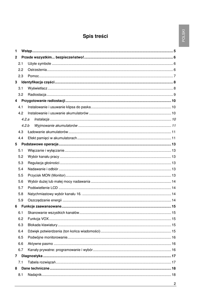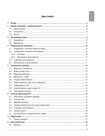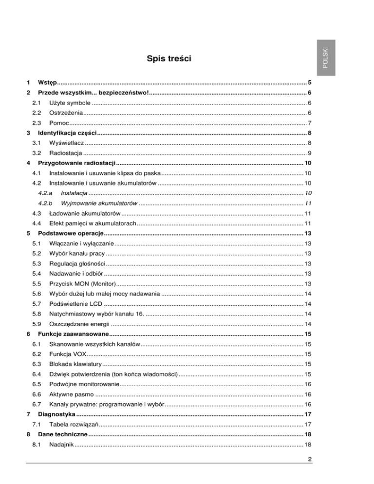 POLSKI (tłumaczenie i opracowanie z oryginału angielskiego) Spis treści 1 Wstęp ................................................................................................................................................ 5 2 Przede wszystkim... bezpieczeństwo! ........................................................................................... 6 3 4 5 6 7 2.1 Użyte symbole ............................................................................................................................ 6 2.2 Ostrzeżenia ................................................................................................................................. 6 2.3 Pomoc ......................................................................................................................................... 7 Identyfikacja części ......................................................................................................................... 8 3.1 Wyświetlacz ................................................................................................................................ 8 3.2 Radiostacja ................................................................................................................................. 9 Przygotowanie radiostacji ............................................................................................................ 10 4.1 Instalowanie i usuwanie klipsa do paska .................................................................................. 10 4.2 Instalowanie i usuwanie akumulatorów .................................................................................... 10 4.2.a Instalacja ............................................................................................................................ 10 4.2.b Wyjmowanie akumulatorów ............................................................................................... 11 4.3 Ładowanie akumulatorów ......................................................................................................... 11 4.4 Efekt pamięci w akumulatorach ................................................................................................ 11 Podstawowe operacje ................................................................................................................... 13 5.1 Włączanie i wyłączanie ............................................................................................................. 13 5.2 Wybór kanału pracy .................................................................................................................. 13 5.3 Regulacja głośności .................................................................................................................. 13 5.4 Nadawanie i odbiór ................................................................................................................... 13 5.5 Przycisk MON (Monitor)............................................................................................................ 13 5.6 Wybór dużej lub małej mocy nadawania .................................................................................. 14 5.7 Podświetlenie LCD ................................................................................................................... 14 5.8 Natychmiastowy wybór kanału 16. ........................................................................................... 14 5.9 Oszczędzanie energii ............................................................................................................... 14 Funkcje zaawansowane ................................................................................................................ 15 6.1 Skanowanie wszystkich kanałów .............................................................................................. 15 6.2 Funkcja VOX ............................................................................................................................. 15 6.3 Blokada klawiatury .................................................................................................................... 15 6.4 Dźwięk potwierdzenia (ton końca wiadomości) ........................................................................ 15 6.5 Podwójne monitorowanie.......................................................................................................... 16 6.6 Aktywne pasmo ........................................................................................................................ 16 6.7 Kanały prywatne: programowanie i wybór ................................................................................ 16 Diagnostyka ................................................................................................................................... 17 7.1 8 Tabela rozwiązań ...................................................................................................................... 17 Dane techniczne ............................................................................................................................ 18 8.1 Nadajnik .................................................................................................................................... 18 2 8.2 9 Odbiornik ...................................................................................................................................18 Tabela częstotliwości ....................................................................................................................19 POLSKI 1 WSTĘP Nowa ręczna radiostacja morska PACIFIC jest w stanie spełnić wymagania komunikacyjne dla wszystkich rodzajów nawigacji, zarówno profesjonalnych, jak i hobbystycznych. PACIFIC jest solidna, zaawansowana elektronicznie oraz umożliwia czytelną i pewną komunikację w morskim paśmie VHF na wszystkich kanałach przypisanych przez ITU. Oferuje ona bezpieczeństwo dla wszystkich nawigacyjnych wyma