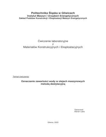 Politechnika l ska w Gliwicach Instytut Maszyn i Urz dze Energetycznych Zakład Podstaw Konstrukcji i Eksploatacji Maszyn Energetycznych wiczenie laboratoryjne z Materiałów Konstrukcyjnych i Eksploatacyjnych Temat wiczenia: Oznaczanie zawarto ci wody w olejach maszynowych metod destylacyjn Opracował: Marian Lipka Gliwice, 2003 1. WPROWADZENIE 1.1. Poj cia ogólne rodkiem smarnym nazywa si ka d substancje, któr stosuje si w celu zmniejszenia oporów tarcia. rodkiem smarnym mo e by olej lub inna ciecz, smar plastyczny, gaz albo ciało stałe (np. grafit lub dwusiarczek molibdenu) o budowie płytkowej. Przy rozpatrywaniu zagadnie eksploatacyjnych maszyn i urz dze , olej nale y traktowa jako jeden z elementów konstrukcji. Znajomo własno ci charakteryzuj cych energetyczne oleje smarowe oraz ich powi zania z funkcjami eksploatacyjnymi, pozwala na wła ciwy ich dobór do maszyn i urz dze energetycznych oraz poprawne ich u ytkowanie. Elementami weryfikuj cymi jako stosowanych olejów energetycznych s specyficzne warunki pracy urz dze energetycznych, takich jak turbiny, pompy wody zasilaj cej, młyny, spr arki, itp. Ogólnie mo na przyj , e: OLEJ SMAROWY = OLEJ BAZOWY + DODATKI USZLACHETNIAJ CE Ilo , rodzaj i wzajemne proporcje komponentów decyduj fizykochemicznych i jako ci oleju smarowego. o parametrach zwi zki organiczne lub Rol dodatków uszlachetniaj cych spełniaj nieorganiczne, których zawarto w oleju smarnym wynosi od 0,1 ÷ 30 % obj to ci. Spełniaj one nast puj ce funkcje: - wzmacniaj istniej ce wła ciwo ci oleju bazowego (antyutleniacze, inhibitory, rodki antypienne, deemulgatory), - poprawiaj niekorzystne własno ci oleju bazowego (depresatory, wsikozatory), - wprowadzaj nowe własno ci do olejów bazowych (dodatki EP (extrapressure), AW (anti-wear), detergenty, deaktywatory metali, zag szczacze). - Olejem bazowym mo e by : olej organiczny (mineralny), pozyskiwany z przeróbki ropy naftowej poprzez destylacj 1 lub rektyfikacj 2; zło ony jest z wielu zwi zków chemicznych, które nie s idealnie czyste, ale za to tanie i łatwo dost pne, 1 Destylacja jest operacj wykonywana jednokrotnie, której celem jest rozdzielenie mieszaniny cieczy na jej składniki. Polega ona na odparowaniu cieczy, odebraniu i skropleniu powstałych par. Ciecz skroplona bogatsza w składnik lotniejszy nazywana jest destylatem, natomiast pozostało nieodparowana nazywa si ciecz wyczerpan (pogonem). Podstaw rozdziału stanowi tutaj ró nica w lotno ci składników. Efektywno rozdzielania na drodze destylacji jest w wielu przypadkach niewystarczaj ca (np. dwa lub wi cej składników mieszaniny wrze w podobnej temperaturze), gdy powstaje kilka frakcji po rednich zawieraj cych co najmniej dwa składniki. W takim przypadku stosuje si rektyfikacj na kolumnach rektyfikacyjnych, w których zachodzi kilkana cie nast puj cych po sobie destylacji. Aby otrzyma czyste składniki konieczne jest wtedy wielokrotne odparowanie cieczy i skroplenie par. Destylacja i jej specyficzna odmiana - rektyfikacja – s operacjami, które pozwalaj na rozdzielanie ciekłych surowców naturalnych, mieszanin poreakcyjnych dwu- i wieloskładnikowych. Otrzymywane produkty charakteryzuj si wysokim stopniem czysto ci. Wielokrotne odparowanie cieczy i skroplenie par mo na uzyska albo powtarzaj c wielokrotnie destylacj lub przeprowadzaj c jedn operacj nazywan rektyfikacj . Destylacja prosta polega na stałym odprowadzaniu oparów znad cieczy. W miar trwania destylacji opary zmieniaj swój skład. Wobec odparowywania przede wszystkim składnika lotniejszego w destylowanej cieczy zmniejsza si jego st enie. W rezultacie, kolejne partie destylatu zawieraj coraz mniej składnika lotniejszego. Po zako czeniu procesu skład cieczy wyczerpanej nie jest wi c w równowadze ze składem cało ci otrzymanego destylatu, lecz z jego ostatni frakcj . Przykładem tego typu destylacji jest destylacja w kolbie z ci głym odbieraniem oparów. 2 Rektyfikacja polega na przeciwpr dowym zetkni ciu si cieczy i par z jednoczesn wymian masy i ciepła. W trakcie procesu, podczas kontaktu unosz cych si par ze spływaj c ciecz , z par wykropleniu ulega mieszanina zubo ona o składnik lotny, z cieczy za odparowuje mieszanina wzbogacona o składnik lotny. Jednocze nie wydzielone ciepło kondensacji frakcji wykraplaj cej si z oparów 2 - - olej syntetyczny, powstały na wskutek bada naukowych na drodze polimeryzacji; jego struktura jest ci le zdefiniowana (jednorodna budowa chemiczna), nie posiada zanieczyszcze chemicznych, jednak jest toksyczny i drogi, tak e ze wzgl du na kosztown utylizacj , olej półsyntetyczny, czyli mieszanina oleju mineralnego i syntetycznego; jego wła ciwo ci s zale ne od wzajemnego udziału poszczególnych składników. - Podstawowymi wymaganiami stawianymi olejom bazowym s : dobra kompatybilno z dodatkami uszlachetniaj cymi, antyutleniacze, dodatki antyrdzewne i antykorozyjne, dobra odporno na utlenianie, dobra termostabilno , krótki czas rozdziału emulsji olej – woda, krótki czas wydzielania powietrza, niska skłonno do pienienia, odpowiednie własno ci reologiczne w niskich temperaturach. - Podstawowymi funkcjami oleju smarowego s : kontrola tarcia, kontrola zu ycia, kontrola korozji, kontrola temperatury, kontrola zanieczyszcze , transmisja mocy. - takimi jak Zanieczyszczeniem oleju nazywa si ka d substancj wyst puj c w oleju, która olejem nie jest i nie stanowi jego integralnej cz ci. Do zanieczyszcze oleju mo na zaliczy : - zanieczyszczenia stałe, - wilgo , - powietrze i inne gazy, wykorzystywane jest do odp dzenia frakcji odparowuj cej z cieczy. W konsekwencji tych procesów przechodz ce przez kolumn opary wzbogacaj si w składnik najbardziej lotny, za ciecz spływaj ca w dół kolumny wzbogacana jest w składnik mniej lotny. Pary dochodz ce do szczytu kolumny s skraplane. Warunkiem przeprowadzenia rektyfikacji jest zawracana cz ci kondensatu z powrotem do kondensatu odbierana jest jako destylat. kolumny. Oznacza to, e jedynie cz Za