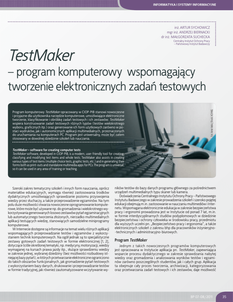 in¿. ARTUR SYCHOWICZ mgr in¿. ANDRZEJ BIERNACKI dr in¿. MA£GORZATA SUCHECKA Centralny Instytut Ochrony Pracy – Pañstwowy Instytut Badawczy TestMaker Program komputerowy TestMaker opracowany w CIOP-PIB stanowi nowoczesne i przyjazne dla u¿ytkownika narzêdzie komputerowe, umo¿liwiaj¹ce elektroniczne tworzenie, klasyfikowanie i obróbkê zadañ testowych i ich zestawów. TestMaker wspiera konstruowanie zadañ testowych ró¿nych typów (testów wielokrotnego wyboru, graficznych itp.) oraz generowanie ich form u¿ytkowych zarówno w postaci wydruków, jak i autonomicznych aplikacji multimedialnych, przeznaczonych do uruchamiania na komputerach PC. Program jest uniwersalny, mo¿e byæ zatem stosowany w dowolnej dziedzinie szkoleñ lub nauczania. Fot. Ante Vekic/Stock.XCHNG – program komputerowy wspomagaj¹cy tworzenie elektronicznych zadañ testowych TestMaker – software for creating computer tests TestMaker software, developed in CIOP-PIB, is a modern, user-friendly tool for creating, classifying and modifying test items and whole tests. TestMaker also assists in creating various types of test items (multiple choice tests, graphic tests, etc.) and in generating their forms both as print-outs and standalone multimedia apps for PCs. The program is universal, so it can be used in any area of training or teaching. Szeroki zakres tematyczny szkoleñ i innych form nauczania, oprócz materia³ów edukacyjnych, wymaga równie¿ zastosowania środków dydaktycznych umo¿liwiaj¹cych sprawdzanie poziomu przyswojenia wiedzy przez s³uchaczy, a tak¿e przeprowadzenie egzaminów. Na tym polu du¿e mo¿liwości stwarza nowoczesne oprogramowanie komputerowe, które mo¿e byæ u¿ywane np. do gromadzenia i wielokrotnego wykorzystywania generowanych losowo zestawów pytañ egzaminacyjnych lub automatycznego tworzenia z³o¿onych, nierzadko multimedialnych aplikacji testuj¹cych wiedzê, stanowi¹cych samodzielne miniprogramy komputerowe. W Internecie dostêpne s¹ informacje na temat wielu ró¿nych aplikacji wspomagaj¹cych przeprowadzanie testów i egzaminów z wykorzystaniem technik komputerowych. Na ogó³ jednak s¹ to specjalistyczne zestawy gotowych zadañ testowych w formie elektronicznej [1, 2], dotycz¹ce ściśle określonej tematyki, np. medycyny, motoryzacji, wiedzy wymaganej na kursach prawa jazdy itp., s³u¿¹ce sprawdzeniu wiedzy w zakresie jednej, wybranej dziedziny (bez mo¿liwości rozbudowy istniej¹cej bazy pytañ), w których przetwarzanie elektroniczne ograniczono do takich obszarów funkcjonalnych, jak gromadzenie pytañ testowych z wykorzystaniem bazy danych, drukowanie i przeprowadzanie testów w formie tradycyjnej, jak równie¿ zautomatyzowane wczytywanie wy- ników testów do bazy danych programu g³ównego za pośrednictwem urz¹dzeñ multimedialnych typu skaner lub kamera. Doświadczenia Centralnego Instytutu Ochrony Pracy – Pañstwowego Instytutu Badawczego w zakresie prowadzenia szkoleñ i szeroko pojêtej edukacji obejmuj¹ m.in. zastosowanie w nauczaniu multimediów i Internetu. Wspomagana elektronicznie edukacja w zakresie bezpieczeñstwa pracy i ergonomii prowadzona jest w Instytucie od ponad 7 lat, m.in. w formie interdyscyplinarnych studiów podyplomowych w dziedzinie bezpieczeñstwa i ochrony cz³owieka w środowisku pracy, przedmiotu dla wy¿szych uczelni pn. „Bezpieczeñstwo pracy i ergonomia”, a tak¿e elektronicznych szkoleñ z zakresu bhp dla pracowników in¿ynieryjno-technicznych i administracyjno-biurowych. Program TestMaker Jednym z takich nowoczesnych programów komputerowych jest opracowana w Instytucie aplikacja pn. TestMaker, zapewniaj¹ca wsparcie procesu dydaktycznego w zakresie sprawdzania nabytej wiedzy oraz gromadzenia i analizowania wyników testów i egzaminów zarówno poszczególnych studentów, jak i ca³ych grup. Aplikacja ta obejmuje ca³y proces tworzenia, archiwizacji, kategoryzowania oraz przetwarzania zadañ testowych i ich zestawów, daje mo¿liwośæ BP 07-08/2011 35 wykorzystania testów zarówno w tradycyjnej formie drukowanej, jak i elektronicznej – w postaci indywidualnie generowanych samodzielnych aplikacji egzaminacyjnych lub treningowych. Oprogramowanie umo¿liwia tak¿e opracowywanie, kategoryzowanie oraz wielokrotne wykorzystywanie zadañ testowych ró¿nych typów o dowolnym zakresie merytorycznym. Wspomaga poza tym gromadzenie wyników testów sprawdzaj¹cych wiedzê oraz analizowanie rezultatów w ró¿nych aspektach. Warto te¿ zaznaczyæ, ¿e TestMaker dzia³a pod wszystkimi najpopularniejszymi wersjami systemu operacyjnego MS Windows, czyli: 2000/XP/2003/2008/Vista oraz 7. Wszystkie funkcje programu udostêpnia przyjazny dla u¿ytkownika, intuicyjny interfejs, zapewniaj¹cy ³atwy dostêp do funkcjonalności oprogramowania oraz wygodn¹ pracê nad przygotowywaniem zadañ testowych oraz ró¿nych form ich mo¿liwego wykorzystywania. Menu g³ówne programu (rys. 1.) zawiera 4 podstawowe pozycje: Pytania, Testy, Statystyki, Konfiguracja. Opcje te kieruj¹ u¿ytkownika do kolejnych zestawów funkcji, umo¿liwiaj¹cych wykonywanie nastêpuj¹cych czynności: • Pytania – tworzenie, modyfikowanie, usuwanie, gromadzenie i kategoryzowanie pojedynczych zadañ testowych, mog¹cych stanowiæ elementy dowolnych zestawów egzaminacyjnych lub treningowych • Testy – tworzenie, modyfikowanie, usuwanie, gromadzenie i kategoryzowanie zestawów testowych oraz generowanie na ich bazie samodzielnych aplikacji egzaminacyjnych, przeznaczonych do elektronicznego sprawdzania wiedzy studentów oraz zapisywania raportów z wynikami wykonanego egzaminu • Statystyki – importowanie lub wpisywanie wyników zestawów testowych oraz wykonywanie zestawieñ statystycznych wyników egzaminów, uzyskanych za pomoc¹ aplikacji egzaminacyjnych • Konfiguracja – dostosowywanie definiowalnych parametrów programu do potrzeb u¿ytkownika. testu uzupe³nieñ (rys. 2d). Pierwszy z nich umo¿liwia osobie egzaminowanej wybranie jed