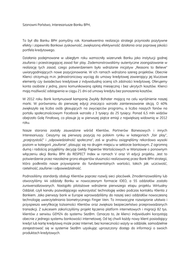 Szanowni Państwo, Interesariusze Banku BPH, To był dla Banku BPH pomyślny rok. Konsekwentna realizacja strategii przyniosła pozytywne efekty i zapewniła Bankowi zyskowność, zwiększoną efektywność działania oraz poprawę jakości portfela kredytowego. Działania podejmowane w ubiegłym roku wzmocniły wizerunek Banku jako instytucji godnej zaufania i przestrzegającej zasad fair play. Zademonstrowaliśmy autentyczne zaangażowanie w realizację tych zasad, czego potwierdzeniem było wdrażanie inicjatyw „Reasons to Believe” uwiarygadniających nowe pozycjonowanie. W ich ramach wdrożono szereg projektów. Obecnie Klienci otrzymują m.in. jednostronicowy wyciąg do umowy kredytowej zawierający jej kluczowe elementy czy świadectwo kredytowe z indywidualną oceną ich zdolności kredytowej. Oferujemy konta osobiste z jedną, jasno komunikowaną opłatą miesięczną i bez ukrytych kosztów. Klienci mają możliwość odstąpienia w ciągu 21 dni od umowy kredytu bez ponoszenia kosztów. W 2012 roku Bank kontynuował kampanię Zwykły Bohater mającą na celu wyróżnienie naszej marki. W porównaniu do pierwszej edycji znacząco wzrosło zainteresowanie akcją. O 40% zwiększyła się liczba osób głosujących na zwycięzców programu, a liczba naszych fanów na portalu społecznościowym Facebook wzrosła z 3 tysięcy do 25 tysięcy. Ponad 6,5 mln widzów obejrzało Galę Finałową, co plasuje ją w pierwszej piątce emisji z największą widownią w 2012 roku. Nasze starania zostały zauważone wśród Klientów, Partnerów Biznesowych i innych Interesariuszy. Cieszymy się pierwszą pozycją na polskim rynku w kategoriach „fair play”, „przejrzystość” i „odpowiedzialność społeczna”, zaś w grudniu osiągnęliśmy rekordowo wysoki poziom w kategorii „zaufanie”, plasując się na drugim miejscu w sektorze bankowym. Z ogromną dumą i radością przyjęliśmy decyzję Giełdy Papierów Wartościowych w Warszawie o ponownym włączeniu akcji Banku BPH do RESPECT Index w ramach V oraz VI edycji projektu. Jest to potwierdzenie przez niezależne grono ekspertów słuszności realizowanej przez Bank BPH strategii, która podkreśla nasze przywiązanie do fundamentalnych wartości, takich jak: uczciwość, rzetelność, zaufanie i odpowiedzialność. Podnosiliśmy standardy obsługi Klientów poprzez rozwój sieci placówek. Zmodernizowaliśmy lub otworzyliśmy 44 oddziały Banku w nowoczesnym formacie IDEO, a 55 oddziałów zostało zuniwersalizowanych. Nastąpiło pilotażowe wdrożenie pierwszego etapu projektu Wirtualny Oddział, czyli kanału pozwalającego wykorzystać technologię wideo podczas kontaktu Klienta z Bankiem. Jako pierwszy bank w Europie wprowadziliśmy do naszej sieci oddziałów nowoczesną technologię uwierzytelniania biometrycznego Finger Vein. To innowacyjne rozwiązanie ułatwia i przyspiesza weryfikację tożsamości Klientów oraz zwiększa bezpieczeństwo przeprowadzanych transakcji. Z sukcesem zakończyliśmy projekt łączenia platform internetowych i migracji 82 tys. klientów z serwisu GEM24 do systemu Sez@m. Oznacza to, że klienci indywidualni korzystają obecnie z jednego systemu bankowości internetowej. Od tej chwili każdy nowy klient posiadający kredyt lub kartę kredytową może przez Internet, bez konieczności wizyty w oddziale, samodzielnie zarejestrować się w systemie Sez@m uzyskując uproszczony dostęp do informacji o swoich produktach kredytowych. Realizowane przez Bank projekty korzystnie przełożyły się na wyniki finansowe. Wypracowany w ubiegłym roku zysk za okres przypadający dla akcjonariuszy Banku wyniósł 261 mln złotych i był o 20% wyższy w porównaniu z rokiem poprzednim. Dużą wagę przywiązywaliśmy do ograniczenia kosztów działania, na czym będziemy skupiać się także w przyszłości. Z drugiej strony posiadamy skonkretyzowane plany zwiększenia przychodów. Zakładamy, że obniżymy wskaźnik kosztów/ dochodów poniżej 60% w 2015 roku. Działania te pozwolą na osiągnięcie wskaźnika rentowności kapitału netto na poziomie wyższym niż 10% w 2015 roku. Kolejnym kluczowym tematem w 2013 roku będzie „upraszczanie”, przez co należy rozumieć przegląd wszystkich procesów pochłaniających czas i energię pracowników oraz spowalniających ich efektywność. Podjęte działania będą miały na celu wypracowanie prostych i przejrzystych procedur obowiązujących w Banku. Jestem bardzo zadowolony z zaangażowania, które widzę wśród naszych pracowników, pomimo wielu zmian, przez które przechodziliśmy. Dziękuję im za kreatywność, współpracę i konsekwencję w realizacji celów. Widać wyraźnie, że menedżerowie podchodzą do swej pracy z wielką pasją, a w całej kadrze tkwi ogromna pozytywna energia. Jest to dla mnie podstawowym gwarantem dalszego sukcesu Banku i rękojmią, że w pełni zrealizujemy obietnice jakie podjęliśmy wobec wszystkich grup Interesariuszy. Z poważaniem Richard Gaskin Prezes Zarządu Banku BPH S.A. Warszawa, marzec 2013 rok.