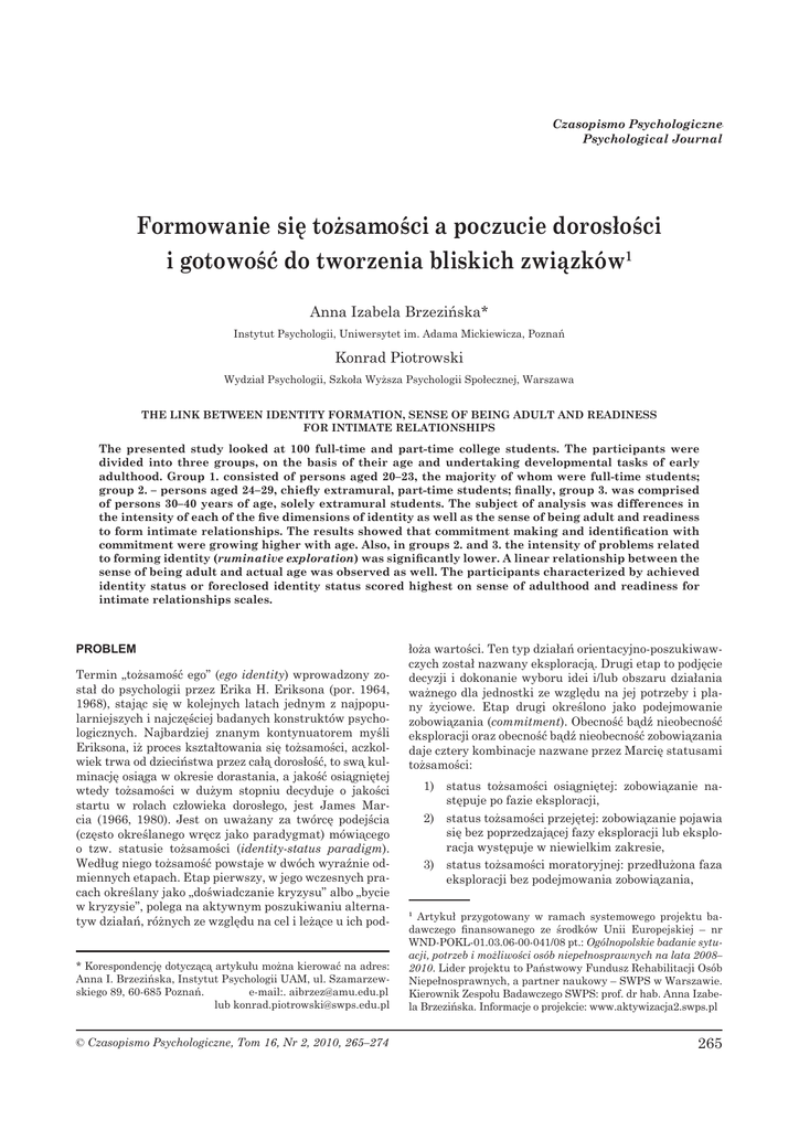 Czasopismo Psychologiczne Formowanie się tożsamości a poczucie dorosłości i gotowość do tworzenia bliskich związków Psychological Journal Formowanie się tożsamości a poczucie dorosłości i gotowość do tworzenia bliskich związków1 Anna Izabela Brzezińska* Instytut Psychologii, Uniwersytet im. Adama Mickiewicza, Poznań Konrad Piotrowski Wydział Psychologii, Szkoła Wyższa Psychologii Społecznej, Warszawa THE LINK BETWEEN IDENTITY FORMATION, SENSE OF BEING ADULT AND READINESS FOR INTIMATE RELATIONSHIPS The presented study looked at 100 full-time and part-time college students. The participants were divided into three groups, on the basis of their age and undertaking developmental tasks of early adulthood. Group 1. consisted of persons aged 20–23, the majority of whom were full-time students; group 2. – persons aged 24–29, chiefly extramural, part-time students; finally, group 3. was comprised of persons 30–40 years of age, solely extramural students. The subject of analysis was differences in the intensity of each of the five dimensions of identity as well as the sense of being adult and readiness to form intimate relationships. The results showed that commitment making and identification with commitment were growing higher with age. Also, in groups 2. and 3. the intensity of problems related to forming identity (ruminative exploration) was significantly lower. A linear relationship between the sense of being adult and actual age was observed as well. The participants characterized by achieved identity status or foreclosed identity status scored highest on sense of adulthood and readiness for intimate relationships scales. PROBLEM Termin „tożsamość ego” (ego identity) wprowadzony został do psychologii przez Erika H. Eriksona (por. 1964, 1968), stając się w kolejnych latach jednym z najpopularniejszych i najczęściej badanych konstruktów psychologicznych. Najbardziej znanym kontynuatorem myśli Eriksona, iż proces kształtowania się tożsamości, aczkolwiek trwa od dzieciństwa przez całą dorosłość, to swą kulminację osiąga w okresie dorastania, a jakość osiągniętej wtedy tożsamości w dużym stopniu decyduje o jakości startu w rolach człowieka dorosłego, jest James Marcia (1966, 1980). Jest on uważany za twórcę podejścia (często określanego wręcz jako paradygmat) mówiącego o tzw. statusie tożsamości (identity-status paradigm). Według niego tożsamość powstaje w dwóch wyraźnie odmiennych etapach. Etap pierwszy, w jego wczesnych pracach określany jako „doświadczanie kryzysu” albo „bycie w kryzysie”, polega na aktywnym poszukiwaniu alternatyw działań, różnych ze względu na cel i leżące u ich pod- łoża wartości. Ten typ działań orientacyjno-poszukiwawczych został nazwany eksploracją. Drugi etap to podjęcie decyzji i dokonanie wyboru idei i/lub obszaru działania ważnego dla jednostki ze względu na jej potrzeby i plany życiowe. Etap drugi określono jako podejmowanie zobowiązania (commitment). Obecność bądź nieobecność eksploracji oraz obecność bądź nieobecność zobowiązania daje cztery kombinacje nazwane przez Marcię statusami tożsamości: 1) status tożsamości osiągniętej: zobowiązanie następuje po fazie eksploracji, 2) status tożsamości przejętej: zobowiązanie pojawia się bez poprzedzającej fazy eksploracji lub eksploracja występuje w niewielkim zakresie, 3) status tożsamości moratoryjnej: przedłużona faza eksploracji bez podejmowania zobowiązania, * Korespondencję dotyczącą artykułu można kierować na adres: Anna I. Brzezińska, Instytut Psychologii UAM, ul. Szamarzewskiego 89, 60-685 Poznań. e-mail:. [email protected] lub [email protected] 1 Artykuł przygotowany w ramach systemowego projektu badawczego finansowanego ze środków Unii Europejskiej – nr WND-POKL-01.03.06-00-041/08 pt.: Ogólnopolskie badanie sytuacji, potrzeb i możliwości osób niepełnosprawnych na lata 2008– 2010. Lider projektu to Państwowy Fundusz Rehabilitacji Osób Niepełnosprawnych, a partner naukowy – SWPS w Warszawie. Kierownik Zespołu Badawczego SWPS: prof. dr hab. Anna Izabela Brzezińska. Informacje o projekcie: www.aktywizacja2.swps.pl © Czasopismo Psychologiczne, Tom 16, Nr 2, 2010, 265–274 265 Anna I. Brzezińska, Konrad Piotrowski Do niedawna sądzono (np. Schwartz, 2001), że tożsamość zbudowana w okresie dorastania jest względnie stała. Wyniki badań (Waterman, 1999; Bosma i Kunnen, 2001) wskazują jednak, że także po okresie adolescencji zachodzi intensywny proces kształtowania się i przekształcania tożsamości, powiązany między innymi z nowym rolami i zadaniami, jakie podejmuje jednostka i ważnymi wydarzeniami w jej życiu. Badania nad rozwojem tożsamości w okresie postadolescencyjnym wiążą się ściśle z szeregiem przejść i zmian, jakie stają się w tym czasie udziałem młodego człowieka. Proces wkraczania w dorosłość utożsamia się na ogół z odchodzeniem od ról społecznych, charakterystycznych dla dzieci i młodzieży oraz podejmowanie ról przypisanych kulturowo osobom dorosłym. Najczęściej stosowanymi markerami wkraczania w dorosłość, są 1) opuszczenie domu rodzinnego i uniezależnienie się od rodziców, 2) rozpoczęcie życia z partnerem, na ogół owocujące małżeństwem, 3) posiadanie dziecka, 4) zakończenie procesu edukacji oraz 5) podjęcie stałej pracy zawodowej w pełnym wymiarze godzin (Fadjukoff, 2007). Wiek, w którym młodzi ludzie podejmują się realizacji tych zadań kształtuje się odmiennie w różnych kulturach, dodatkowo w obecnych czasach obserwuje się ich odraczanie w czasie (Arnett, 2000; Maček, Bejcek i Vaničková, 2007; Lanz i Tagliabue, 2007). Jak stwierdza J.J. Arnett (2000, 2001), obecnie obserwuje się duże zmiany w strategiach stosowanych przez młodych ludzi wkraczających w dorosłość. W coraz późniejszym wieku podejmowana jest decyzja o zawarciu związku małżeńs