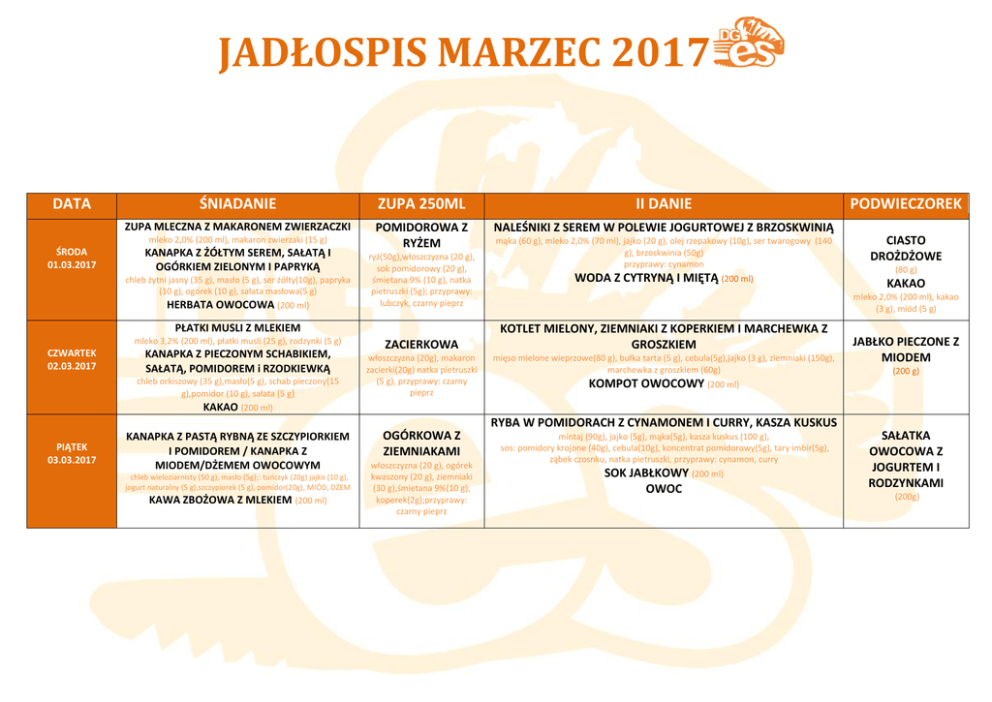JADŁOSPIS MARZEC 2017 DATA ŚNIADANIE ZUPA 250ML II DANIE ZUPA MLECZNA Z MAKARONEM ZWIERZACZKI POMIDOROWA Z RYŻEM NALEŚNIKI Z SEREM W POLEWIE JOGURTOWEJ Z BRZOSKWINIĄ mleko 2,0% (200 ml), makaron zwierzaki (15 g) ŚRODA 01.03.2017 KANAPKA Z ŻÓŁTYM SEREM, SAŁATĄ I OGÓRKIEM ZIELONYM I PAPRYKĄ chleb żytni jasny (35 g), masło (5 g), ser żółty(10g), papryka (10 g), ogórek (10 g), sałata masłowa(5 g) HERBATA OWOCOWA (200 ml) ryż(50g),włoszczyzna (20 g), sok pomidorowy (20 g), śmietana 9% (10 g), natka pietruszki (5g); przyprawy: lubczyk, czarny pieprz PŁATKI MUSLI Z MLEKIEM mleko 3,2% (200 ml), płatki musli (25 g), rodzynki (5 g) CZWARTEK 02.03.2017 KANAPKA Z PIECZONYM SCHABIKIEM, SAŁATĄ, POMIDOREM i RZODKIEWKĄ chleb orkiszowy (35 g),masło(5 g), schab pieczony(15 g),pomidor (10 g), sałata (5 g) KAKAO (200 ml) ZACIERKOWA włoszczyzna (20g), makaron zacierki(20g) natka pietruszki (5 g), przyprawy: czarny pieprz mąka (60 g), mleko 2,0% (70 ml), jajko (20 g), olej rzepakowy (10g), ser twarogowy (140 g), brzoskwinia (50g) przyprawy: cynamon WODA Z CYTRYNĄ I MIĘTĄ (200 ml) PODWIECZOREK CIASTO DROŻDŻOWE (80 g) KAKAO mleko 2,0% (200 ml), kakao (3 g), miód (5 g) KOTLET MIELONY, ZIEMNIAKI Z KOPERKIEM I MARCHEWKA Z GROSZKIEM mięso mielone wieprzowe(80 g), bułka tarta (5 g), cebula(5g),jajko (3 g), ziemniaki (150g), marchewka z groszkiem (60g) JABŁKO PIECZONE Z MIODEM (200 g) KOMPOT OWOCOWY (200 ml) RYBA W POMIDORACH Z CYNAMONEM I CURRY, KASZA KUSKUS PIĄTEK 03.03.2017 KANAPKA Z PASTĄ RYBNĄ ZE SZCZYPIORKIEM I POMIDOREM / KANAPKA Z MIODEM/DŻEMEM OWOCOWYM chleb wieloziarnisty (50 g), masło (5g);: tuńczyk (20g) jajko (10 g), jogurt naturalny (5 g),szczypiorek (5 g), pomidor(20g), MIÓD, DŻEM KAWA ZBOŻOWA Z MLEKIEM (200 ml) OGÓRKOWA Z ZIEMNIAKAMI włoszczyzna (20 g), ogórek kwaszony (20 g), ziemniaki (30 g),śmietana 9%(10 g), koperek(2g);przyprawy: czarny pieprz mintaj (90g), jajko (5g), mąka(5g), kasza kuskus (100 g), sos: pomidory krojone (40g), cebula(10g), koncentrat pomidorowy(5g), tary imbir(5g), ząbek czosnku, natka pietruszki, przyprawy: cynamon, curry SOK JABŁKOWY (200 ml) OWOC SAŁATKA OWOCOWA Z JOGURTEM I RODZYNKAMI (200g) JADŁOSPIS MARZEC 2017 DATA ŚNIADANIE ZUPA 250ML PŁATKI CRUNCHY Z MLEKIEM mleko 2,0% (150 ml), cruchy (30 g) PONIEDZIAŁEK 06.03.2017 WTOREK 07.03.2017 KANAPKA Z ŻÓŁTYM SEREM, SAŁATĄ I POMIDOREM chleb razowy (25 g), masło (5 g), ser żółty (10 g), pomidor (15 g), sałata masłowa(5 g); HERBATA Z CYTRYNĄ (200 ml) JAJKO NA TWARDO W SOSIE JOGURTOWYM ZE SZCZYPIORKIEM ½ jajka (25 g), sos: jogurt naturalny (10 g), szczypiorek (3 g) KANAPKA Z KIEŁBASĄ KRAKOWSKĄ, SAŁATĄ i OGÓRKIEM KISZONYM chleb graham (50 g), masło (5 g), kiełbasa krakowska (15 g), ogórek kiszony (10 g), sałata (5 g) KAKAO (200 ml) ŚRODA 08.03.2017 KANAPKA Z TWAROŻKIEM I RZODKIEWKĄ / KANAPKA Z MIODEM/DŻEMEM OWOCOWYM grahamka (50 g), masło (5 g), ser biały półtłusty (15 g), rzodkiewka (10 g), miód, dżem owocowy HERBATA Z CYTRYNĄ (200 ml) PŁATKI MUSLI Z MLEKIEM mleko 3,2% (200 ml), płatki musli (25 g), rodzynki (5 g) CZWARTEK 09.03.2017 KANAPKA Z SZYNKĄ, SAŁATĄ I POMIDOREM chleb orkiszowy (25 g),masło(5 g), szynka drobiowa(30 g),pomidor (10 g), sałata (5 g) HERBATA OWOCOWA (200 ml) II DANIE PODWIECZOREK SPAGHETTI Z SOSEM WARZYWNO MIĘSNYM ŻUREK Z JAJKIEM zakwas (20 g), ziemniaki (100 g), śmietana 9% (10 g) jajko(20g); przyprawy: majeranek, ziele angielskie BARSZCZ UKRAIŃSKI włoszczyzna (20 g), buraki (20g) ziemniaki (40 g),biała kapusta(10g), fasolka szparagowa (10 g), natka pietruszki (5 g), przyprawy: czarny pieprz JARZYNOWA włoszczyzna (20 g),ziemniaki (20 g),kalafior (10 g), groszek zielony (10 g) natka pietruszki (5 g), przyprawy: czarny pieprz makaron krawaciki(80 g), mięso mielone wołowo-wieprzowe (60 g), marchew (30 g), pomidory (30 g); przyprawy: bazylia, oregano. WODA Z CYTRYNĄ I MIĘTĄ (200 ml) OWOC KOTLET Z PIERSI KURCZAKA W SEZAMIE ZIEMNIAKI I SURÓWKA HAWAJSKA pierś z kurczaka (90g), sezam(10g, jajko (5g), bułka(5g), ziemniaki(100g), surówka: kapusta pekińska (30g), ananas(20g), jogurt naturalny JOGURT NATURALNY Z RODZYNKAMI I PŁATKAMI MUSLI (200g) BANAN (150g) KOMPOT OWOCOWY (200 ml) RYŻ Z JABŁKIEM PRAŻONYM Z JOGURTEM NATURALNYM ryż (100g), jabłko (70g), cynamon 10g jogurt naturalny (50g) CIASTO Z OWOCAMI WODA Z CYTRYNĄ I MIĘTĄ (200 ml) KAKAO (80 g) mleko 2,0% (200 ml), kakao (3 g), miód (5 g) ROSÓŁ Z MAKARONEM SCHAB PIECZONY W ZIOŁACH ZIEMNIAKI Z KOPERKIEM I BURACZKI włoszczyzna(20 g),indyk(10g), makaron dwujajeczny(30g), natka pietruszki(3 g), przyprawy: lubczyk, kozieradka, jałowiec, ziele angielskie, liść laurowy, pieprz schab (100 g przyprawy: tymianek, rozmaryn, majeranek, lubczyk; ziemniaki (150 g); buraczki(70g) SOK JABŁKOWO WIŚNIOWY (200 ml) MINI WAFLE RYŻOWE Z AMARANTUSEM (15g) JABŁKO (40g) FASOLOWA PIĄTEK 10.03.2017 CHAŁKA Z KONFITURĄ WIŚNIOWĄ chałka(30 g), konfitura owocowa (15 g) masło(5g) KAKAO (200 ml) fasola(20 g), włoszczyzna (20 g), ziemniaki (20 g), olej słonecznikowy (5 g); przyprawy: liść laurowy, majeranek, lubczyk, czarny pieprz, czosnek ŁOSOŚ Z KOLOROWYM MAKARONEM I BROKUŁY Z KUKURYDZĄ łosoś (60 g), makaron kolorowy (90 g), brokuł (90 g),kukurydza(5g) oliwa z oliwek (5 g); przyprawy: sok z cytryny, koperek, pieprz KOMPOT OWOCOWY (200 ml) CHRUPKI KUKURYDZIANE Z TRUSKAWKAMI BEZ CUKRU JADŁOSPIS MARZEC 2017 DATA PONIEDZIAŁEK 13.03.2017 ŚNIADANIE ZUPA 250ML II DANIE KANAPKA Z ŻÓŁTYM SEREM I PAPRYKĄ pieczywo NEAPOLITAŃSKA Z MAKARONEM GULASZ DROBIOWY Z WARZYWAMI, KASZA PERŁOWA, SURÓWKA Z KAPUSTY PEKIŃSKIEJ, KISZONEGO OGÓRKA I KUKURYDZY razowe (50 g), masło (5 g), ser żółty (10 g), papryka (10 g), sałata masłowa SAŁATKA Z TUŃCZYKIEM jajko (10 g), kukurydza (10 g), ogórek konserwowy (10 g), groszek zielony (5 g), ryż(10g), jogurt naturalny(5g) HERBATA OWOCOWA (200 ml) OWSIANKA NA MELKU WTOREK 14.03.2017 KANAPKA Z SZYNKĄ, SAŁA