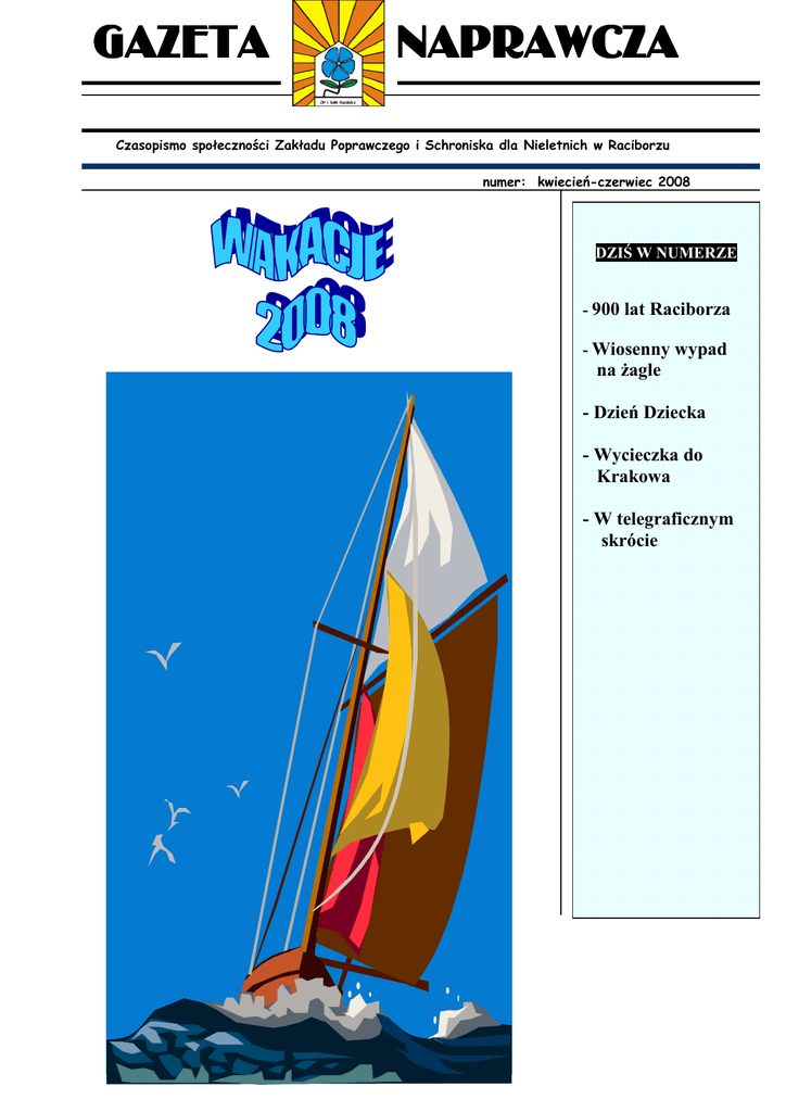GAZETA NAPRAWCZA Czasopismo społeczności Zakładu Poprawczego i Schroniska dla Nieletnich w Raciborzu numer: kwiecień-czerwiec 2008 DZIŚ W NUMERZE - 900 lat Raciborza - Wiosenny wypad na Ŝagle - Dzień Dziecka - Wycieczka do Krakowa - W telegraficznym skrócie Dnia 15 czerwca, na ulicach naszego miasta, miało miejsce niesamowite wydarzenie. KaŜdy mieszkaniec Raciborza mógł przenieść się kilka wieków wstecz i zostać świadkiem uroczystego przemarszu Jana III Sobieskiego wraz ze swoją świtą i towarzyszącymi mu wojskami. Oczywiście w tak waŜnej uroczystości nie mogło zabraknąć naszych wychowanków, którzy wcielili się w rolę bohaterów sprzed wieków. Jak widać, kolejny raz potwierdził się fakt, Ŝe Ŝadna waŜna impreza w Raciborzu nie moŜe się odbyć bez udziału naszych zakładowych artystów którzy zawsze w doskonały sposób potrafią się zaprezentować i wywołać podziw oraz uśmiech na twarzach zgromadzonych widzów. Kamil Chodkowski Fot. Daniel Dworak OBÓZ śEGLARSKI Stało się juŜ niemalŜe tradycją, Ŝe z końcem roku szkolnego nasi wychowankowie-pod opieką pracowników ZPwraz z przyjaciółmi z Groβefehn, uczestniczą w rejsie po jeziorach Warmii i Mazur. Organizatorami rejsu są: Towarzystwo śeglarskie „NAUTA” z Kędzierzyna - Koźla i Zakład Poprawczy w Raciborzu. Aby tradycji stało się zadość- z końcem maja- grupa wilków morskich ruszyła odkrywać nowe lądy i walczyć z przeciwnościami natury. PrzeŜytych przygód i zdobytych doświadczeń nie sposób tutaj opisać. Fakt dziewięciodniowej walki z Ŝywiołami mówi sam za siebie… Trasa rejsu: - Ruciane Nida (start), - śluza na Guziance, - jezioro Bełdany, - przystań w Przeczkach, - Mikołajki (aquapark „Tropiczna”), - Ryn (zawody pływackie), - Popielno (chrzest młodych wilków morskich), - Ruciane Nida (meta). Przyszłorocznym marynarzom Ŝyczymy pomyślnych wiatrów i stopy wody pod kilem. Rafał Niechoj Dnia 01 czerwca 2008 roku trzech wychowanków Zakładu Poprawczego ( Emanuel Sopel, Mariusz Michalik oraz Sebastian Zadworny), wraz z mgr Rafałem Lazarem uświetnili swoimi popisami ekwilibrystycznymi dwa festyny które zorganizowane zostały z okazji Dnia Dziecka. Imprezy odbywały się w Szkole Podstawowej Nr 4 w Raciborzu i Parafii pw. Najświętszego Serca Pana Jezusa w Raciborzu. Wychowankowie spisali się doskonale, ich pokaz artystyczny zadziwił wszystkich widzów. Najistotniejszy jest jednak fakt, Ŝe najlepiej bawili się najmłodsi i zarazem najwaŜniejsi uczestnicy imprez - dzieci. Drodzy czytelnicy pamiętajcie, Ŝe nasi zakładowi artyści są zawsze do Waszych usług. S. Zadworny W naszym Zakładzie wiosna oznacza początek sezonu turystycznego. Na inauguracyjną wycieczkę samochodową do Krakowa wybrała się grupa III. W niedzielny poranek /11 maja 2008r./, wszyscy stawili się w pełnej gotowości do wyjazdu, co oznacza, Ŝe kaŜdy miał wszystkie kieszenie wypchane suchym prowiantem a pod pachą butelkę z wodą mineralną. Plan wycieczki wyglądał następująco: zwiedzanie Wawelu, Sukiennic, Kościoła Mariackiego i ZOO. Nie omieszkaliśmy oczywiście pozdrowić Smoka Wawelskiego. Biedaczysko, miał chyba kłopoty z Ŝołądkiem, często odbijało mu się ogniem. Po kilku godzinach upajania się pięknem krakowskich zabytków, po przemaszerowaniu wielu kilometrów ulicami miasta, przyszedł czas na powrót. W Zakładzie pojawiliśmy się w godzinach wieczornych, tuŜ przed kolacją. Jak nigdy, tym razem nikt nie musiał namawiać nas na pójście spać. Część z nas, zanim jeszcze dotarła do swoich łóŜek, zapadła juŜ w głęboki sen. Panowie wychowawcy, dokąd wyruszymy następnym razem? Kamil Chodkowski -Mamo, dziś na lekcji pan od matematyki pochwalił mnie ! - To bardzo ładnie, a co powiedział ? - śe wszyscy jesteśmy idiotami, a ja - największym ! DYSKOTEKA ZE STUDENTAMI W maju zaszczycili nas swoją obecnością studenci z Uniwersytetu Wrocławskiego. Był to wspaniały dzień który obfitował w same niespodzianki. Goście przygotowali nam mnóstwo gier i zabaw świetlicowych oraz prowadziliśmy z nimi ciekawe rozmowy. Wszyscy oczekiwali jednak- ze zniecierpliwieniem- podsumowania dnia którym miała być wspólna dyskoteka. Wreszcie nadeszła ta chwila. MoŜecie wyobrazić sobie co się działo… Las podniesionych do góry rąk i kołyszące się ciała w rytm muzyki TECHNO. Zapewniam Was- było bombowo!!! - Jak nazywa się człowiek, który ciągle gada i gada, chociaŜ nikt go nie słucha? - Nauczyciel! WAKACJE Nareszcie nadszedł-juŜ od września-wyczekiwany dzień. Po dziesięciomiesięcznej, owocnej pracy [☺] , z głowami pełnymi nowych informacji [ ;) ], uśmiechnięci odbierzemy nasze świadectwa i wyjedziemy na zasłuŜony odpoczynek. Tak, naleŜy nam się kilkadziesiąt dni wolnego od szkoły, przede wszystkim po to aby naładować akumulatory przed kolejnym rokiem szkolnym. Ostatniego dnia szkoły nauczyciel Ŝegna się z uczniami: - śyczę wam wesołych wakacji oraz tego, abyście we wrześniu wrócili do szkoły mądrzejsi. - Nawzajem, proszę pana! „PIKNIK Z WIERSZEM I HUMOREM” Dnia 11 czerwca sześciu wychowanków naszego Zakładu Poprawczego ( Emanuel Sopel, Mariusz Michalik, Sebastian Zadworny, Norman Saderski, Szymon Gunia i Grzegorz Wierzbowski) pod opieką mgr Rafała Lazara wyjechało na Międzyszkolny Konkurs Poetycki „Piknik z wierszem i humorem” który odbył się w Gimnazjum Nr 15 przy Specjalnym Ośrodku Szkolno – Wychowawczym w Rybniku. Jak zwykle, nasi gwiazdorzy uświetnili całą imprezę popisami ekwilibrystycznymi, wywołując podziw i zdziwienie na twarzach widzów. - Czy zdajesz sobie sprawę z tego, ile nas kosztuje twoja nauka? - Tak, tato. Dlatego staram się uczyć jak najkrócej i jak najmniej.