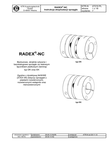 KTR Kupplungstechnik GmbH D-48407 Rheine RADEX®-NC Instrukcja eksploatacji sprzęgła KTR-N 47210 PL strona: 1 z 18 wydanie: 7 RADEX®-NC Bezluzowe, skrętnie sztywne i bezobsługowe sprzęgło ze stalowym łącznikiem płytkowym (laminą) typ DK oraz EK typ DK Zgodne z dyrektywą 94/9/WE (ATEX 95) dotyczy sprzęgieł z piastami rozwierconymi, rozwierconymi wstępnie oraz nierozwierconymi typ EK chronione zgodnie z ISO 16016. podpisano: sprawdzono: 29.05.13 Kb/Rt 29.05.13 Kb zastępuje: zastąpione: KTR-N od 29.11.12 KTR Kupplungstechnik GmbH D-48407 Rheine RADEX®-NC Instrukcja eksploatacji sprzęgła KTR-N 47210 PL strona: 2 z 18 wydanie: 7 RADEX®-NC sprzęgło do serwonapędów jest bezluzowym, skrętnie sztywnym sprzęgłem płytkowym. Zostało ono zbudowane ze szczególnym uwzględnieniem zastosowań w serwotechnice wymagającej wysokiej sztywności skrętnej (np. napędy stołów karuzelowych, przekładnie planetarne, ślimakowe, napędy wrzecion, śrub pociągowych, itp.). Spis treści 1 Dane techniczne 2 Wskazówki 2.1 2.2 2.3 2.4 2.5 Dobór sprzęgła Wskazówki ogólne Oznaczenia dotyczące bezpieczeństwa Wskazówki dotyczące bezpieczeństwa Właściwe użytkowanie 3 Przechowywanie 4 Montaż 4.1 4.2 4.3 4.4 4.5 5 Elementy składowe sprzęgieł Wskazówki dotyczące rozwiertu Montaż piast Odchyłki - ustawienie sprzęgieł Części zamienne, adresy biur obsługi klienta Załącznik A Wskazówki i instrukcje dotyczące używania sprzęgieł w przestrzeniach zagrożonych wybuchem 5.1 Dobór rozmiaru sprzęgła 5.2 Zgodne z przepisami, użytkowanie w przestrzeniach zagrożonych wybuchem 5.3 Okresy przeglądów sprzęgieł w przestrzeniach zagrożonych wybuchem 5.4 Kontrola wizualna oraz pomiary 5.5 Dopuszczalne materiały sprzęgła w przestrzeniach zagrożonych wybuchem 5.6 5.7 5.8 5.9 Oznaczanie sprzęgła w przestrzeniach zagrożonych wybuchem Uruchamianie Usterki - przyczyny oraz usuwanie Deklaracja Zgodności z dyrektywą 94/9/WE z dnia 23 marca 1994 roku chronione zgodnie z ISO 16016. podpisano: sprawdzono: 29.05.13 Kb/Rt 29.05.13 Kb zastępuje: zastąpione: KTR-N od 29.11.12 KTR Kupplungstechnik GmbH D-48407 Rheine RADEX®-NC Instrukcja eksploatacji sprzęgła KTR-N 47210 PL strona: 3 z 18 wydanie: 7 1 Dane techniczne ® ® rysunek 1: RADEX -NC typ DK rysunek 2: RADEX -NC typ EK Tabela 1: wymiary RADEX -NC rozmiar 5 10 15 20 25 35 42 śruba zaciskająca DIN EN ISO 4762 wymiary [mm] ® maks. d1, d2 12 15 20 25 35 42 55 DA l1, l2 LDK EDK LEK dh s t M TA [Nm] 26 35 47 59 70 84 104 12 16 21 24 32 35 40 34 44 55 67 88 98 116 10 12 13 19 24 28 36 26,5 35 45 52 69 77 91 12 14,5 19,5 24 30 38 48 2,5 3 3 4 5 7 11 3,5 5,0 6,8 6,5 9,0 10,5 10,5 M2,5 M4 M6 M6 M8 M10 M10 0,8 3 10 10 25 49 69 Tabela 2: dane techniczne ® RADEX -NC rozmiar 5 10 15 20 25 35 42 TKN [Nm] TK max. [Nm] 2,5 7,5 20 30 60 100 180 5 15 40 60 120 200 360 maks. obroty [1/min] 25000 20000 16000 12000 10000 9000 7000 dane techniczne sztywność skrętna [Nm/rad] typ DK typ EK 1200 2400 2800 5600 6000 12000 15000 30000 30000 60000 36000 72000 60000 120000 moment bezwładności [kgm2] typ DK typ EK 0,000004 0,000003 0,000016 0,000012 0,000065 0,000053 0,000199 0,000154 0,000508 0,000393 0,001153 0,000911 0,007458 0,006153 Sprzęgła RADEX®-NC z dołączonymi dodatkowymi elementami mogą być źródłem ciepła, iskrzenia i ładunków elektrostatycznych (np. wykonania z bębnami i tarczami hamulcowymi, ze sprzęgłami przeciążeniowymi, wirnikami itp.) i zabronione jest stosowanie takich wykonań w przestrzeniach zagrożonych wybuchem. Konieczna jest osobna kontrola w takim przypadku. chronione zgodnie z ISO 16016. podpisano: sprawdzono: 29.05.13 Kb/Rt 29.05.13 Kb zastępuje: zastąpione: KTR-N od 29.11.12 KTR Kupplungstechnik GmbH D-48407 Rheine RADEX®-NC Instrukcja eksploatacji sprzęgła KTR-N 47210 PL strona: 4 z 18 wydanie: 7 1 Dane techniczne Tabela 3: Momenty dokręcania oraz momenty obrotowe przenoszone przez piasty mocowane zaciskowo RADEX®-NC rozmiar 5 10 15 20 25 35 42 śruba zaciskająca M M2,5 M4 M6 M6 M8 M10 M10 moment dokręcania TA [Nm] 0,8 3 10 10 25 49 69 średnica otworu w piaście oraz odpowiadający jej przenoszony moment obrotowy przez piastę zaciskową [Nm] Ø3 2,2 Ø5 2,3 8 Ø8 2,4 9 Ø 10 2,5 10 28 Ø 12 10 30 36 Ø 14 11 31 37 Ø 15 11 32 38 82 Ø 16 32 39 83 Ø 19 34 40 87 155 Ø 20 35 41 88 157 Ø 24 44 93 165 285 Ø 25 45 94 167 287 Ø 28 98 173 296 Ø 30 100 177 301 Ø 32 103 181 307 Ø 35 106 187 315 Ø 38 193 323 Ø 40 197 329 Ø 45 343 Ø 50 357 Ø 55 370 ROZWAŻNIE! Piasty zaciskowe bez rowka wpustowego do stosowania tylko w kategorii 3. UWAGA! Dobór piast zaciskowych W przypadku stosowania piast zaciskowych w przestrzeniach zagrożonych wybuchem, dobór musi uwzględniać minimalny współczynnik bezpieczeństwa s = 2, pomiędzy szczytowym momentem obrotowym maszyny (z uwzględnieniem wszystkich dodatkowych parametrów) i momentem przenoszonym przez połączenie wał-piasta. 2 Wskazówki 2.1 Dobór sprzęgła ! OSTROŻNIE! Aby zapewnić ciągłą i bezawaryjną pracę sprzęgła, powinno ono zostać dobrane zgodnie z zaleceniami (zgodnie normą DIN 740 część 2) dla danego zastosowania (rozdział katalogu dotyczący sprzęgieł RADEX®-NC). Jeśli warunki pracy (moc, obroty, obciążenie, strona napędzająca lub napędzana, itp.) zmienią się, sprzęgło ponownie powinno zostać zweryfikowane pod względem doboru. Dane techniczne dotyczące przenoszonego momentu obrotowego, odnoszą się wyłącznie do łącznika płytkowego (laminy). Przenoszony moment obrotowy przez połączenie wałpiasta, musi zostać sprawdzony przez zamawiającego na jego odpowiedzialność. Dla napędów z niebezpiecznymi drganiami skrętnymi (napędy z okresowym obciążeniem drganiami skrętnymi) konieczne jest dobór uwzględniający obliczenia drgań skrętnych w celu bezpiecznego działania sprzęgła. Typowymi napędami narażonymi na drgania skrętne są przykładowo: napędy z silnikami wyso