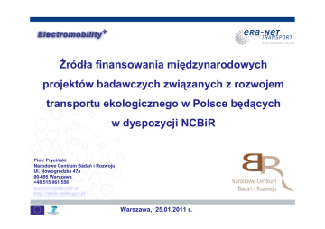 Źródła finansowania międzynarodowych projektów badawczych związanych z rozwojem transportu ekologicznego w Polsce będących w dyspozycji NCBiR Piotr Pryciński Narodowe Centrum Badań i Rozwoju Ul. Nowogrodzka 47a 00-695 Warszawa +48 515 061 558 [email protected] http://www.ncbir.gov.pl Warszawa, 25.01.2011 r. PLAN PREZENTACJI 1. Era Net Transport II „ENT II” 2. Era Net Plus Electromobility+ „EN+” 3. Konkurs w ramach Electromobility + 3.1 Informacje ogólne, adresaci przedsięwzięcia, procedura konkursowa 3.2 Przedmiot dofinansowania 3.3 Poziom dofinansowania 3.4 Warunki dofinansowania 3.5 Kwalifikowalność poniesionych kosztów 4. Projekty koordynowane przez NCBiR z obszaru transportu Warszawa, 25.01.2011 r. 1. ERA-NET TRANSPORT II 1/4 Cele projektu: - rozwój europejskich badań z zakresu transportu, - dostarczanie informacji o przyszłych wyzwaniach oraz europejskich priorytetach badawczych z dziedziny polityki transportowej i badawczej, - rozwój regionalnych projektów pomiędzy europejskimi partnerami, - rozwijanie inicjatyw w ramach narodowych programów badań ze szczególnym uwzględnieniem wspólnych konkursów i wspólnych programów, - kontynuacja działań informacyjnych i upowszechniających wiedzę nt. sieci oraz pogłębienie współpracy pomiędzy jej partnerami, Główne zadanie projektu: -promowanie współpracy między regionalnymi programami badawczymi dotyczącymi transportu w ramach m.in. Action Groups (AG). ENT II - 14 partnerów z 12 państw Warszawa, 25.01.2011 r. 1. ERA-NET TRANSPORT 2/4 Geographic coverage 2010 Koordynator ENT II Warszawa, 25.01.2011 r. 1. ERA-NET TRANSPORT 3/4 Wybrane grupy robocze w projekcie ENT II: - Climate Friendly Freight Network - Road Safety - Railway Research - Changing Mobility Patterns - Micro-Mobility - Data and Data Collecting Tools Warszawa, 25.01.2011 r. 1. ERA-NET TRANSPORT 4/4 EN Plus Electromobility+ Grupy Robocze w ERA-NET TRANSPORT Freight Networks Warszawa, 25.01.2011 r. SURPRICE E-Mobility Sleepiness (safety) Safety & Security Dangerous Goods Keep Moving SURSHIP Intelligent Logistic Intermodal Freight 2,0 M€ 2010 2008 2007 2006 4,5 M€ 19,3 M€ ~ 30 M€ 4,3 M€ 2. EN Plus „Electromobility+“ 1/2 Konsorcjum EN+: składa się z 9 państw: (FR,DE,AT,NL,NO,FI,SE,PL,DK), 3 regionów: BELGIA (Flandria), WŁOCHY (Piemont), Hiszpania (Andaluzja) oraz Turcji; Celem konsorcjum EN+ jest ogłoszenie konkursu w formule ERA NET PLUS; Wsparcie merytoryczne i proceduralne ze strony konsorcjum ENT II; Otwarcia konkursu: 14.12.2010 r.; Zamknięcie konkursu: 31.03.2011 r. ; Łączny budżet: ok.30 M Euro (20 M Euro – członkowie konsorcjum EN+, 10 M Euro – KE) ; polski budżet NCBiR: 1,3 M Euro. Obszar tematyczny konkursu EN+ (5 key dimensions) • Energy and environnemental approach • Usage patterns, economic models, actors • Technical dimensions of the recharge and distribution system • Testing, trials and normative standards • Applied technological research / Innovation Warszawa, 25.01.2011 r. 2. EN Plus „Electromobility+“ 2/2 Geographic coverage 2010 Koordynator EN+ Pilot Group Warszawa, 25.01.2011 r. 3. Konkurs w ramach Electromobility + 3.1 Informacje ogólne, procedura konkursowa, adresaci konkursu 1/4 • Wnioski o dofinansowanie międzynarodowych projektów badawczych w ramach EN+ są przyjmowane w trybie konkursowym, • Informacja o konkursie i jego warunkach zamieszczana jest na stronie internetowej Narodowego Centrum Badań i Rozwoju, www.ncbir.pl, • Wniosek międzynarodowy składany jest do sekretariatu międzynarodowego konkursu EN+ i oceniany zgodnie z procedurą oraz kryteriami określonymi dla konkursu EN+, • Wniosek międzynarodowy składany jest za pośrednictwem systemu EPSS do dnia 31.03.2011 (17.00), • Konsorcja międzynarodowe muszą składać się z minimum dwóch partnerów z państw/regionów należących do konsorcjum EN+, • Polski podmiot jest zobowiązany do złożenia wniosku o dofinansowanie z NCBiR w terminie do 31.03.2011 r., • Wniosek o dofinansowanie z NCBiR powinien zostać złożony w dwóch egzemplarzach na formularzu zgodnym ze wzorem zamieszczonym na stronie NCBiR, Warszawa, 25.01.2011 r. 3.1 Informacje ogólne, procedura konkursowa 2/4 Link do ogłoszenia o konkursie www.ncbir.pl Warszawa, 25.01.2011 r. 3.1 Informacje ogólne, procedura konkursowa 3/4 • Wniosek o dofinansowanie z NCBiR sprawdzany jest pod względem poprawności formalnej. Do dalszej ewaluacji rozpatrzenia kierowane są wyłącznie wnioski kompletne, przygotowane zgodnie ze wzorem i złożone w odpowiednim terminie, • Wnioski niekompletne mogą być uzupełnione w terminie nie dłuższym niż 7 dni od dnia otrzymania przez Wnioskodawcę informacji o niekompletności wniosku, • Środki finansowe na dofinansowanie projektów międzynarodowych przekazywane będą na podstawie umowy, • Warunki i tryb udzielenia dofinansowania dla przedsiębiorców podlega przepisom dotyczącym pomocy publicznej, w szczególności przepisom Rozporządzenia Ministra Nauki i Szkolnictwa Wyższego z dnia 28 października 2010 r. w sprawie warunków i trybu udzielania pomocy publicznej i pomocy de minimis za pośrednictwem NCBiR (Dz. U. Nr 215 poz. 1411). Warszawa, 25.01.2011 r. 3.1 Adresaci przedsięwzięcia 4/4 Jednostka naukowa (zgodnie z def. z art. 2 pkt 9 ustawy z dn. 30 kwietnia 2010 r. o zasadach finansowania nauki), • • Konsorcjum naukowe (zgodnie z def. z art. 2 pkt 12 ustawy z dn. 30 kwietnia 2010 r. o zasadach finansowania nauki), • Sieć naukowa (zgodnie z def. z art. 2 pkt 14 ustawy o z dn. 30 kwietnia 2010 r. zasadach finansowania nauki), • Centrum naukowo-przemysłowe (zgodnie z def. art. 2 pkt 15 ustawy z dn. 30 kwietnia 2010 r. o zasadach finansowania nauki), • Centrum naukowe PAN (zgodnie z def. art. 2 pkt 16 ustawy z dn. 30 kwietnia 2010 r. o zasadach finansowania nauki), • Przedsiębiorca mający status centrum badawczo-rozwojowego w rozumieniu ustawy z dnia 30 maja 
