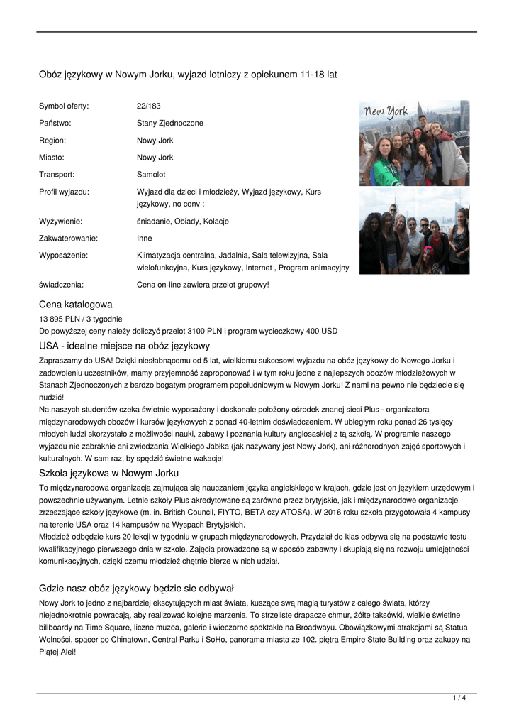 Obóz językowy w Nowym Jorku, wyjazd lotniczy z opiekunem 11-18 lat Symbol oferty: 22/183 Państwo: Stany Zjednoczone Region: Nowy Jork Miasto: Nowy Jork Transport: Samolot Profil wyjazdu: Wyjazd dla dzieci i młodzieży, Wyjazd językowy, Kurs Wyżywienie: śniadanie, Obiady, Kolacje Zakwaterowanie: Inne Wyposażenie: Klimatyzacja centralna, Jadalnia, Sala telewizyjna, Sala świadczenia: Cena on-line zawiera przelot grupowy! językowy, no conv : wielofunkcyjna, Kurs językowy, Internet , Program animacyjny Cena katalogowa 13 895 PLN / 3 tygodnie Do powyższej ceny należy doliczyć przelot 3100 PLN i program wycieczkowy 400 USD USA - idealne miejsce na obóz językowy Zapraszamy do USA! Dzięki niesłabnącemu od 5 lat, wielkiemu sukcesowi wyjazdu na obóz językowy do Nowego Jorku i zadowoleniu uczestników, mamy przyjemność zaproponować i w tym roku jedne z najlepszych obozów młodzieżowych w Stanach Zjednoczonych z bardzo bogatym programem popołudniowym w Nowym Jorku! Z nami na pewno nie będziecie się nudzić! Na naszych studentów czeka świetnie wyposażony i doskonale położony ośrodek znanej sieci Plus - organizatora międzynarodowych obozów i kursów językowych z ponad 40-letnim doświadczeniem. W ubiegłym roku ponad 26 tysięcy młodych ludzi skorzystało z możliwości nauki, zabawy i poznania kultury anglosaskiej z tą szkołą. W programie naszego wyjazdu nie zabraknie ani zwiedzania Wielkiego Jabłka (jak nazywany jest Nowy Jork), ani różnorodnych zajęć sportowych i kulturalnych. W sam raz, by spędzić świetne wakacje! Szkoła językowa w Nowym Jorku To międzynarodowa organizacja zajmująca się nauczaniem języka angielskiego w krajach, gdzie jest on językiem urzędowym i powszechnie używanym. Letnie szkoły Plus akredytowane są zarówno przez brytyjskie, jak i międzynarodowe organizacje zrzeszające szkoły językowe (m. in. British Council, FIYTO, BETA czy ATOSA). W 2016 roku szkoła przygotowała 4 kampusy na terenie USA oraz 14 kampusów na Wyspach Brytyjskich. Młodzież odbędzie kurs 20 lekcji w tygodniu w grupach międzynarodowych. Przydział do klas odbywa się na podstawie testu kwalifikacyjnego pierwszego dnia w szkole. Zajęcia prowadzone są w sposób zabawny i skupiają się na rozwoju umiejętności komunikacyjnych, dzięki czemu młodzież chętnie bierze w nich udział. Gdzie nasz obóz językowy będzie sie odbywał Nowy Jork to jedno z najbardziej ekscytujących miast świata, kuszące swą magią turystów z całego świata, którzy niejednokrotnie powracają, aby realizować kolejne marzenia. To strzeliste drapacze chmur, żółte taksówki, wielkie świetlne billboardy na Time Square, liczne muzea, galerie i wieczorne spektakle na Broadwayu. Obowiązkowymi atrakcjami są Statua Wolności, spacer po Chinatown, Central Parku i SoHo, panorama miasta ze 102. piętra Empire State Building oraz zakupy na Piątej Alei! 1/4 Kampus Rutherford Felician College, w którym mieści się szkoła, to typowy amerykański kampus studencki z budynkami z czerwonej cegły, położony w Rutherford w New Jersey zaledwie 20 minut jazdy autobusem od Manhattanu. Kampus posiada olbrzymi zielony teren, na którym znajduje się zakwaterowanie, sale do nauki oraz atrakcje sportowe, takie jak teren do siatkówki, sala sportowa. Na terenie kampusu znajduje się także zamek o historycznym znaczeniu! Położenie i organizacja kampusu daje pełnię bezpieczeństwa wypoczywającej tu młodzieży, a jednocześnie wiele możliwości spędzania czasu pozalekcyjnego. Pobliska przepiękna okolica odznacza się szpalerami drzew wzdłuż ulic, zadbanymi ogrodami, parkami i stylowymi fasadami domów i kamienic. W pobliżu znajdują się sklepy, restauracje i teatr. Ponadto na terenie kampusu jest bezpłatny dostęp do Wi-Fi, ośrodek dysponuje także wielofunkcyjnym centrum studenckim wykorzystywanym do popołudniowych i wieczornych animacji, kafeterią, pralnią (odpłatnie). Gdzie będziemy mieszkać podczas wyjazdu językowego Młodzież mieszka w klimatyzowanych apartamentach. Każdy posiada 2 pokoje 2-osobowe, w których znajduje się biurko, krzesła, szafa oraz łazienka. W pokojach dostępne jest Wi-Fi. Wyżywienie na obozie młodzieżowym 3 posiłki dziennie na kampusie, podczas wycieczek uczestnicy otrzymują prowiant. Dodatkowo 2-3 wspólne wieczorne wyjścia do restauracji, aby poznać nowojorską atmosferę np. do słynnego Hard Rock Café, czy zjeść kolację na Fifth Avenue! Jaki jest program dla dzieci i młodzieży poza lekcjami Program pozalekcyjny koncentruje się na głównych atrakcjach Nowego Jorku i okolic miasta, jak również bazy sportowo-rekreacyjnej kampusu. To jedyny taki program dla młodzieży w Nowym Jorku, który zawiera aż tyle atrakcji turystycznych, bowiem w programie jest aż 8 całodniowych wycieczek i 5 półdniowych! Zobaczymy Statuę Wolności wraz z wejściem do muzeum, Times Square, Top of the Rock, zjemy kolację w Hard Rock Café na Times Square, zrobimy zakupy na najsłynniejszej ulicy handlowej świata: Fifth Avenue, zwiedzimy Manhattan, Ground Zero oraz WTC Memorial, Wall Street, ponadto wjedziemy na Empire State Building, przejdziemy się po Brooklyn Bridge, Central Park & Strawberry Fields, Chinatown oraz będziemy bawić się też w fantastycznym parku rozrywki Six Flags z największymi kolejkami mrożącymi krew w żyłach! Nie może także zabraknąć meczu baseballowego i zakupów w Outletach. Gdy wrócimy z popołudniowych wycieczek, czekają na nas zajęcia sportowe i kulturalne. Wieczorami bawić się będziemy w czasie karaoke, wieczorów międzynarodowych, barbecue w stylu amerykańskim i na dyskotekach na kampusie. Jak lecimy na obóz językowy w Nowym Jorku Przelot grupowy z Warszawy z polskim opiekunem liniami lotniczym Air France/KLM z krótką przesiadką.Grupa ma zapewniony transfer z lotniska. Ubezpieczenie ATJ LINGWISTA gwarantuje Klientowi umowę ubezpieczeniową na okres wyjazdu: polisa SIGNAL IDUN
