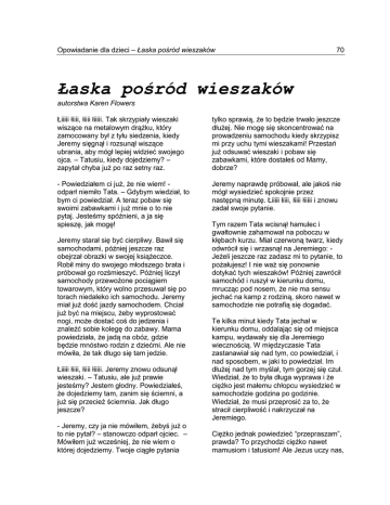Opowiadanie dla dzieci – Łaska pośród wieszaków 70 Łaska pośród wieszaków autorstwa Karen Flowers Łiiiii łiiii, łiiii łiiiii. Tak skrzypiały wieszaki wiszące na metalowym drążku, który zamocowany był z tyłu siedzenia, kiedy Jeremy sięgnął i rozsunął wiszące ubrania, aby mógł lepiej widzieć swojego ojca. – Tatusiu, kiedy dojedziemy? – zapytał chyba już po raz setny raz. tylko sprawią, że to będzie trwało jeszcze dłużej. Nie mogę się skoncentrować na prowadzeniu samochodu kiedy skrzypisz mi przy uchu tymi wieszakami! Przestań już odsuwać wieszaki i pobaw się zabawkami, które dostałeś od Mamy, dobrze? - Powiedziałem ci już, że nie wiem! odparł niemiło Tata. – Gdybym wiedział, to bym ci powiedział. A teraz pobaw się swoimi zabawkami i już mnie o to nie pytaj. Jesteśmy spóźnieni, a ja się spieszę, jak mogę! Jeremy naprawdę próbował, ale jakoś nie mógł wysiedzieć spokojnie przez następną minutę. Łiiiii łiiii, łiiii łiiiii i znowu zadał swoje pytanie. Jeremy starał się być cierpliwy. Bawił się samochodami, później jeszcze raz obejrzał obrazki w swojej książeczce. Robił miny do swojego młodszego brata i próbował go rozśmieszyć. Później liczył samochody przewożone pociągiem towarowym, który wolno przesuwał się po torach niedaleko ich samochodu. Jeremy miał już dość jazdy samochodem. Chciał już być na miejscu, żeby wyprostować nogi, może dostać coś do jedzenia i znaleźć sobie kolegę do zabawy. Mama powiedziała, że jadą na obóz, gdzie będzie mnóstwo rodzin z dziećmi. Ale nie mówiła, że tak długo się tam jedzie. Łiiiii łiiii, łiiii łiiiii. Jeremy znowu odsunął wieszaki. – Tatusiu, ale już prawie jesteśmy? Jestem głodny. Powiedziałeś, że dojedziemy tam, zanim się ściemni, a już się przecież ściemnia. Jak długo jeszcze? - Jeremy, czy ja nie mówiłem, żebyś już o to nie pytał? – stanowczo odparł ojciec. – Mówiłem już wcześniej, że nie wiem o której dojedziemy. Twoje ciągłe pytania Tym razem Tata wcisnął hamulec i gwałtownie zahamował na poboczu w kłębach kurzu. Miał czerwoną twarz, kiedy odwrócił się i wrzasnął na Jeremiego: Jeżeli jeszcze raz zadasz mi to pytanie, to pożałujesz! I nie waż się ponownie dotykać tych wieszaków! Później zawrócił samochód i ruszył w kierunku domu, mrucząc pod nosem, że nie ma sensu jechać na kamp z rodziną, skoro nawet w samochodzie nie potrafią się dogadać. Te kilka minut kiedy Tata jechał w kierunku domu, oddalając się od miejsca kampu, wydawały się dla Jeremiego wiecznością. W międzyczasie Tata zastanawiał się nad tym, co powiedział, i nad sposobem, w jaki to powiedział. Im dłużej nad tym myślał, tym gorzej się czuł. Wiedział, że to była długa wyprawa i że ciężko jest małemu chłopcu wysiedzieć w samochodzie godzina po godzinie. Wiedział, że musi przeprosić za to, że stracił cierpliwość i nakrzyczał na Jeremiego. Ciężko jednak powiedzieć “przepraszam”, prawda? To przychodzi ciężko nawet mamusiom i tatusiom! Ale Jezus uczy nas, Children’s Story – Coat-Hanger Grace żebyśmy mówili “przepraszam”, kiedy powiedzieliśmy, lub zrobiliśmy coś, co zraniło drugą osobę. Dopóki tego nie zrobimy, to zostanie coś pomiędzy nami, co nie pozwoli nam się w pełni cieszyć sobą nawzajem, tak jak chciał tego Bóg. Powiedzenie “przepraszam” to Boży sposób, aby dać nam szansę i następnym razem lepiej się traktować. Nie trwało to długo, zanim tata Jeremiego ponownie zatrzymał samochód na poboczu. Tym razem wysiadł z samochodu i mocno przytulił Jeremiego. – Przepraszam, że na ciebie nakrzyczałem Jeremi – powiedział Tata. – Naprawdę ładnie się bawiłeś zabawkami. Nie wiedziałem, że podróż tak długo potrwa. 71 Jeremiemu spodobał się mocny uścisk Tatusia. Schował swoją twarz w jego ramieniu i objął go jeszcze mocniej mówiąc: - Nie ma sprawy Tato. Kocham cię! Czy możemy się pobawić piłką tutaj na trawie przez chwilę, zanim całkiem się ściemni? - Pewnie, że możemy – uśmiechnął się Tata, kiedy Jeremi wydobył piłkę z samochodu i rzucił ją do Taty. Ta historia zdarzyła się bardzo dawno temu. Jeremi jest już teraz dorosły, a jego Tata bardzo się postarzał. Ale wiecie co? Ani Tata, ani Jeremi, nigdy nie zapomnieli wieszaków, ani uścisku, ani tej niewielkiej łąki przy drodze, na której grali w piłkę. Tak dobrze pamięta się łaskę.