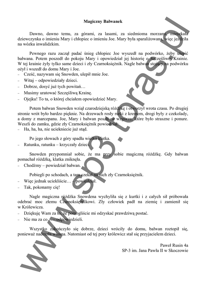 ora s.p l Magiczny Ba wanek Dawno, dawno temu, za górami, za lasami, za siedmioma morzami, mieszka a dziewczynka o imieniu Mary i ch opiec o imieniu Joe. Mary by a sparali owana, wi c je dzi a na wózku inwalidzkim. Pewnego razu zacz pada nieg ch opiec Joe wyszed na podwórko, eby ulepi ba wana. Potem poszed do pokoju Mary i opowiedzia jej histori o Szcz liwej Krainie. W tej krainie y tylko same dzieci i z y Czarnoksi nik. Nagle ba wan stoj cy na podwórku i wszed do domu Mary i Joe. Cze , nazywam si Snowden, ulepi mnie Joe. Witaj – odpowiedzia y dzieci. Dobrze, dosy ju tych powita … Musimy uratowa Szcz liw Krain . Ojejku! To ta, o której chcia em opowiedzie Mary. 3.t Potem ba wan Snowden wzi czarodziejsk ró i otworzy wrota czasu. Po drugiej stronie wrót by o bardzo pi knie. Na drzewach ros y rurki z kremem, drogi by y z czekolady, a domy z marcepanu. Joe, Mary i ba wan poszli na wzgórze, które by o straszne i ponure. Weszli do zamku, gdzie z y Czarnoksi nik powiedzia : Ha, ha, ha, nie uciekniecie ju st d. Po jego s owach z góry spad a wielka klatka. Ratunku, ratunku – krzycza y dzieci. e ma przy sobie magiczn ró . Gdy ba wan w. sp Snowden przypomnia sobie, pomacha ró , klatka znikn a. Chod my – powiedzia ba wan. Pobiegli po schodach, a tam czeka na nich z y Czarnoksi nik. Wi c jednak uciekli cie… – powiedzia . Tak, pokonamy ci ! Nagle magiczna ró ka Snowdena wychyli a si z kurtki i z ca ych si próbowa a odebra moc z emu Czarnoksi nikowi. Z y cz owiek pad na ziemi i zamieni si w Królewicza. Dzi kuj Wam za to, e pomogli cie mi odzyska prawdziw posta . Nie ma za co… – odpowiedzieli. ww Wszystko zako czy o si dobrze, dzieci wróci y do domu, ba wan roztopi si , poniewa nadesz a wiosna. Natomiast od tej pory królewicz sta si przyjacielem dzieci. Pawe Rusin 4a SP-3 im. Jana Paw a II w Skoczowie